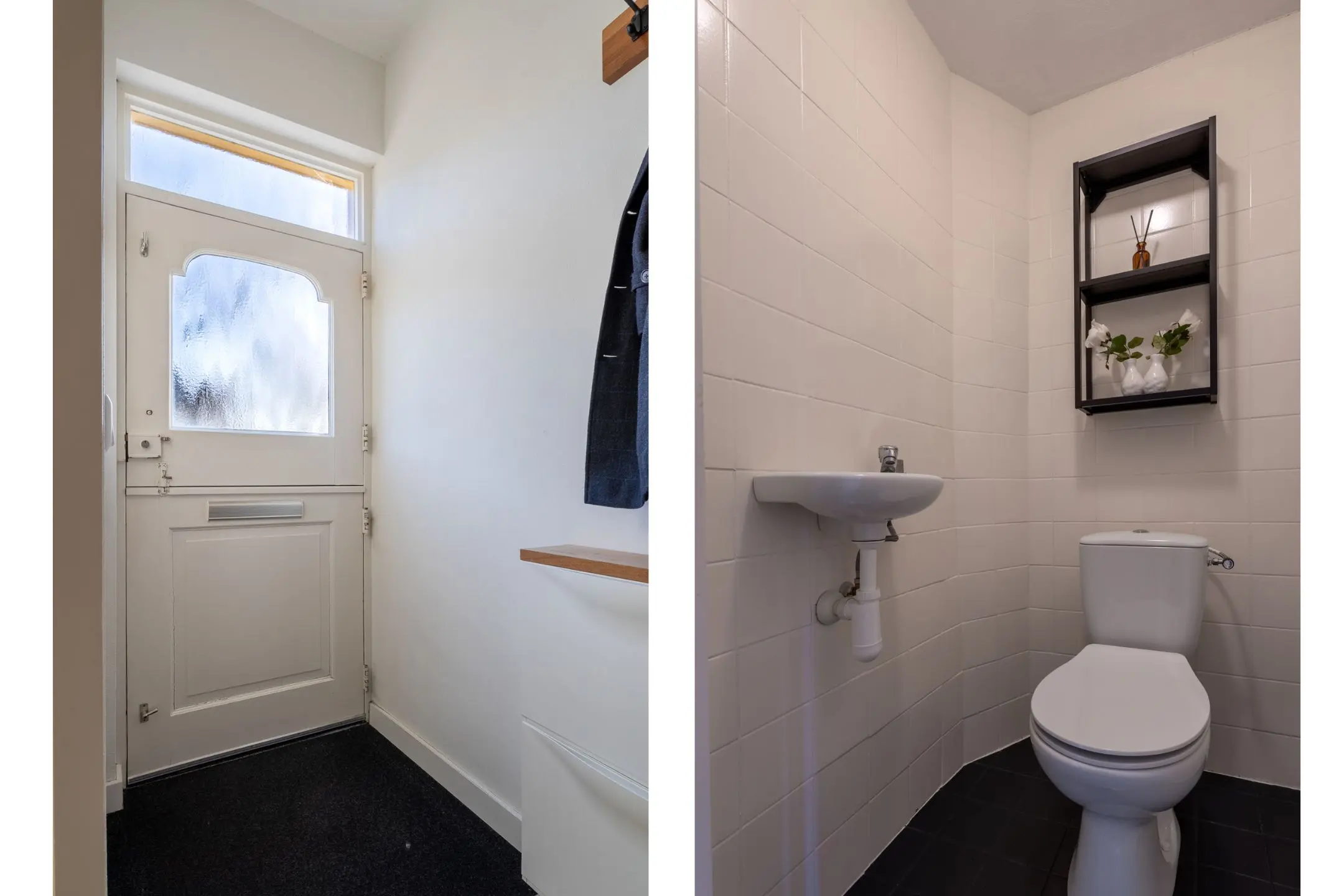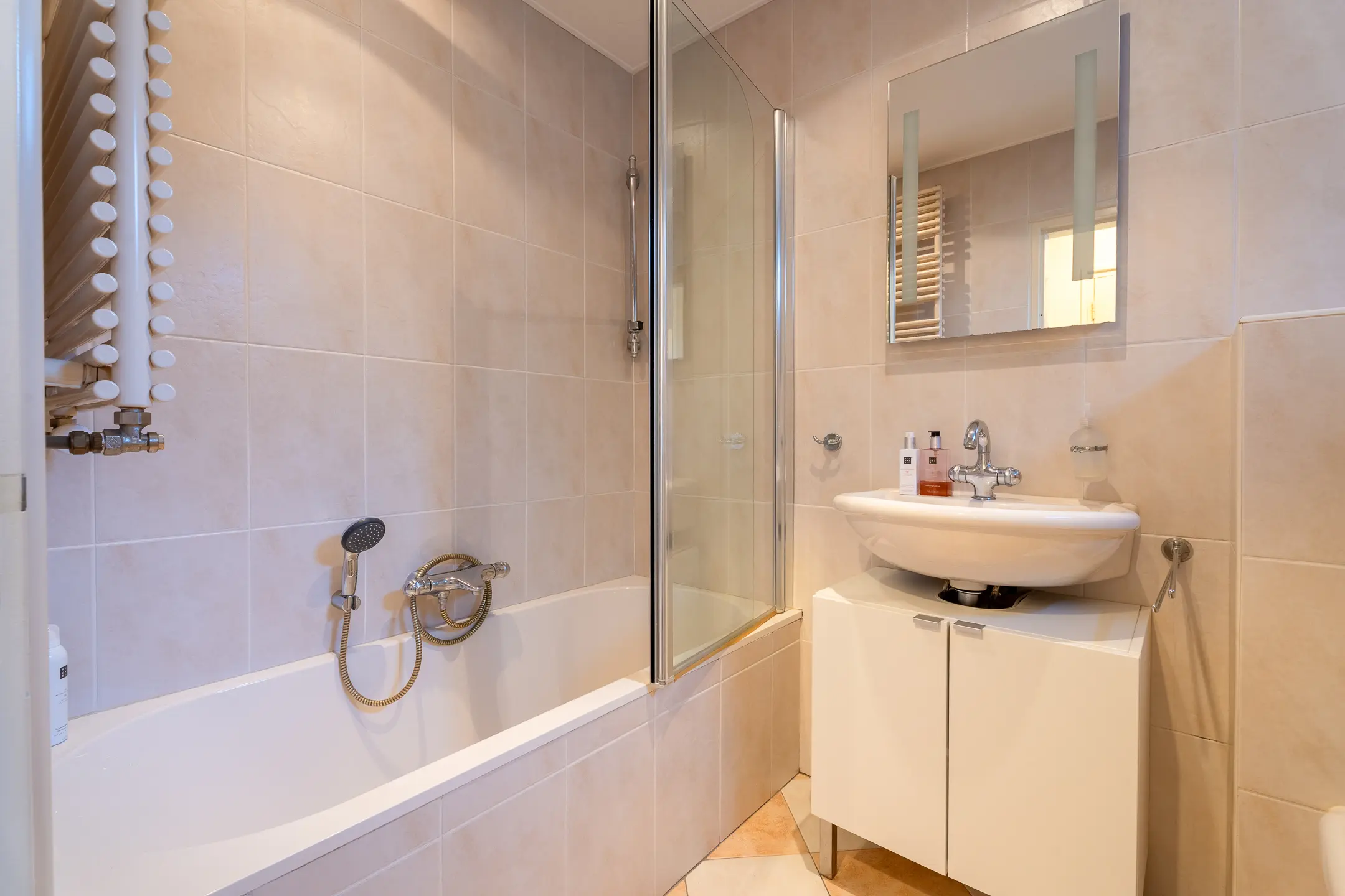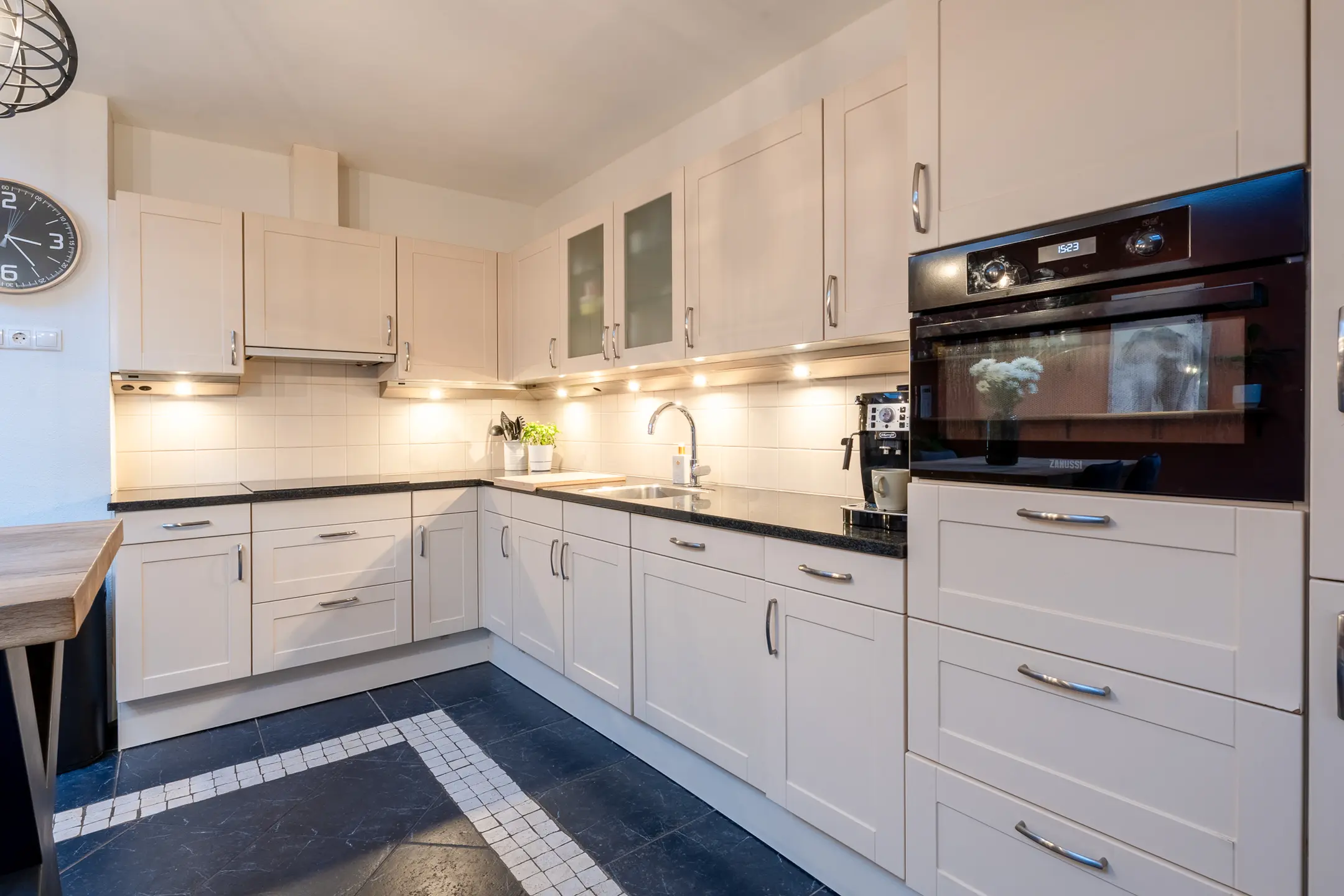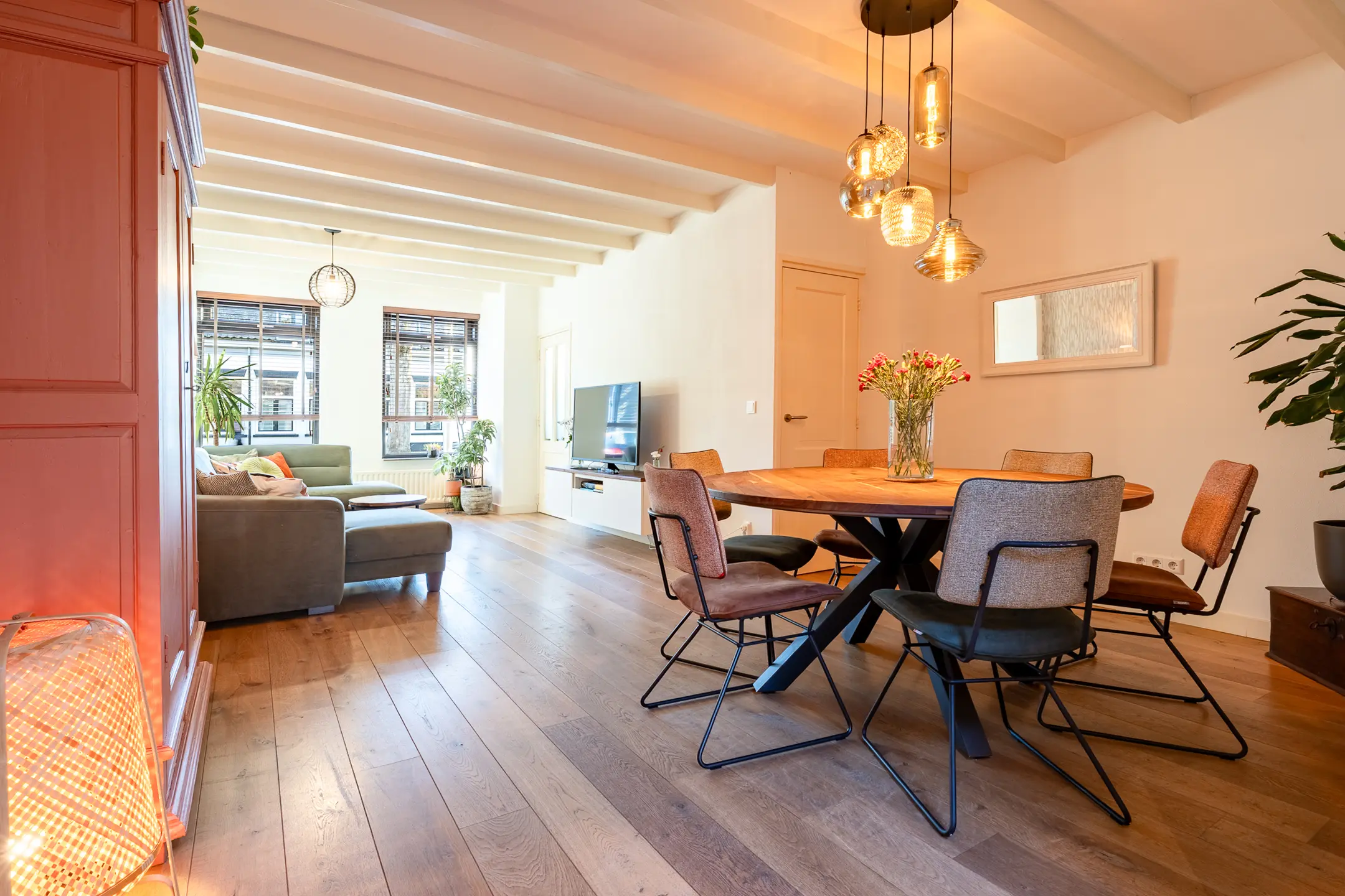 Entree met hal, trapopgang en toegang tot de woonkamer. De woonkamer is behaaglijk en sfeervol, ingesloten tussen het licht van de voorgevel en de woonkeuken met tuindeuren en lichtkoepels aan de achterzijde. Een rustige plek om ’s avonds lekker tv te kijken of aan tafel te dineren met familie en vrienden. De fraaie houten vloer en het sfeervolle balkenplafond maken het geheel compleet. De woonkeuken ligt aan de achterzijde en is tuingericht: een lichte, vriendelijke ruimte met tegelvloer, stucwerk en een complete, ruime hoekkeuken. De keuken is van alle gemakken voorzien: veel werkblad (natuursteen), volop kastruimte en inbouwapparatuur, zoals inductiekookplaat, afzuigkap, vaatwasser, koelkast, vriezer en combi-oven. Aansluitend tref je de bijkeuken met opstelling voor wasmachine en droger en doorloop naar de achtertuin of de eerste badkamer. De badkamer is volledig betegeld en voorzien van een ligbad-douchecombinatie, wastafel met meubel en toilet.