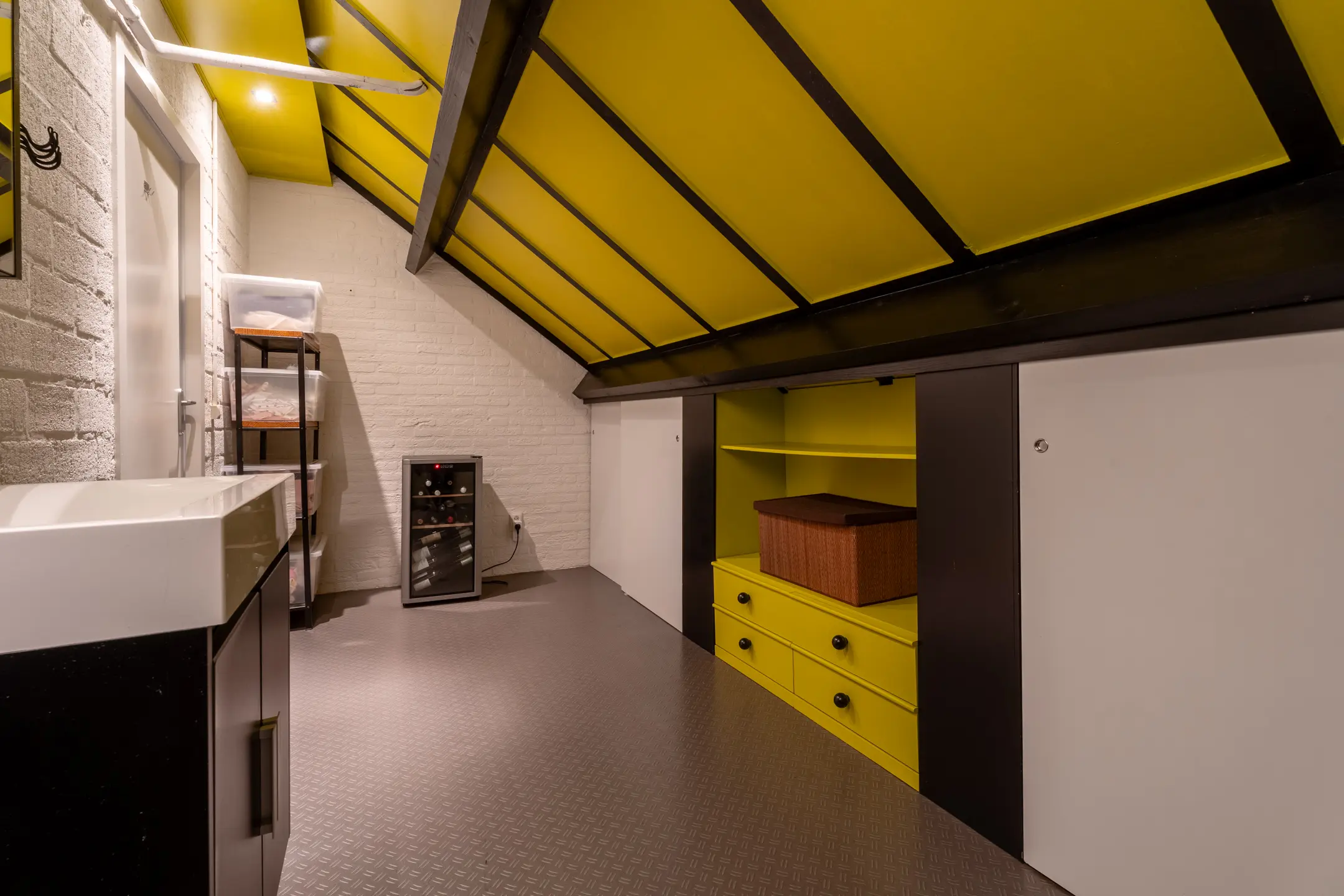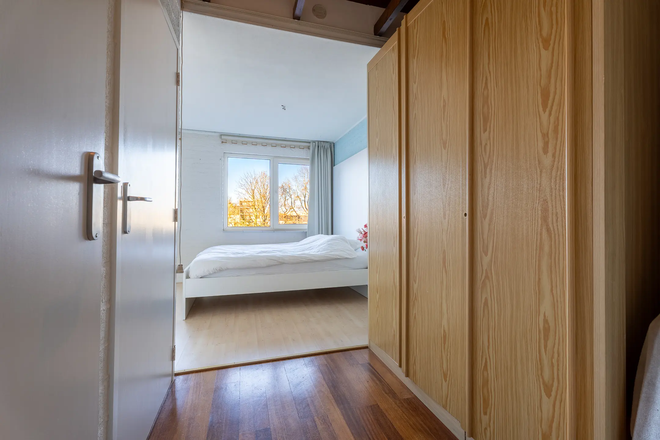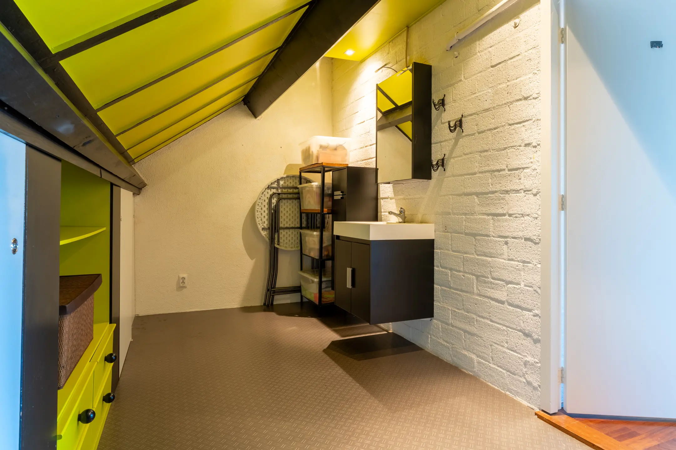 Via de hardhouten trap bereik je de volwaardige tweede verdieping. Je komt eerst op een overloop met toegang tot de cv-ruimte (opstelling ketel uit 2015 en zonneboiler). Deze verdieping is ingedeeld in een vierde slaapkamer aan de achterzijde en een grote bergruimte aan de voorzijde. De slaapkamer is ongeveer 14 m² groot dankzij de geheel opgetrokken achtergevel. De bergruimte aan de voorzijde is eigenlijk een kamer op zich, circa 11 m², met vaste kasten en een wastafel met meubel, voorzien van warm en koud water. Boven de overloop is nog een vliering voor koffers en kerstballen.