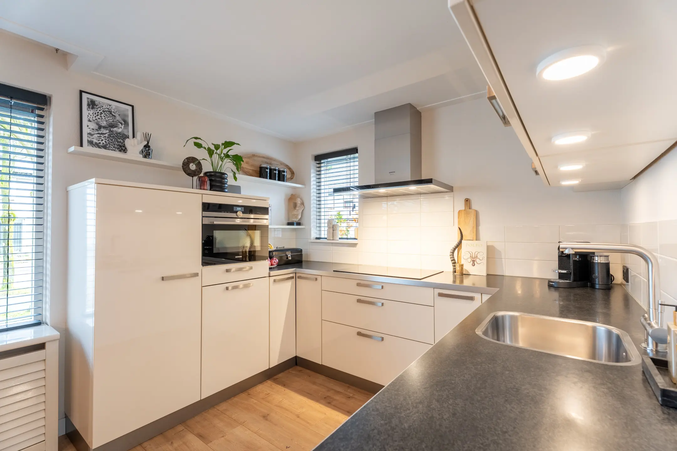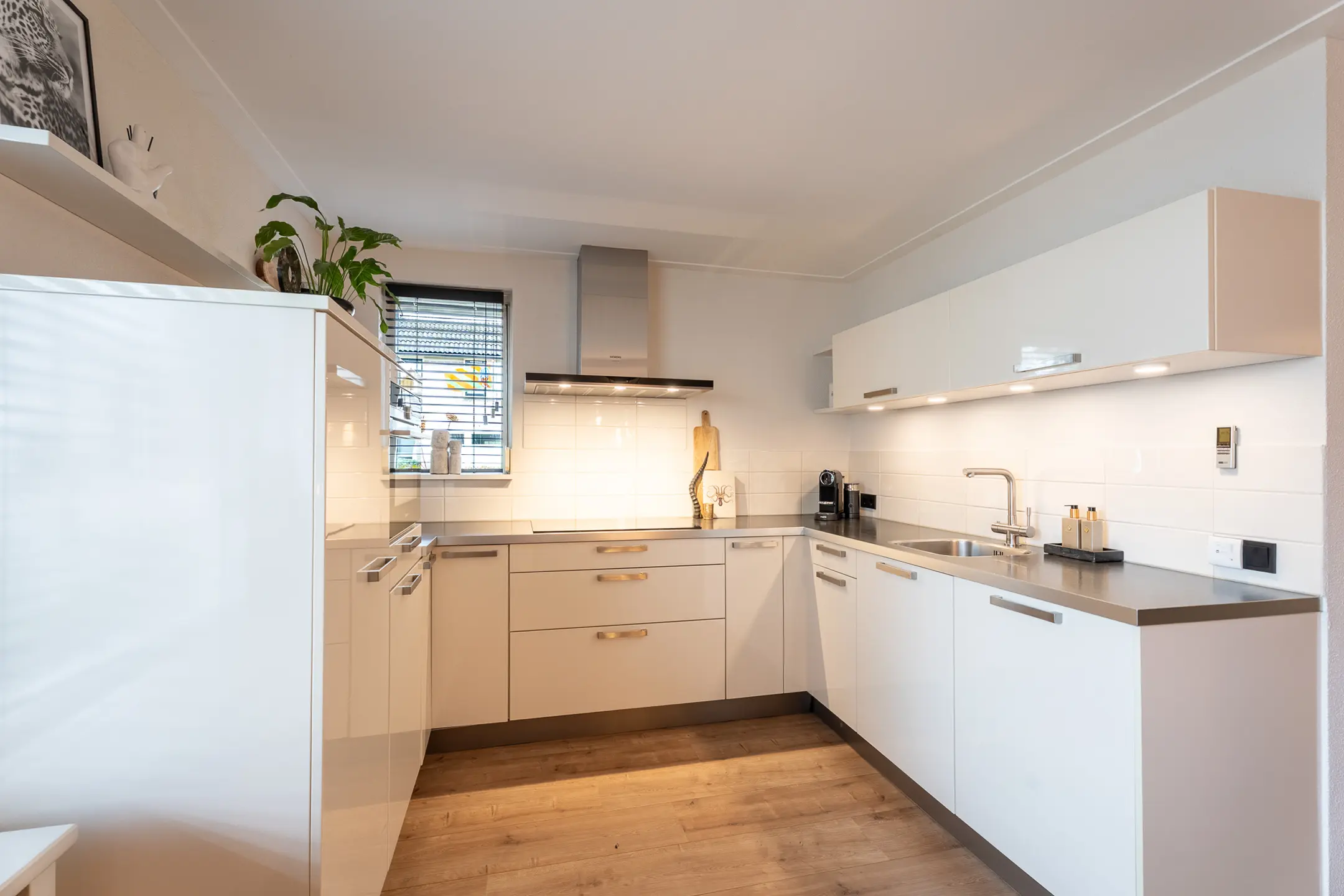 De keuken met eethoek is aan de voorzijde van de woning gesitueerd. De lichte, moderne keuken in een U-opstelling heeft veel werkruimte en is ingericht met diverse kasten, lades en A-klasse inbouwapparatuur, zoals: een inductiekookplaat (2020), een afzuigkap (2022), een vaatwasmachine (2022), een combi-oven en een koelkast (2021).