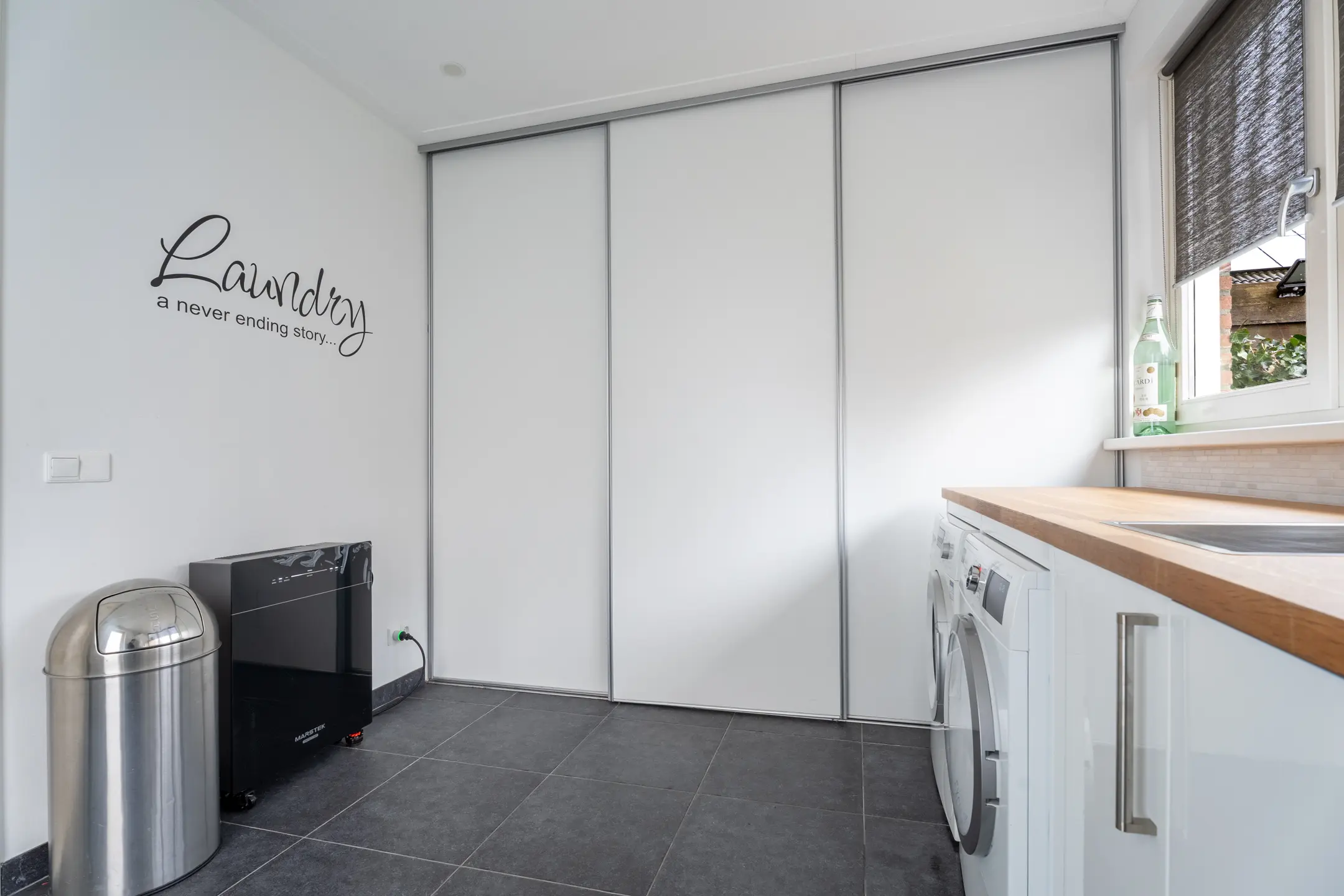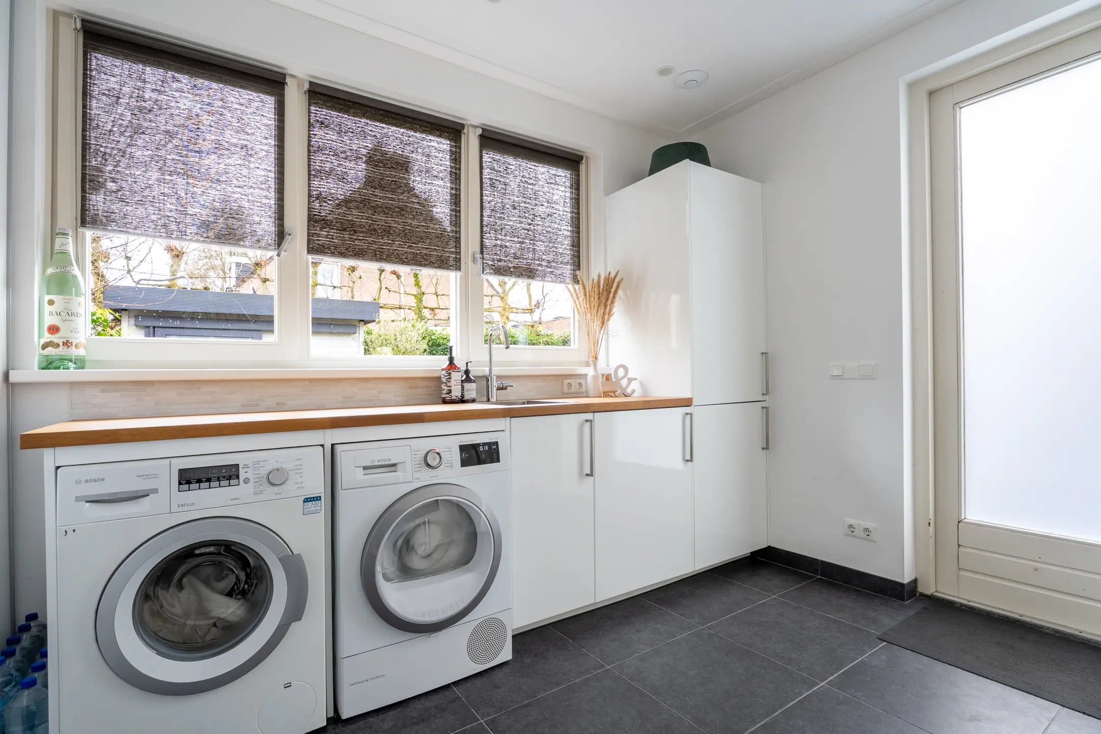 De bijkeuken is in 2010 samen met de garage gebouwd. Een super praktische en fijne ruimte met daglicht, een grote kastenwand en een groot werkblad met daaronder diverse kastjes, een spoelbak en de aansluiting ten behoeve van wasapparatuur. In het blok heb je ook een vrieskast en een extra koelkast. Vanuit de bijkeuken is er ook toegang naar de achtertuin.
