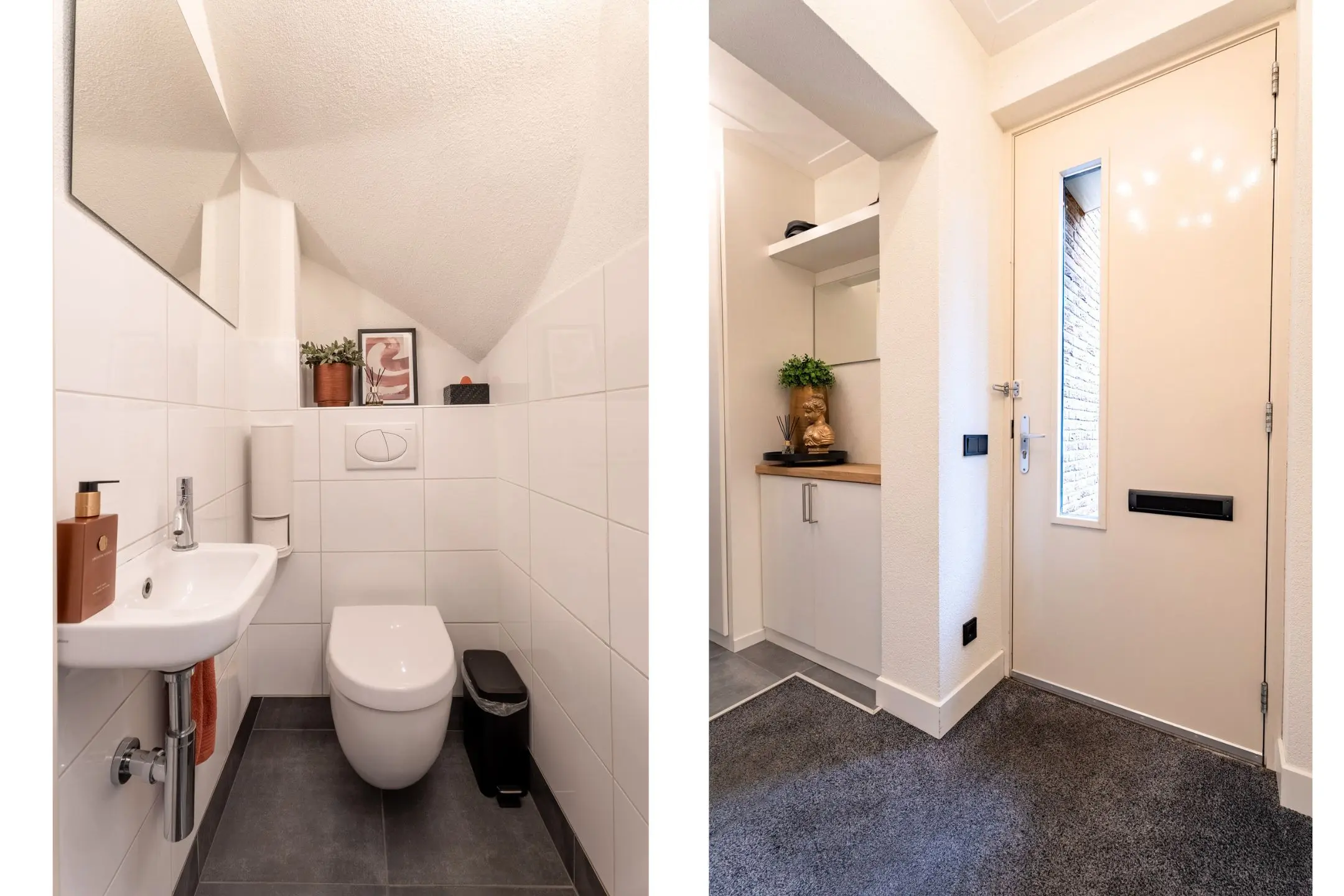 Via de eigen oprit kom je, door de entree, in de vergrote hal van de woning. Vanuit de hal heb je toegang tot de woonkamer, de garage en is er de trap naar de eerste verdieping. In de hal vind je de meterkast, een bergkast, ruimte voor je garderobe en de betegelde toiletruimte met zwevend toilet en een fonteintje.
