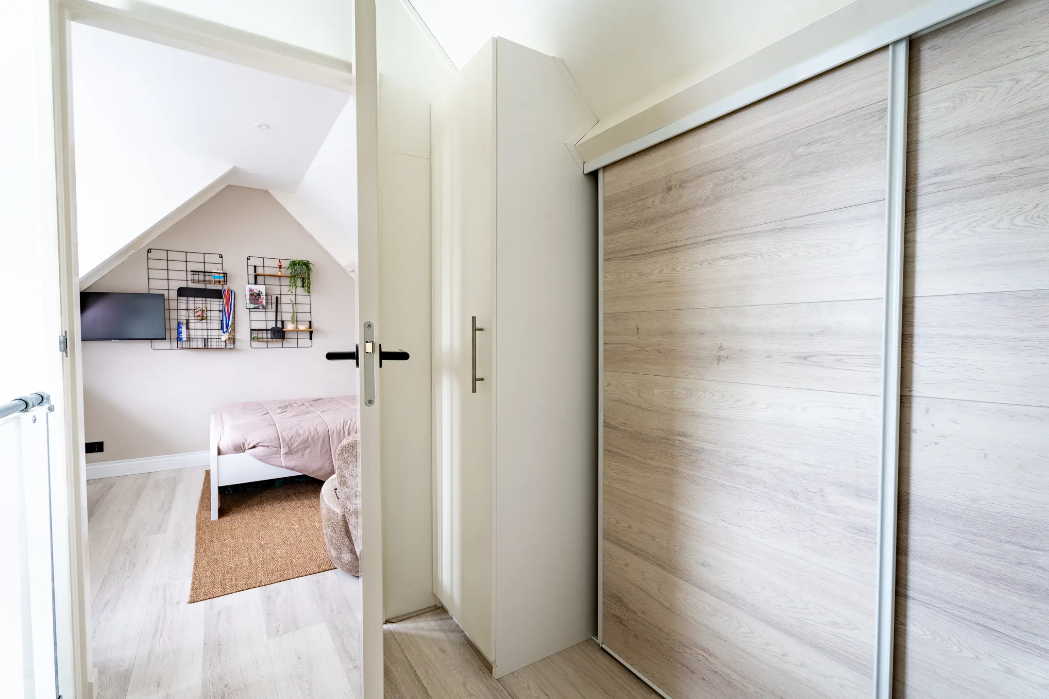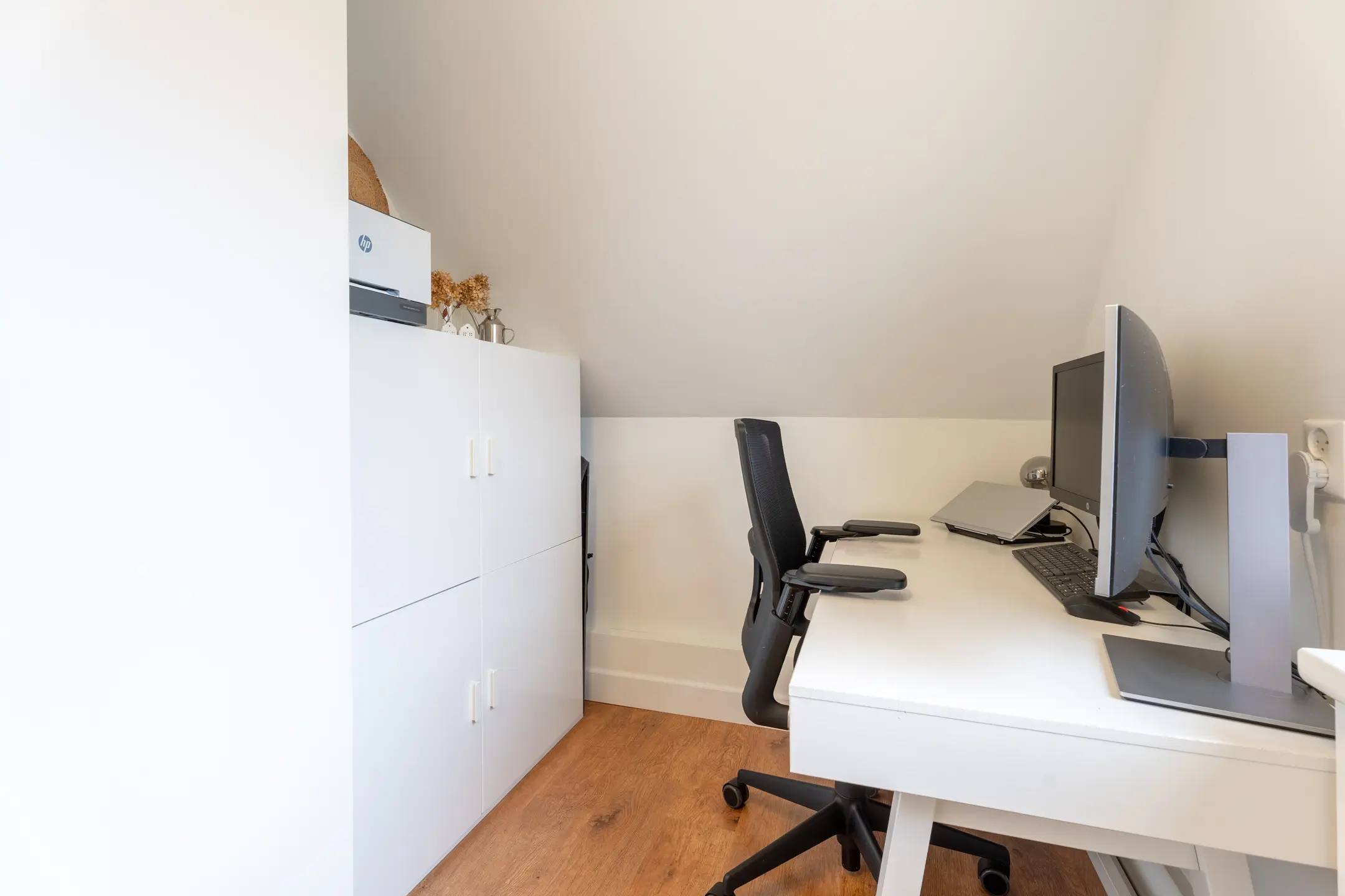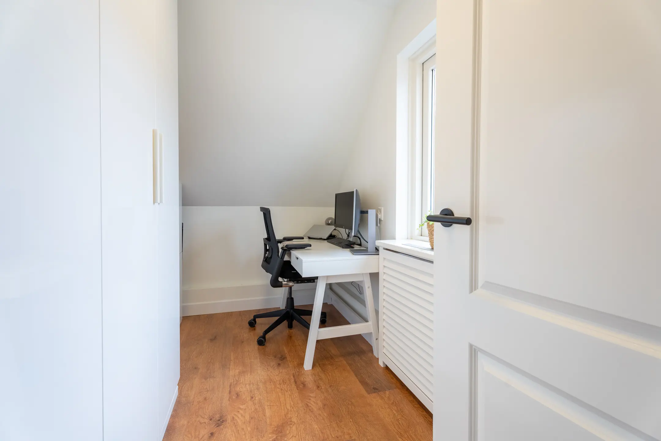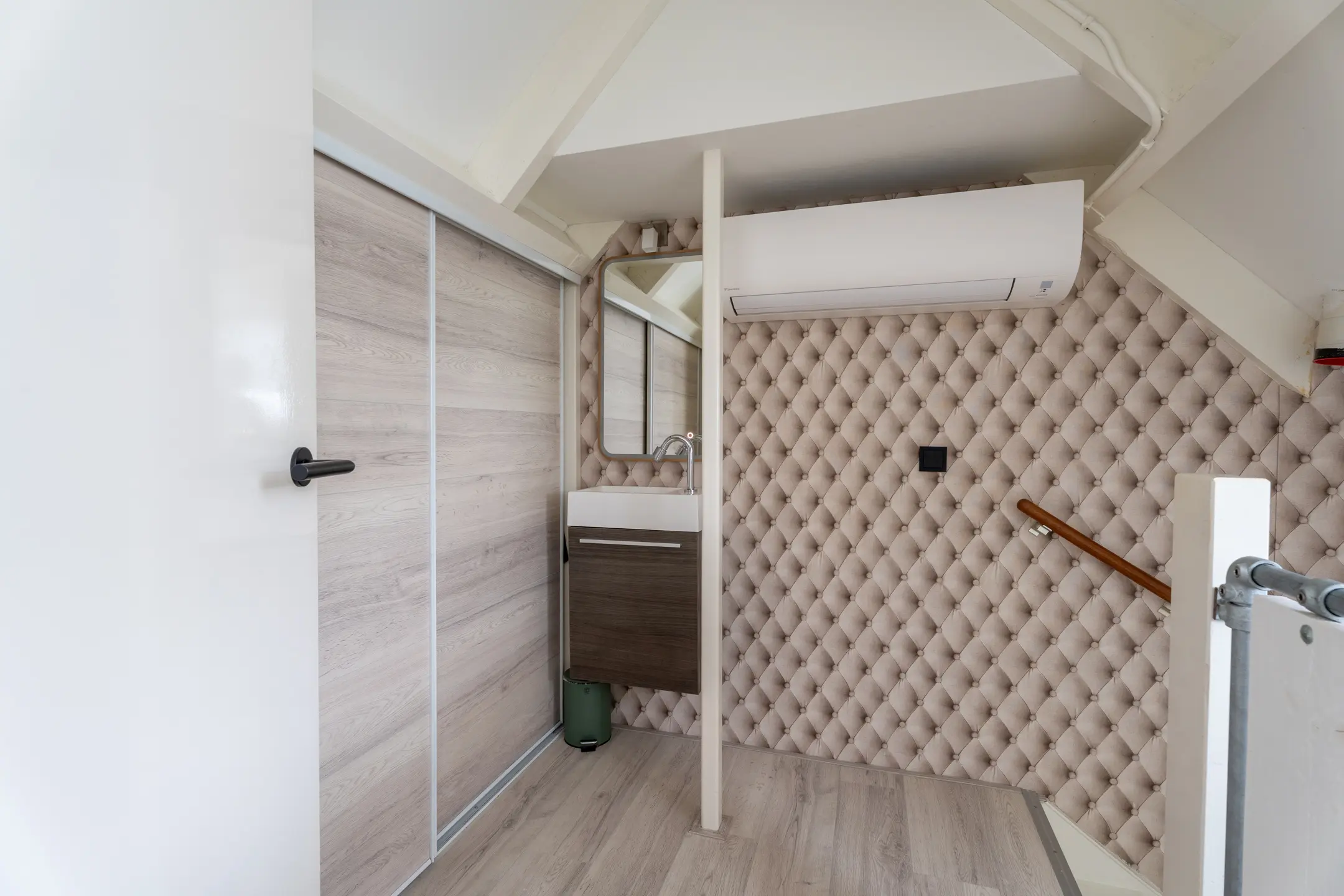 Op de tweede verdieping bevinden zich de overloop en de vierde slaapkamer. Op de overloop met dakkapel is er niet alleen volop praktische bergruimte, maar ook een badmeubel met wastafeltje en een opstelling van een airco. De airco kan zowel koelen als verwarmen.