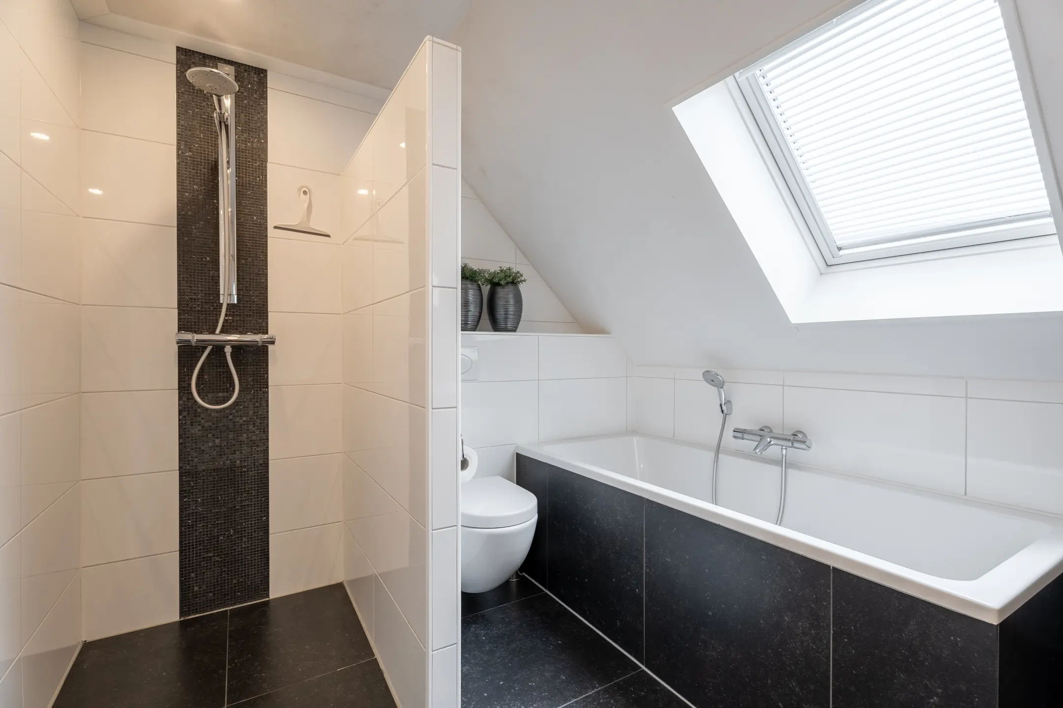 Luxe, geheel betegelde badkamer ingericht met een ligbad, inloopdouche, zwevend toilet en een badmeubel met twee wastafels. Ook in de badkamer eenzelfde dakraam als in de naastgelegen slaapkamer.