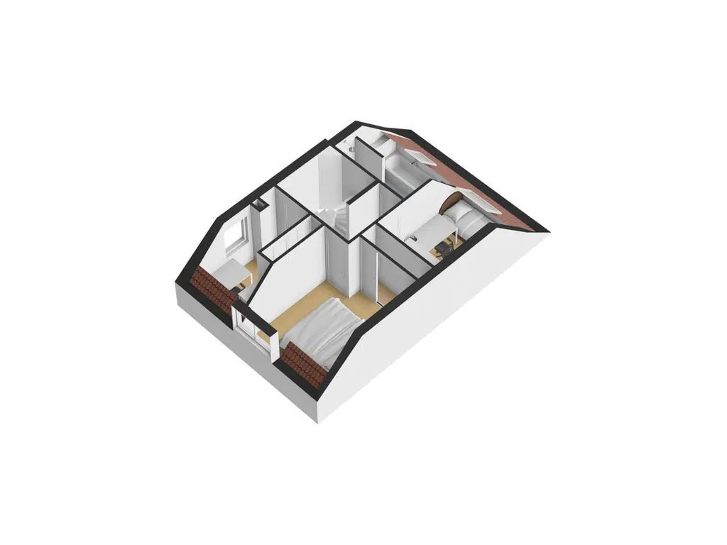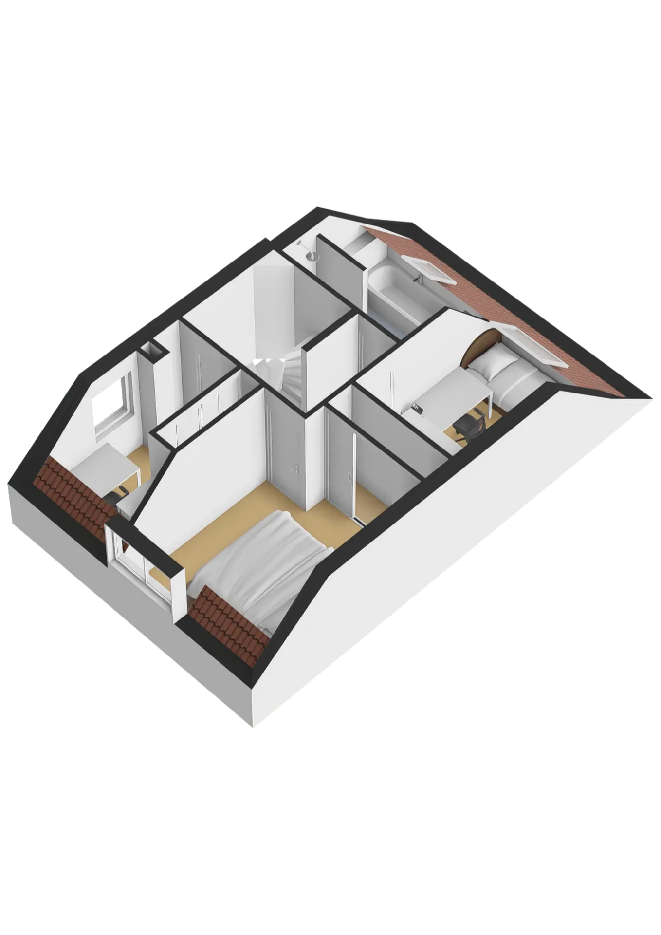 Op de eerste verdieping bevinden zich de overloop, drie slaapkamers en de badkamer.