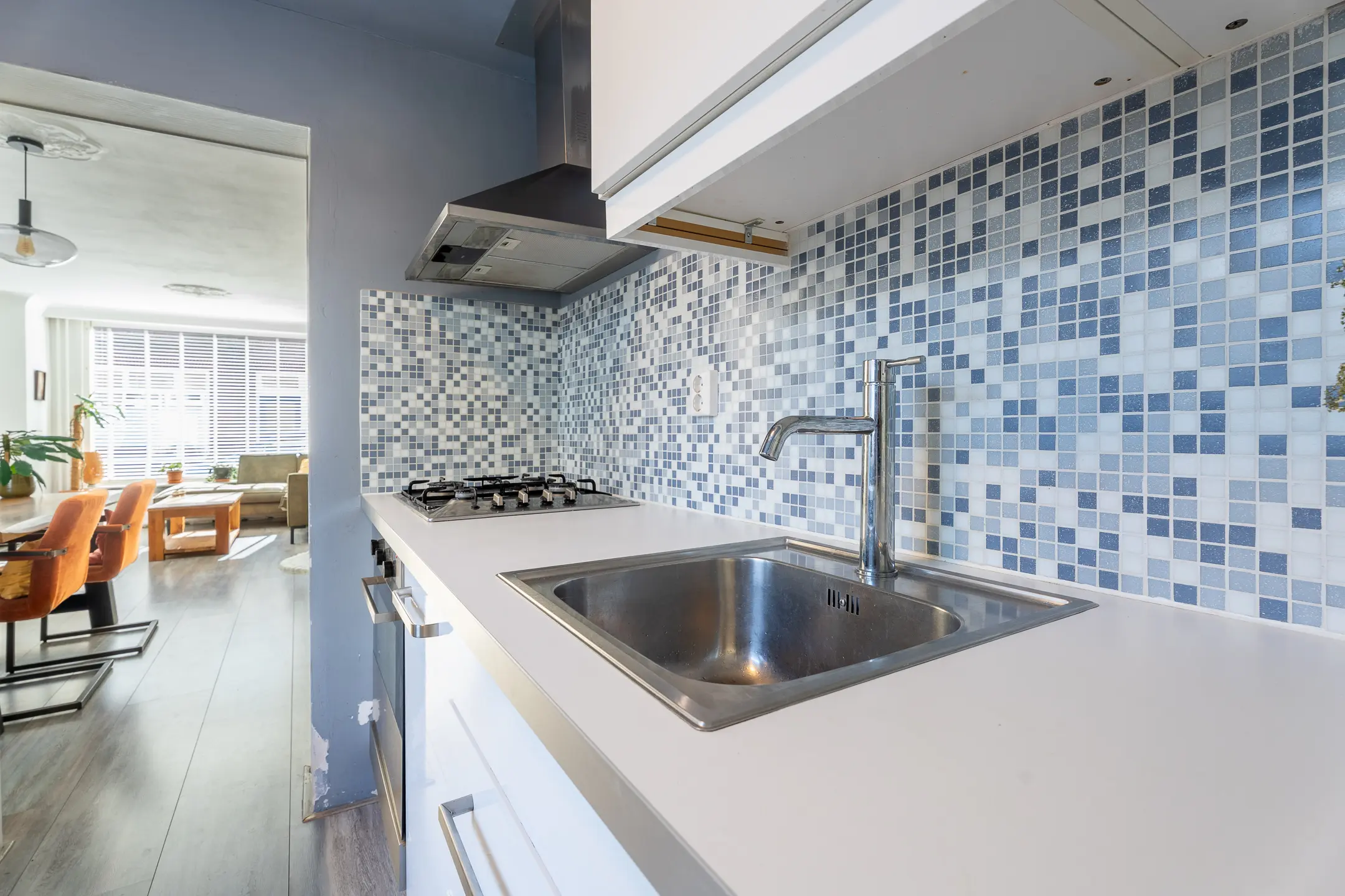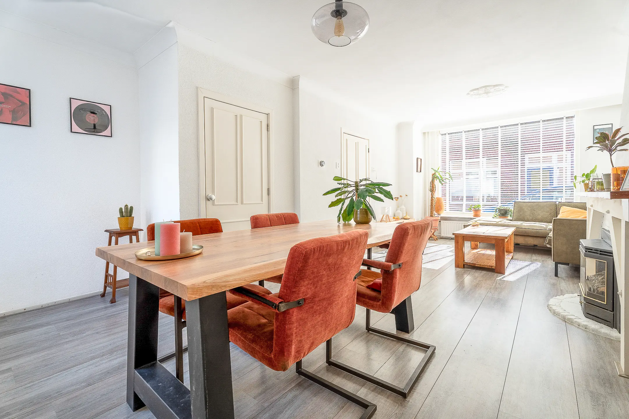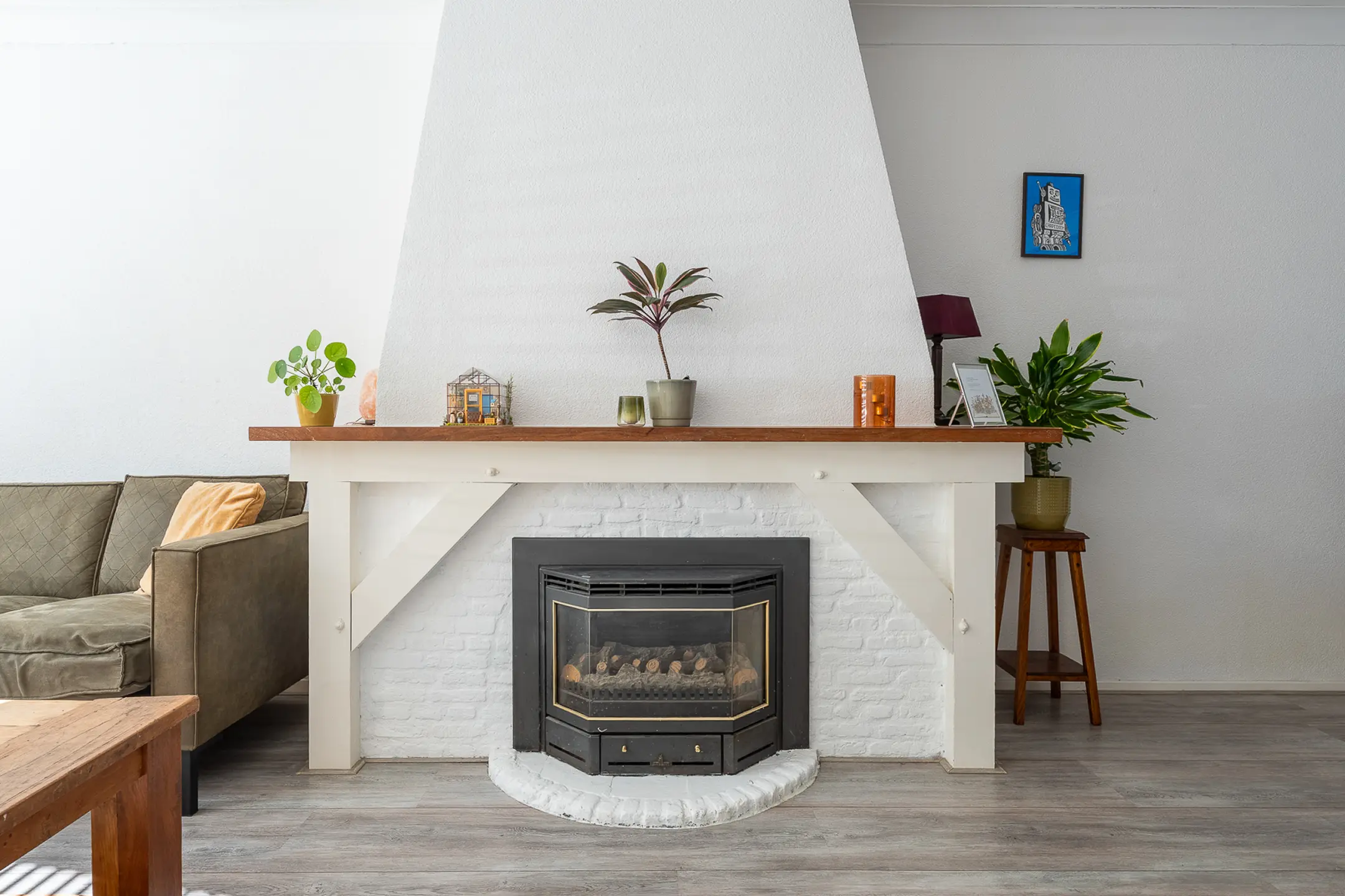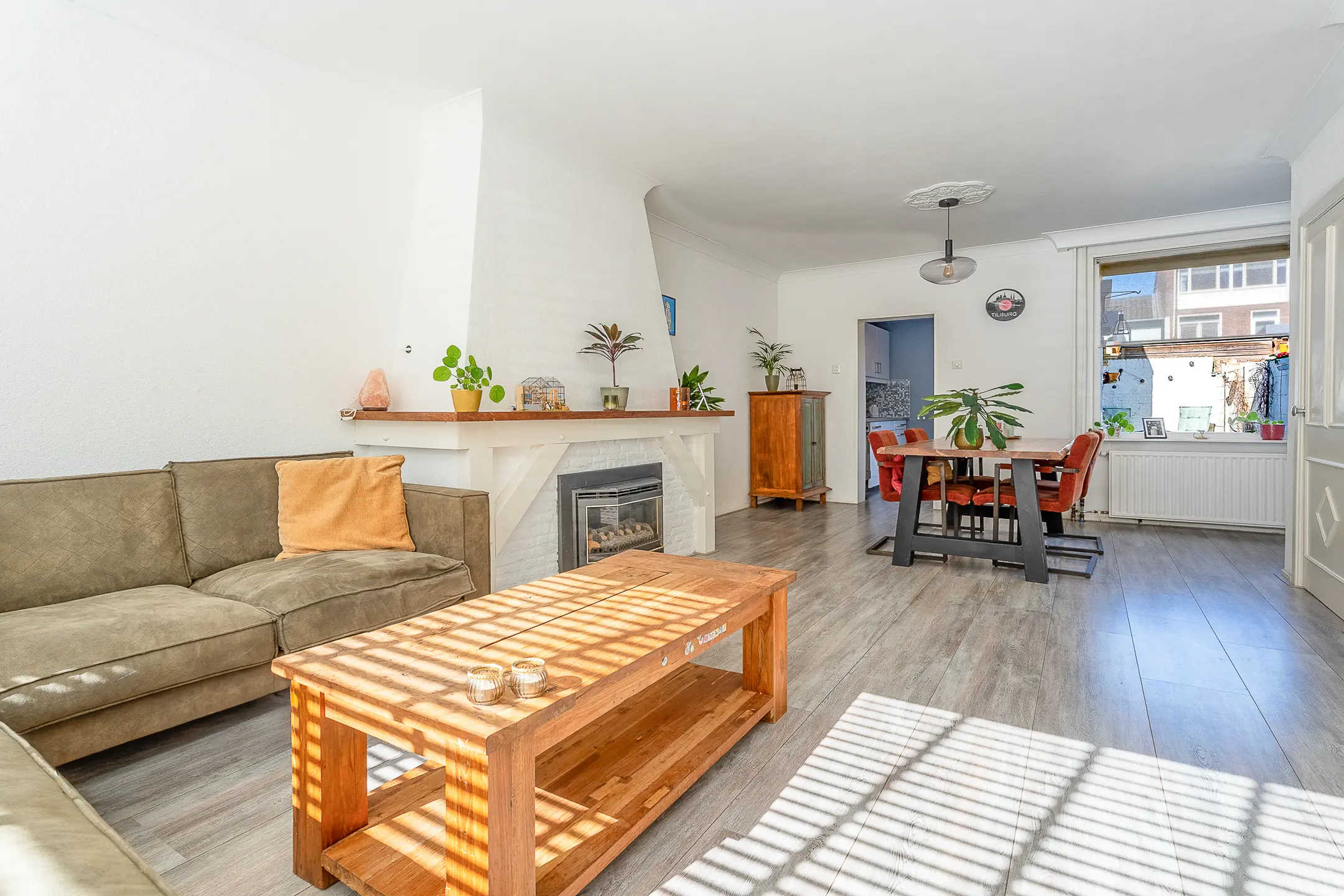 De woonkamer is een warme en sfeervolle leefruimte, voorzien van een schouw met gashaard. De lichte laminaatvloer en praktische trapkast maken het geheel compleet. Vanuit hier loop je door naar de keuken.