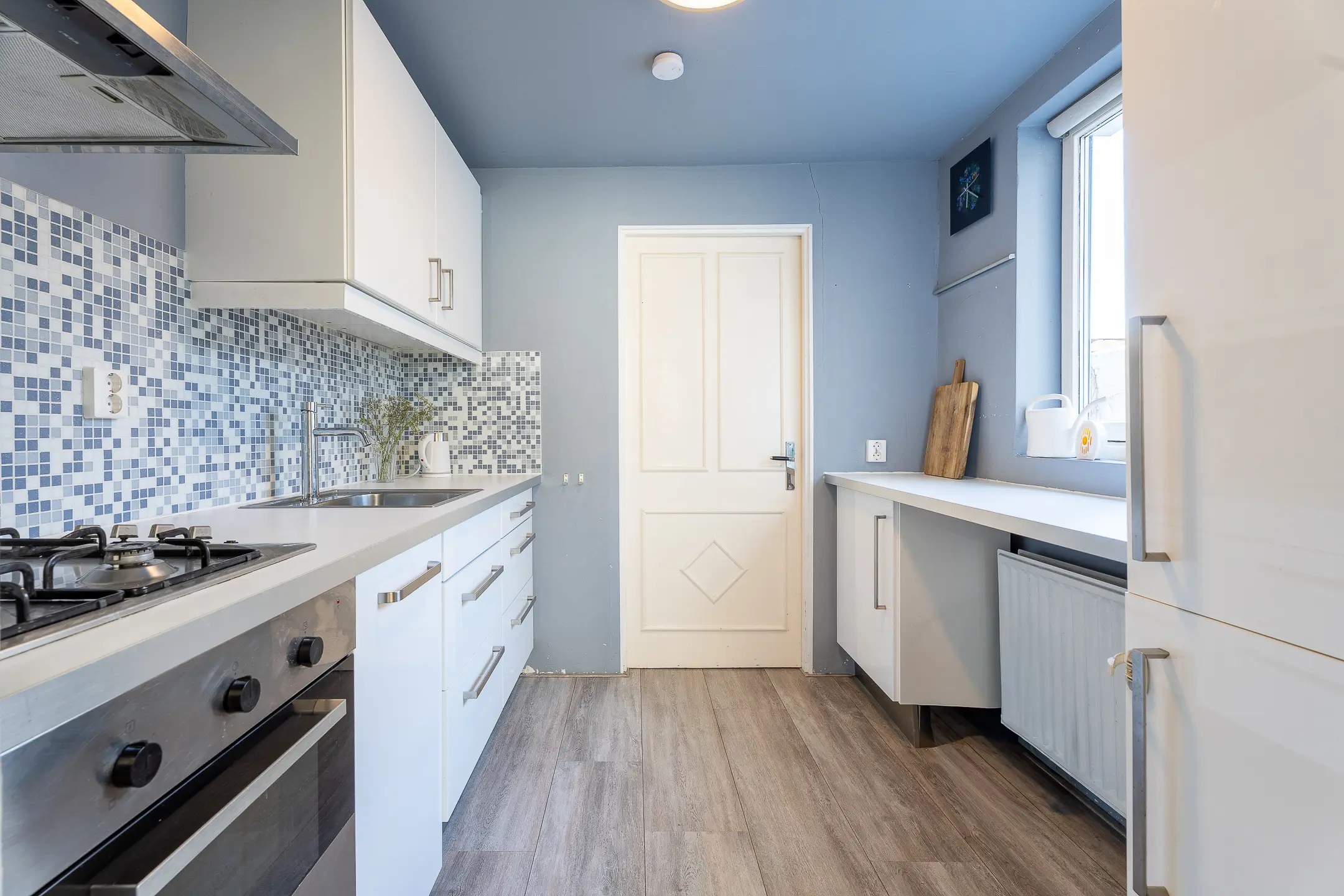 De nette keuken is uitgerust met diverse kastjes en inbouwapparatuur, waaronder een 4-pits gasfornuis, oven, afzuigkap en vaatwasser.