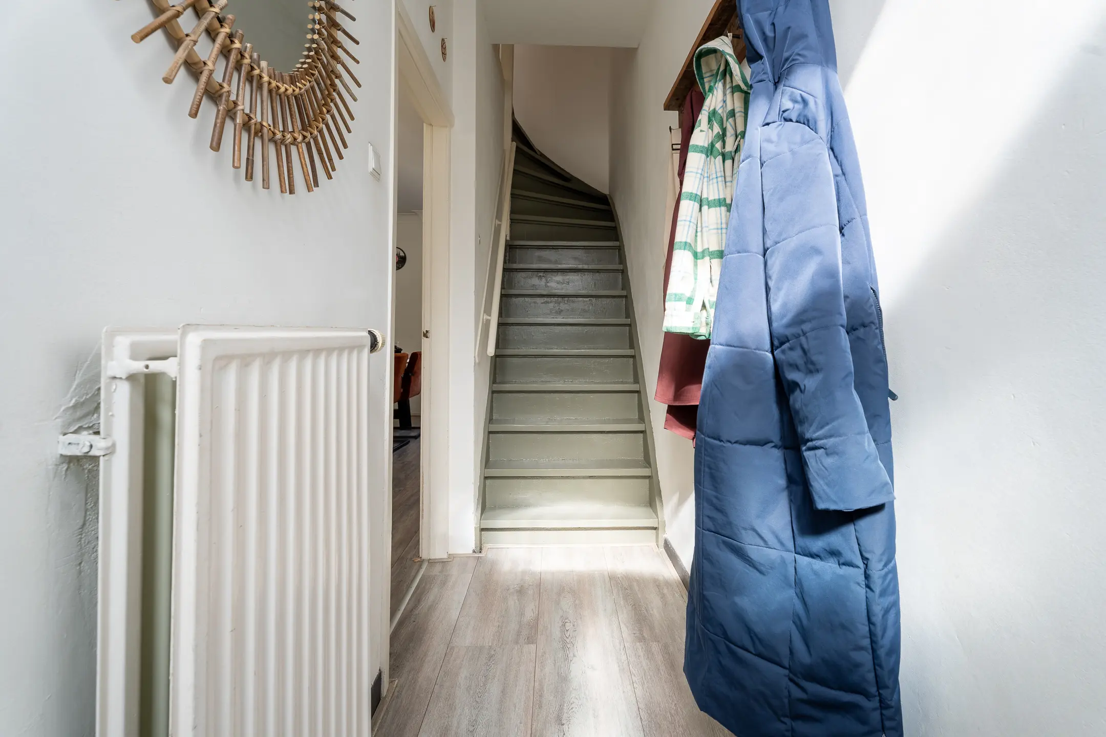 Je komt binnen in de hal met meterkast en toegang tot zowel de woonkamer als de eerste verdieping.