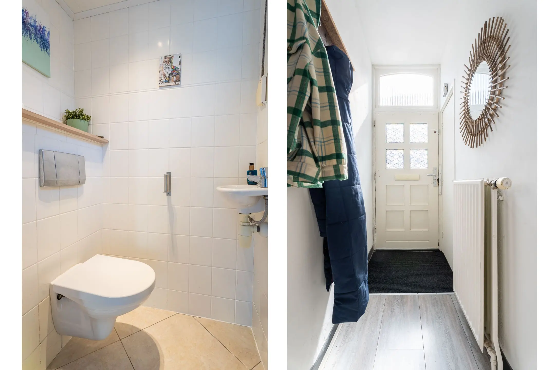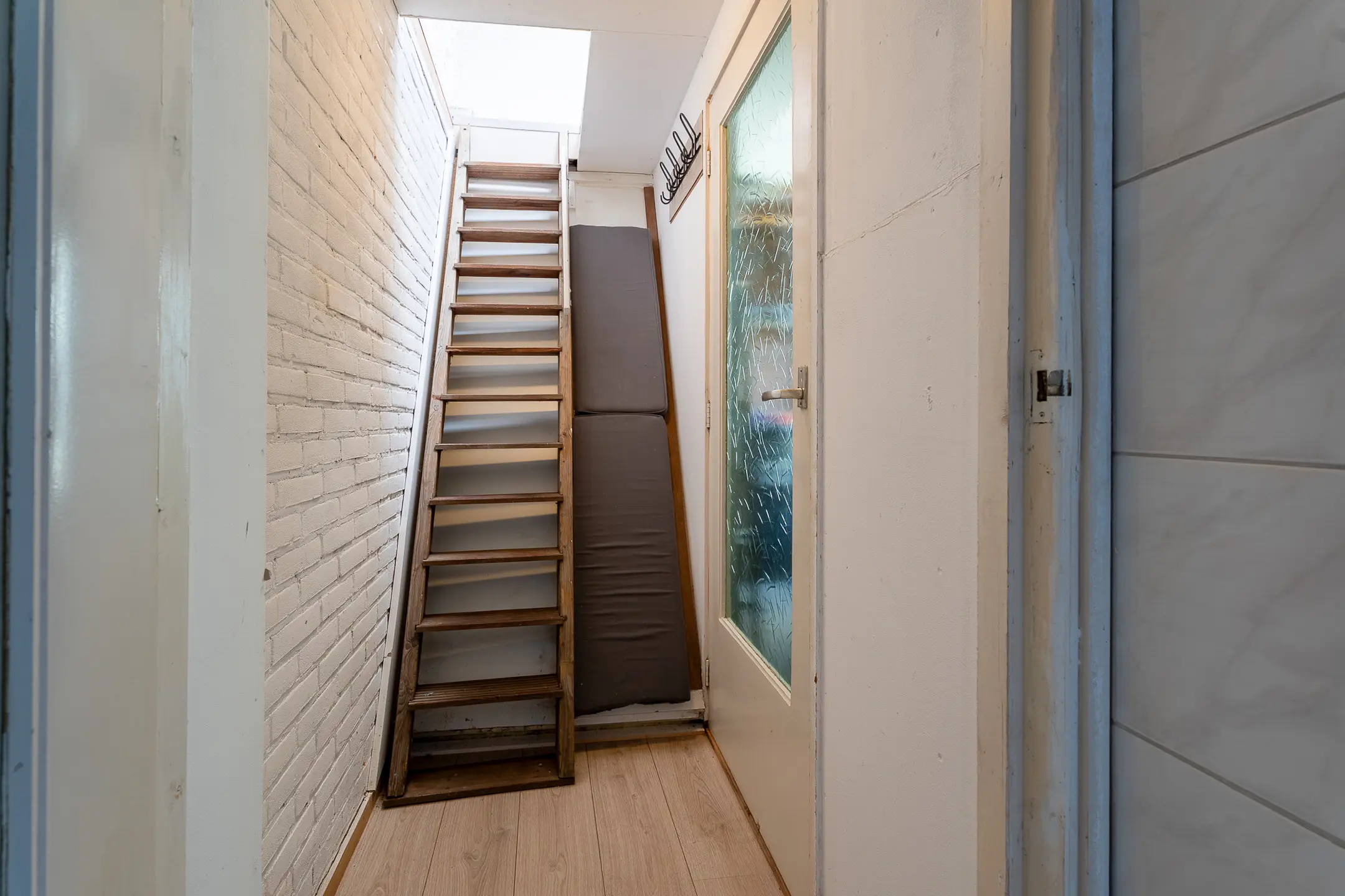 Aansluitend vind je het portaal met toegang tot de achtertuin, de berging én, via een vaste trap, het atelier. Hier bevindt zich ook de moderne toiletruimte met zwevend toilet en fonteintje.