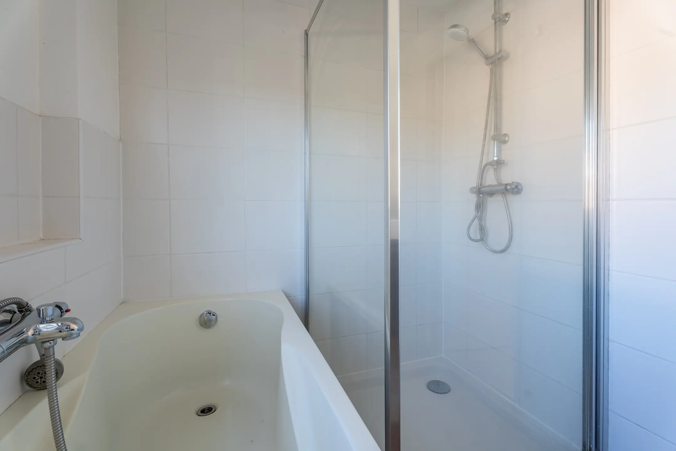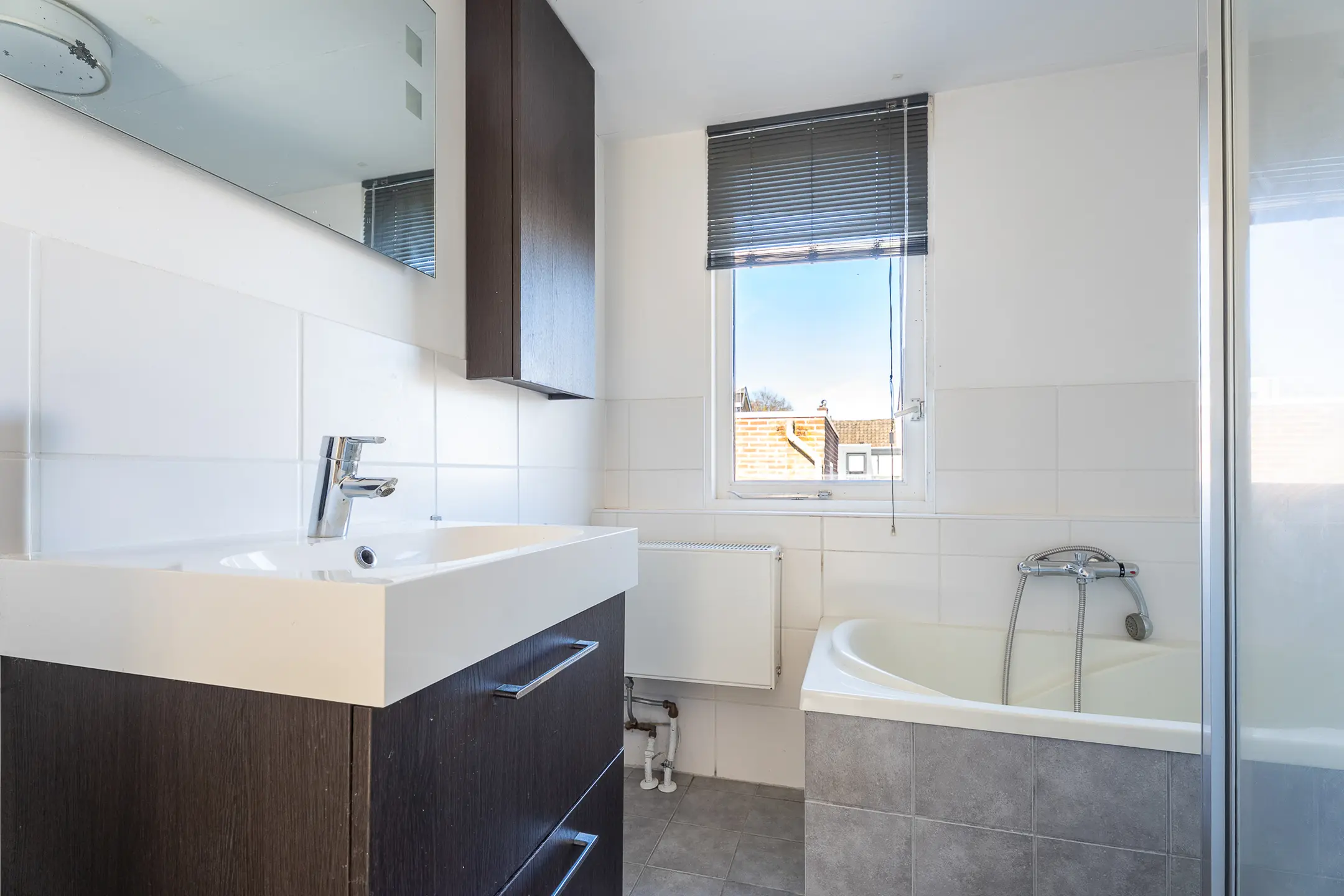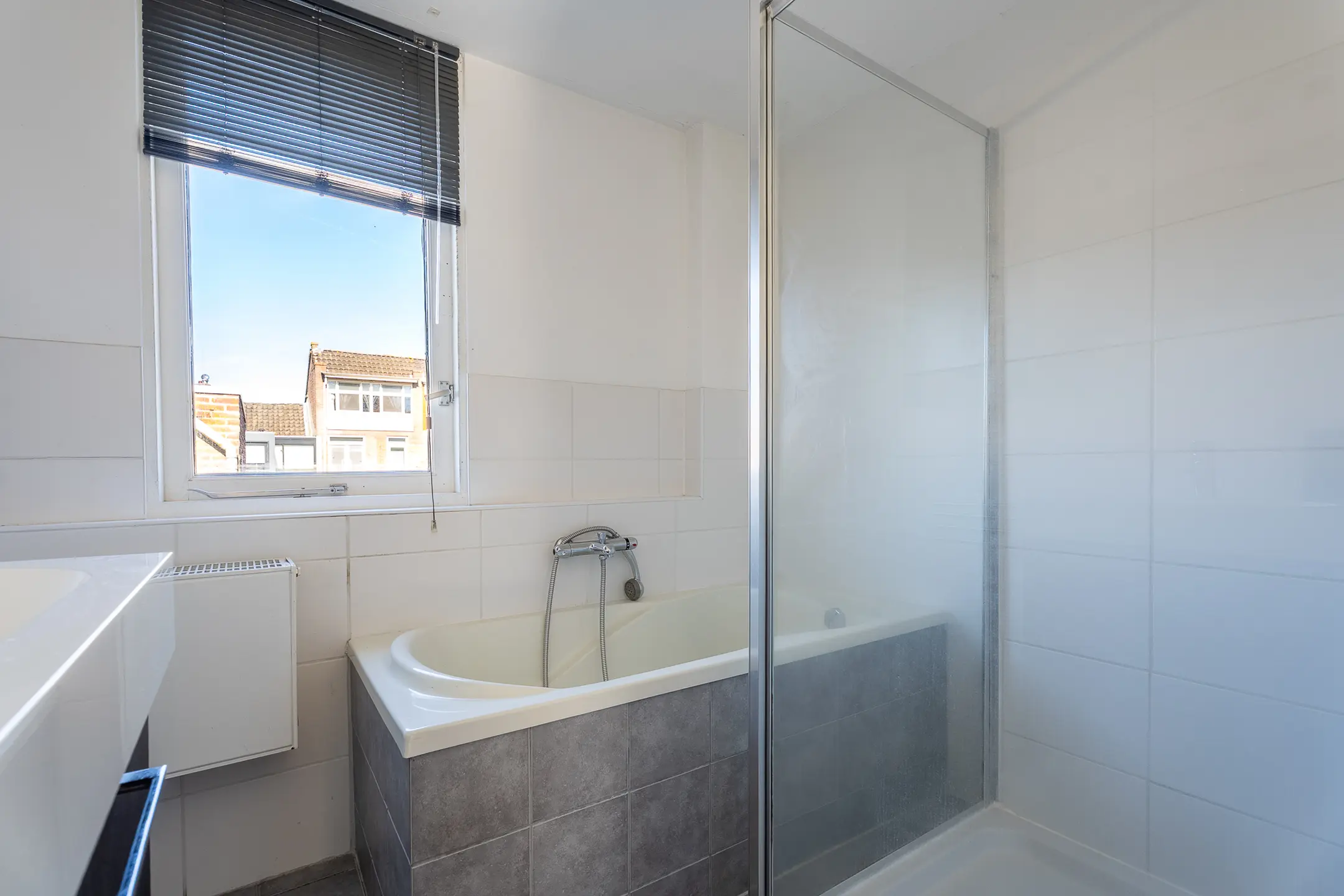 De volledig betegelde badkamer is praktisch ingericht met een ligbad, douche en een wastafelmeubel.
