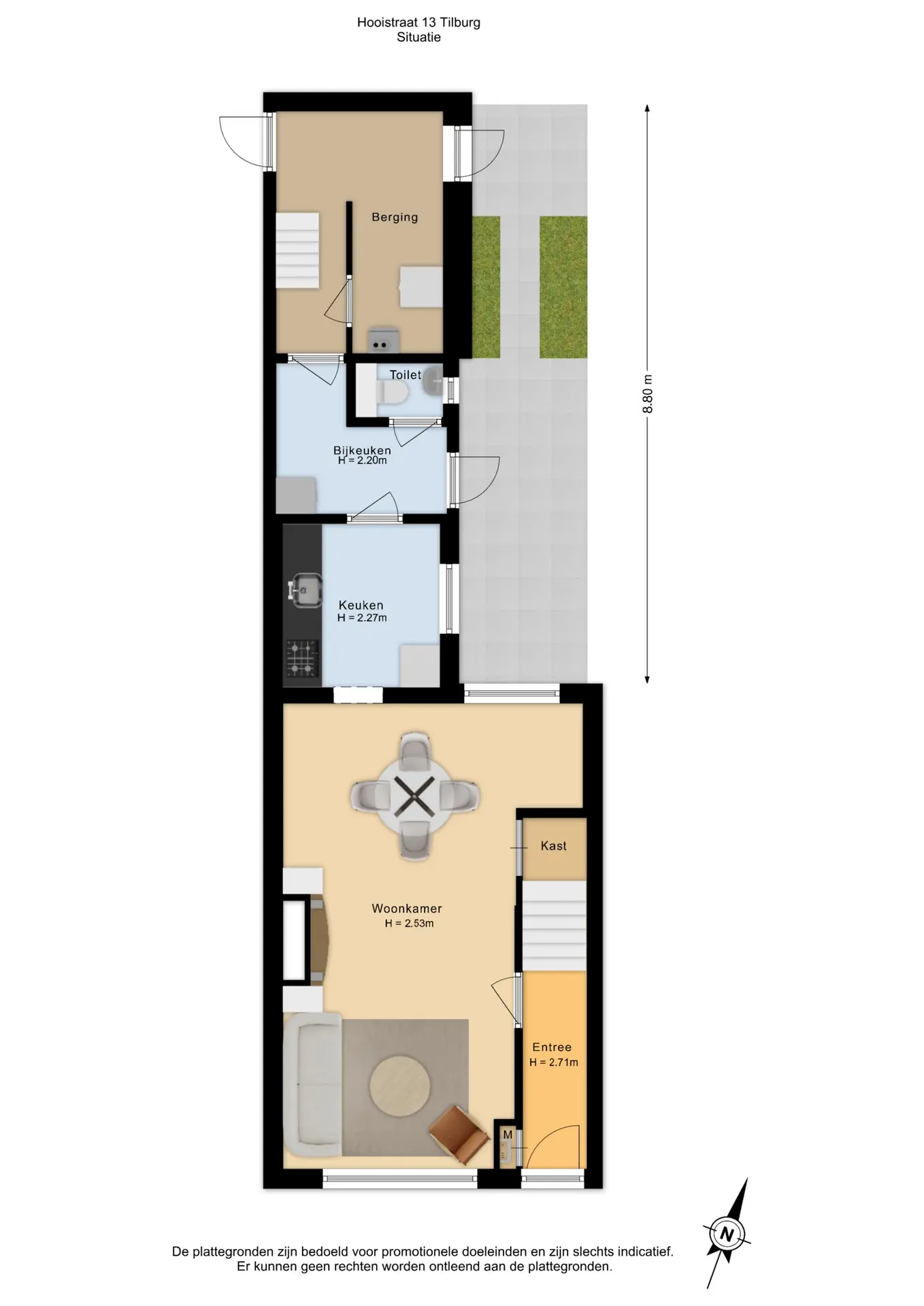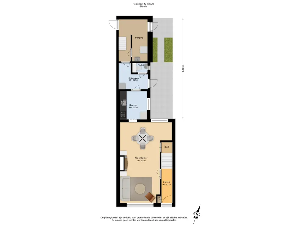 De knusse stadstuin ligt op het noordwesten en is onderhoudsvriendelijk aangelegd met tegels en groene borders. Via de berging is er een handige achterom.