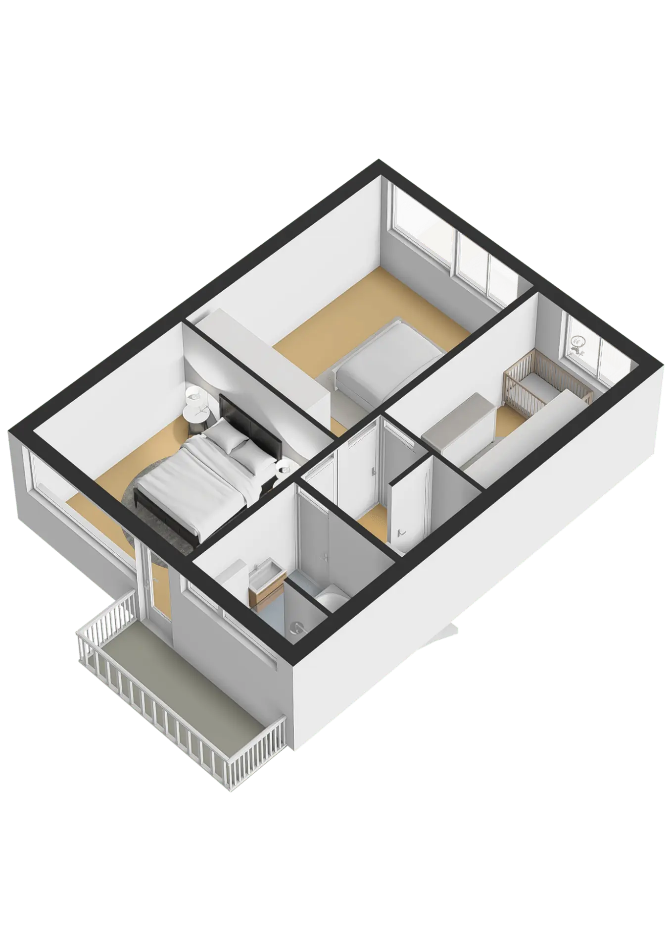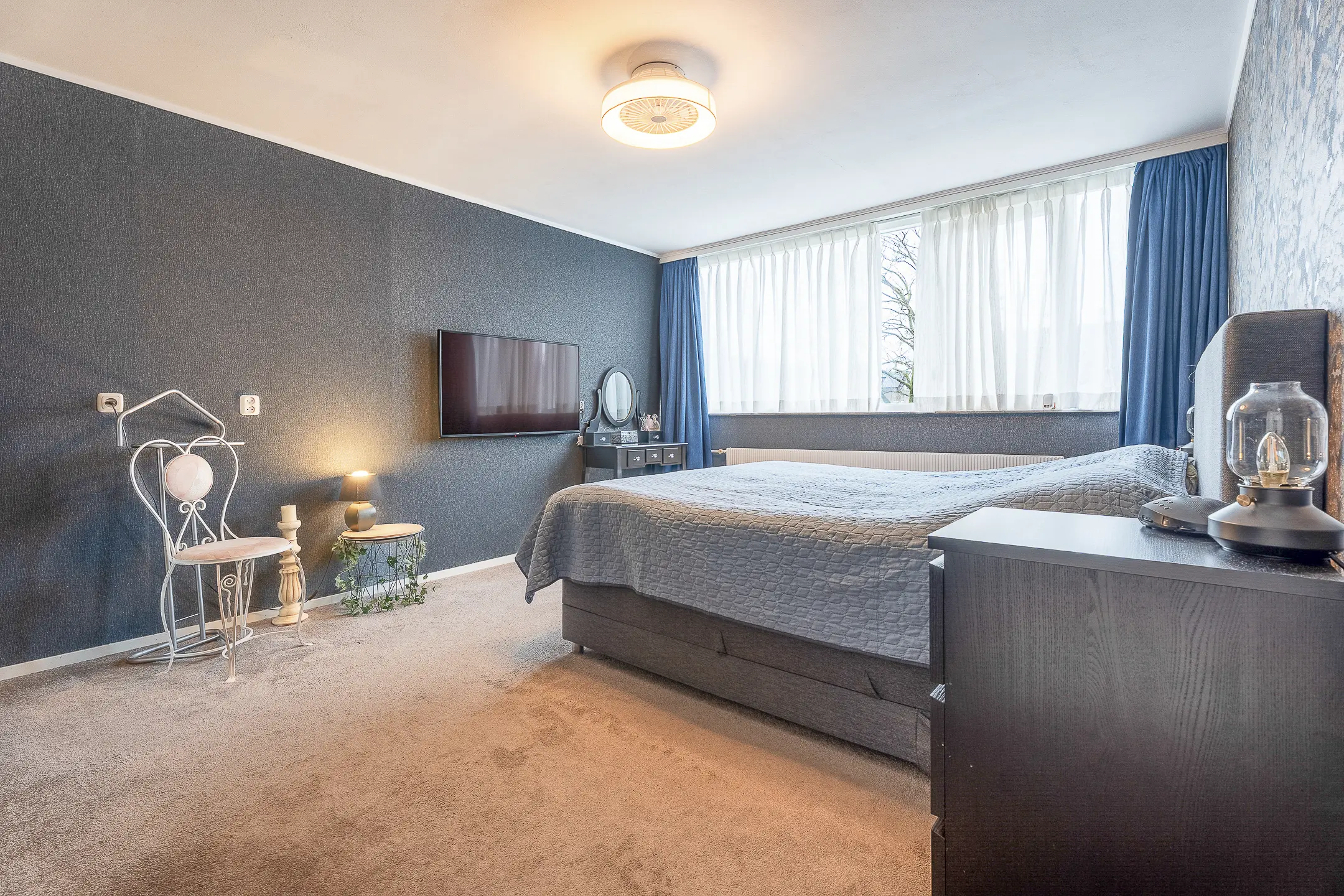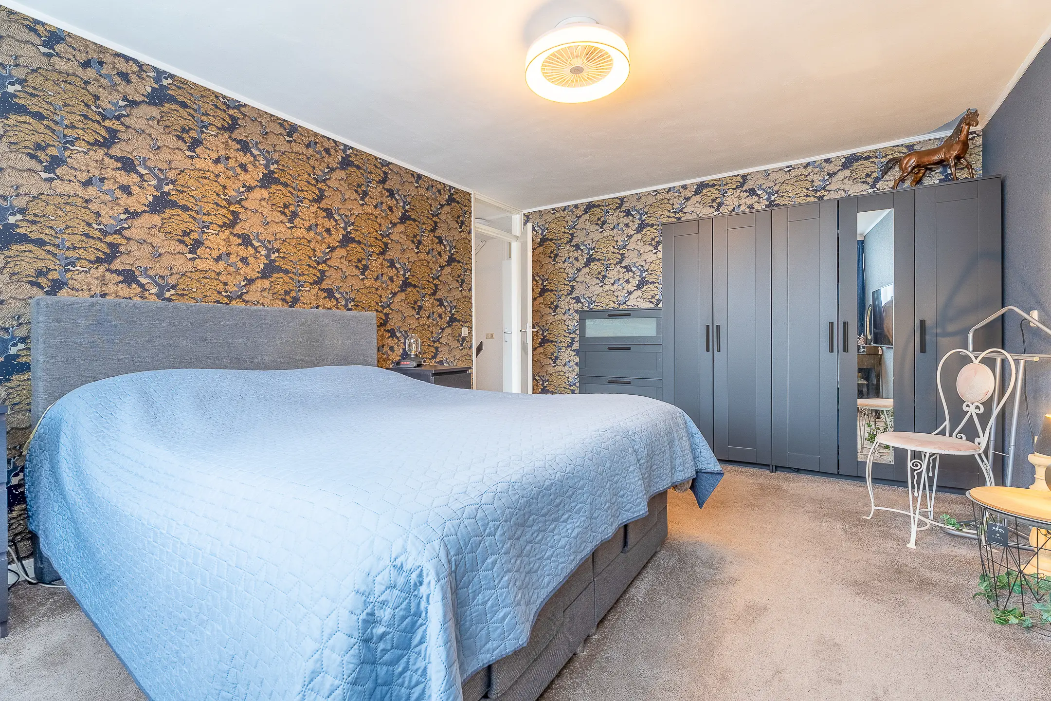 De overloop biedt toegang tot drie ruime slaapkamers, de badkamer en de trapopgang naar de 2e verdieping. Twee slaapkamers zijn gelegen aan de achterzijde en de badkamer en de 3e slaapkamer aan de voorzijde. De slaapkamer aan de voorzijde heeft een eigen balkon. Deze kamer is nu ingericht als werkkamer en beschikt over een wastafel met meubel ombouw. De “master bedroom” is meer dan royaal met zijn 17m² en ingericht met tapijt en behang wandafwerking. De twee andere slaapkamers zijn ook mooi van oppervlakte. Wat dacht je van bijna 8 en 12m². De badkamer is compleet met whirlpool-ligbad, inloopdouche, een toilet en een wastafel.