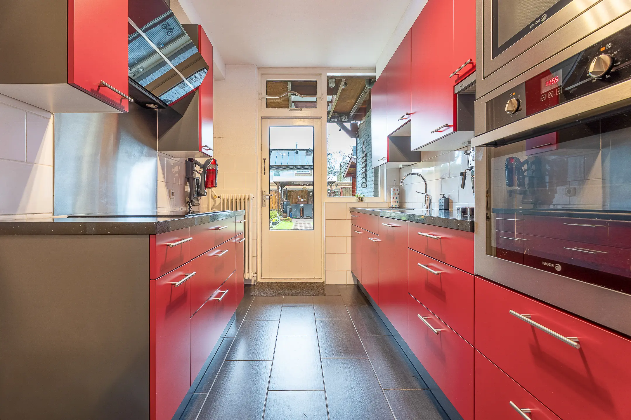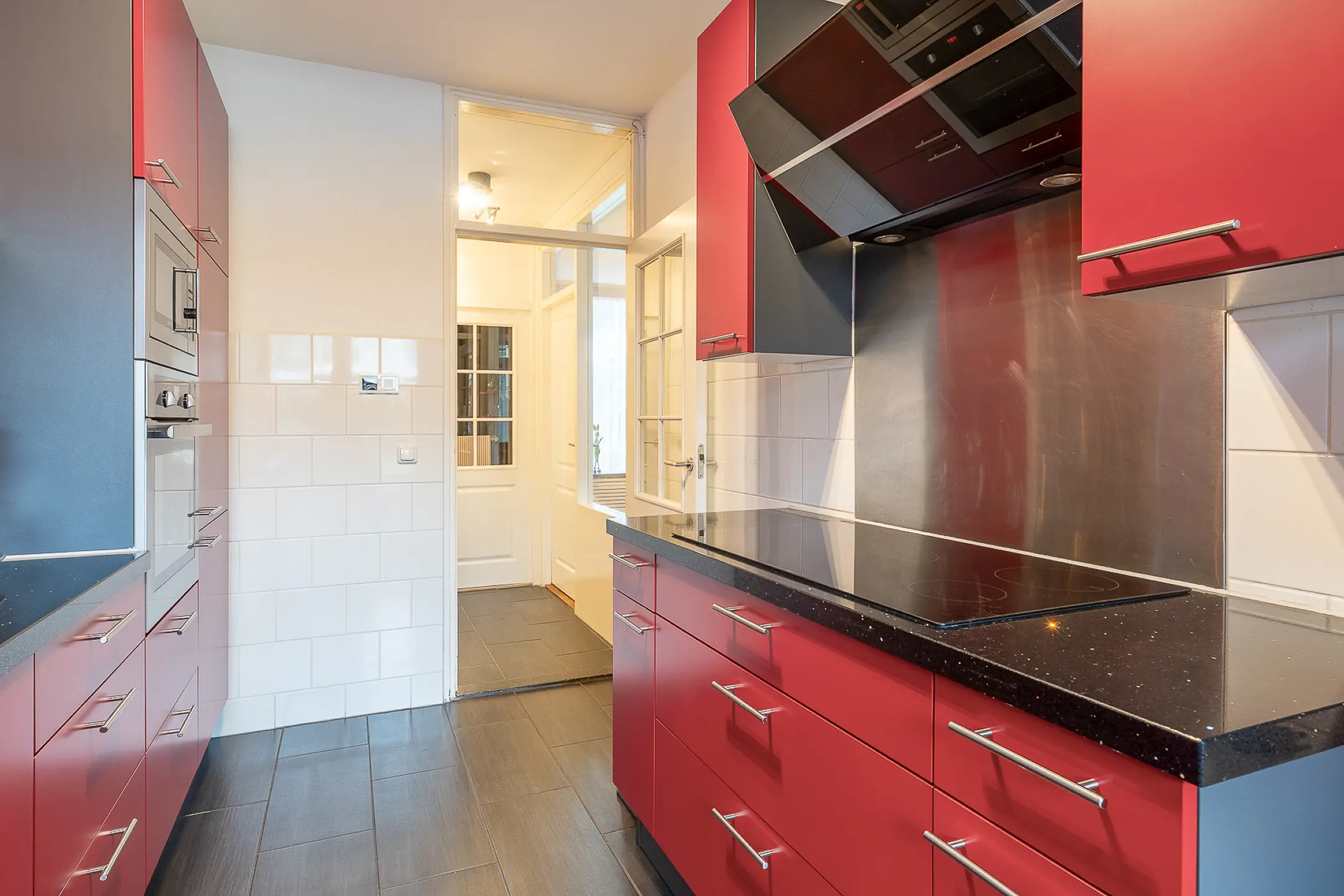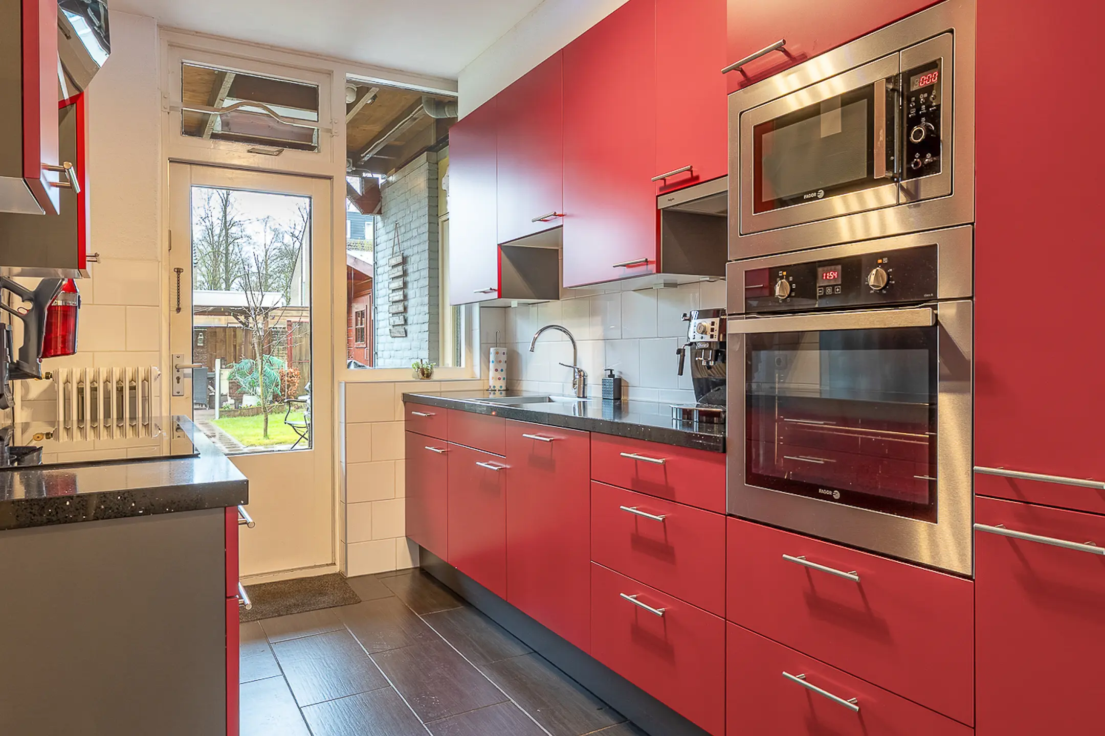 Entree, hal met meterkast en toilet. De meterkast is gemoderniseerd en biedt volop voorzieningen voor de zonnepanelen, alle keukenapparatuur en de laadpaal. Het toilet is prettig ruim, voorzien van een fonteintje en een raampje voor ventilatie. Alvorens je de woonkamer of de keuken betreedt, is er een tussen hal met trapopgang en een ruime voorraadkast. De trap naar de verdieping is fraai bekleed en voorzien van verlichting. Heerlijke traditionele doorzonwoonkamer met grote ramen, veel lichtinval, mooi uitzicht op de straat en je diepe achtertuin. Met een oppervlakte van 29m² (exclusief keuken) is het een fijne living. De stucwerk wanden, het stucwerk plafond en de houten vloer maken het geheel compleet. De moderne keuken is meer dan uitgebreid met volop kastruimte en inbouwapparatuur; inductie koken op 5-pits, koel-vriescombinatie, oven en een magnetron. Er zijn twee afzuigkappen (1x voor bijvoorbeeld de airfryer) en het geheel is voorzien van een composiet werkblad. Is rood niet je kleur dan is wrappen tegenwoordig een voordelige keuze.