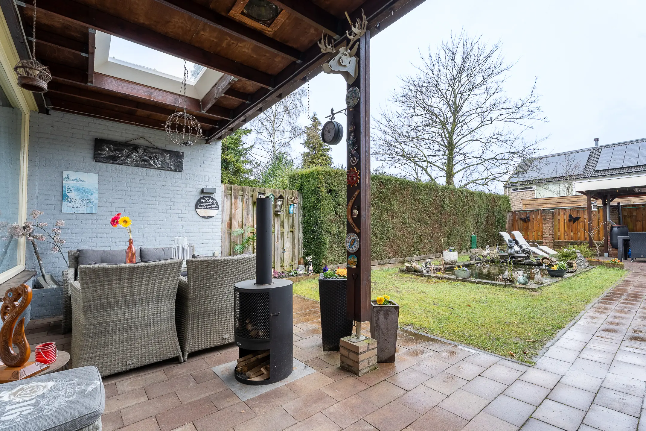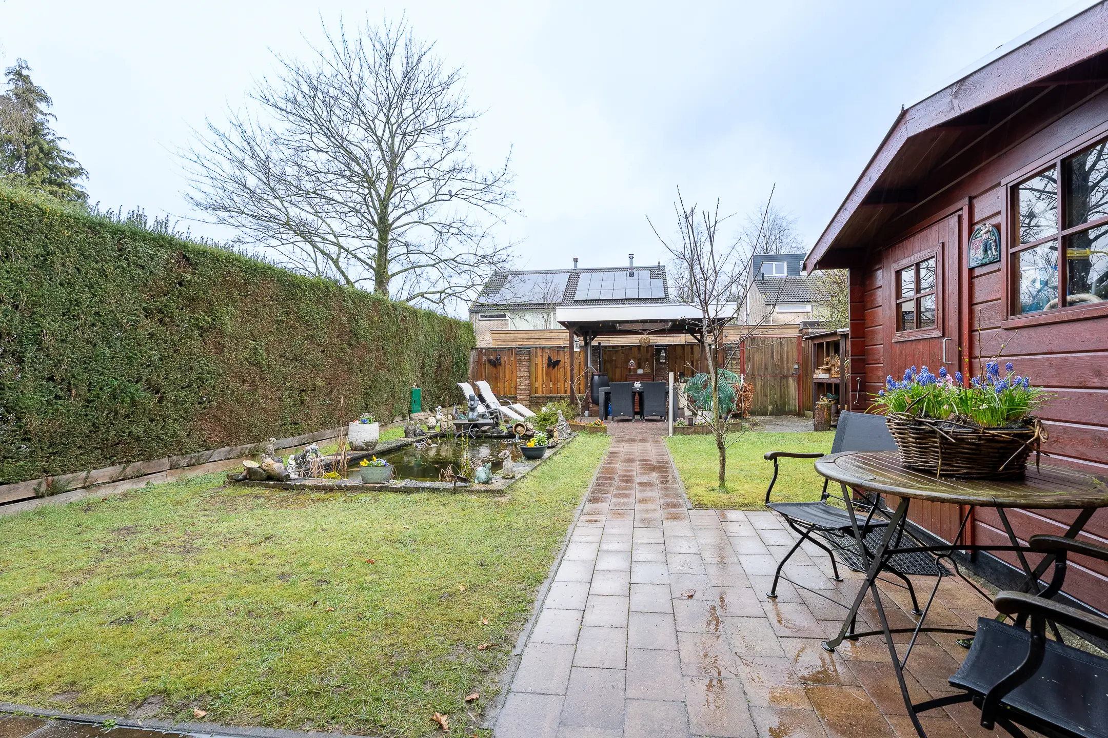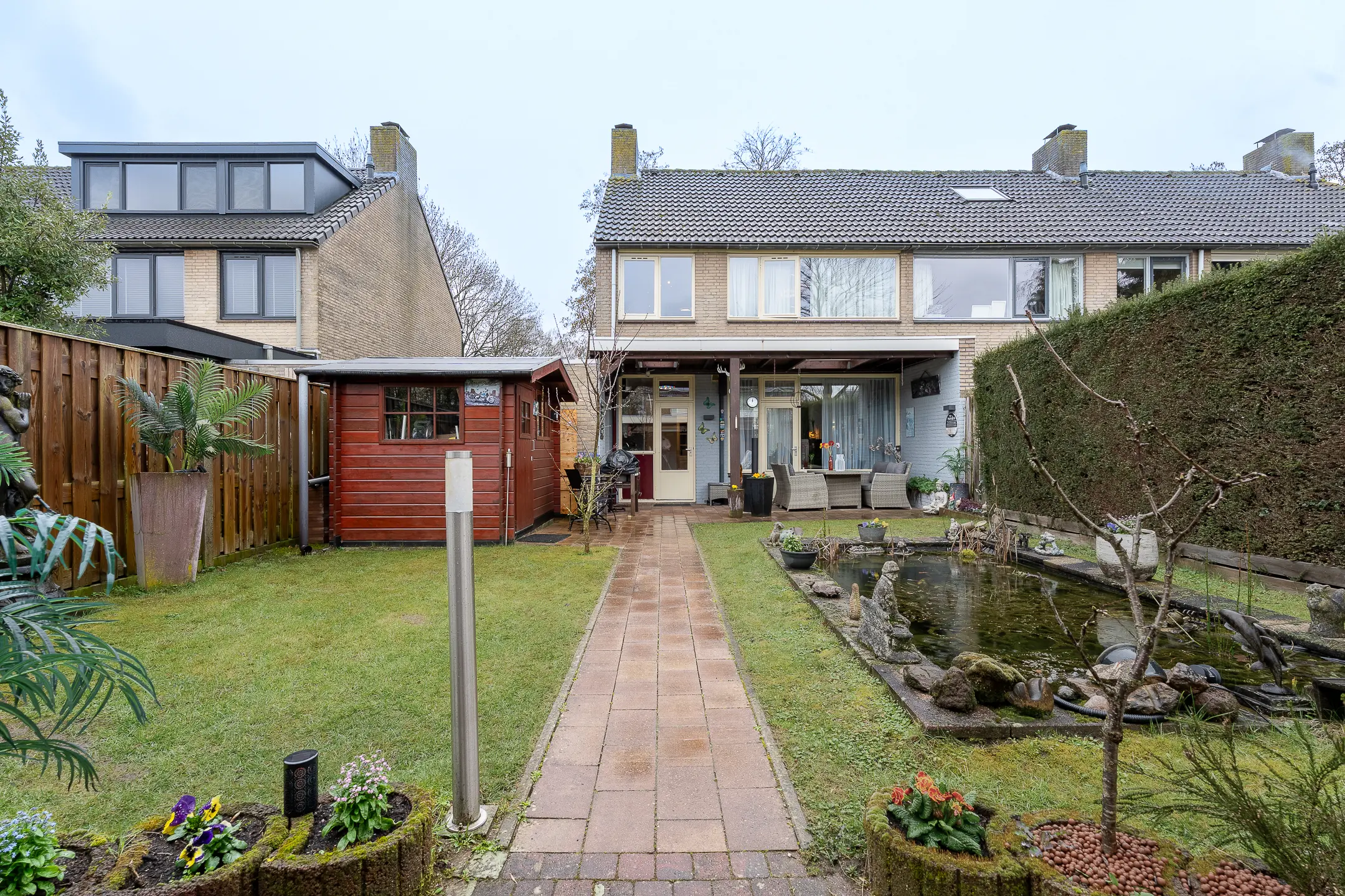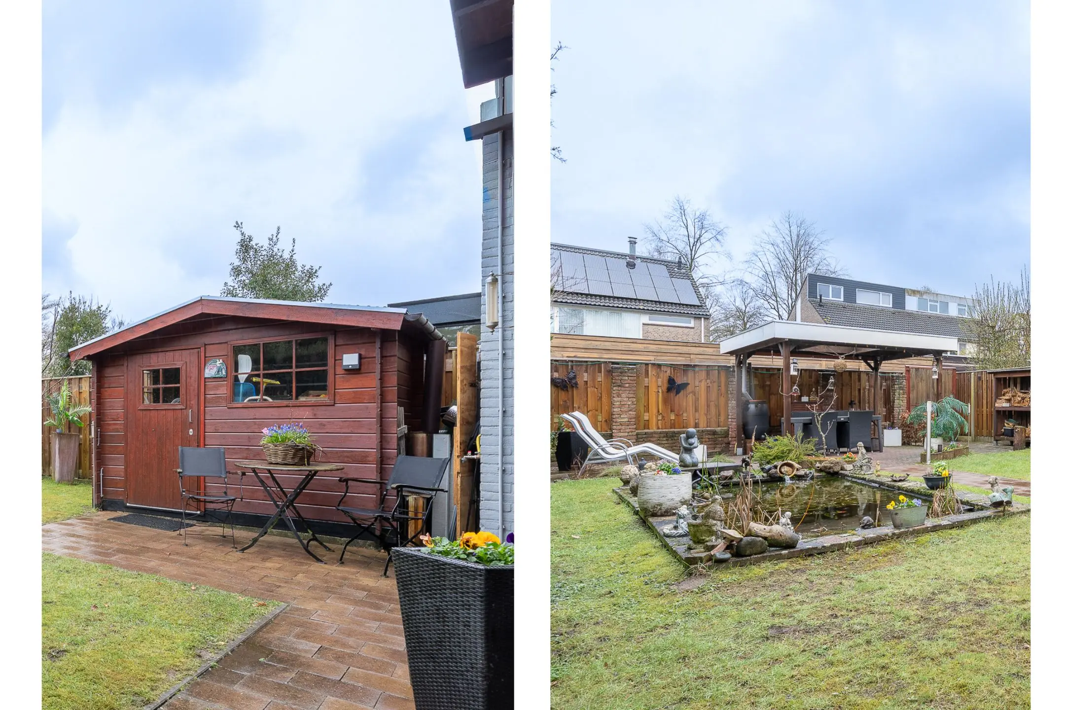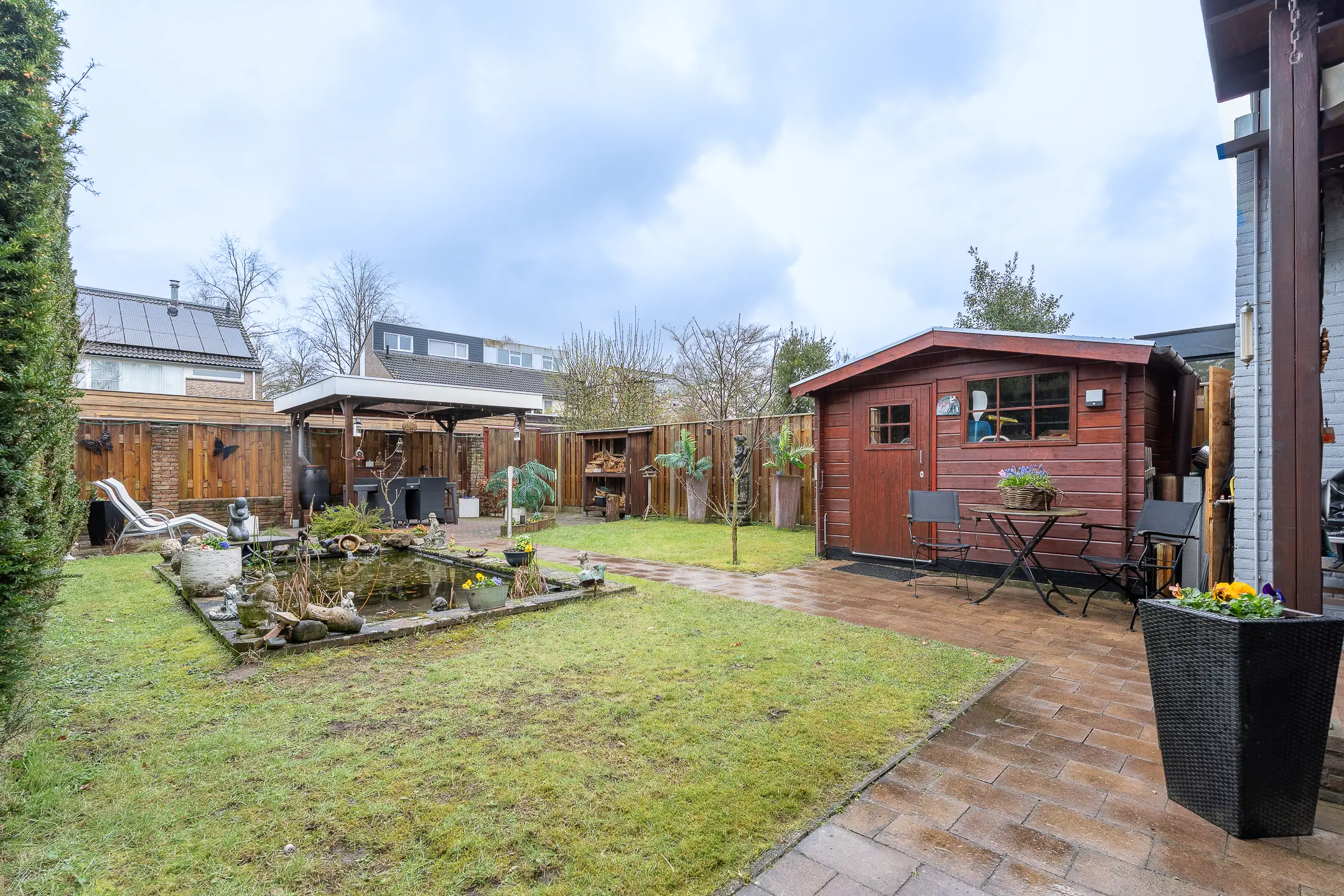 Magnifiek diepe achtertuin en door zijn breedte en zijn diepte erg royaal. De veranda achter de woning, maar ook de overkapping achter in de tuin, geven je altijd een plekje in de zon of de schaduw. De tuin is volledig omheind met groene hagen, schuttingen en er is achterom mogelijk via de garage of de brandgang aan de achterzijde van het perceel. De tuin is vriendelijk ingericht met gazon, vaste planten, borders en een vijver. Het houten tuinhuis biedt je naast de garage opslag en stalling.