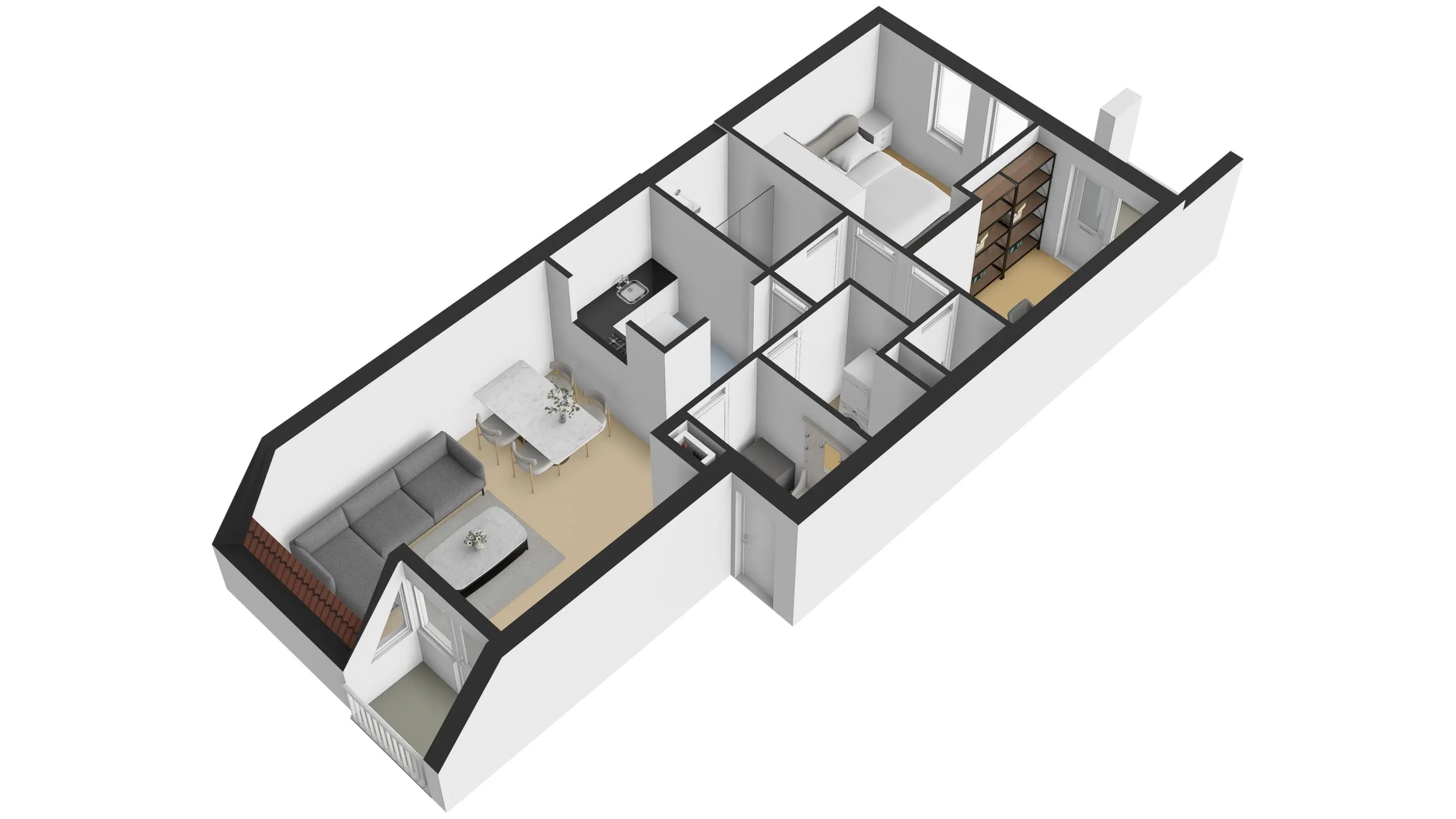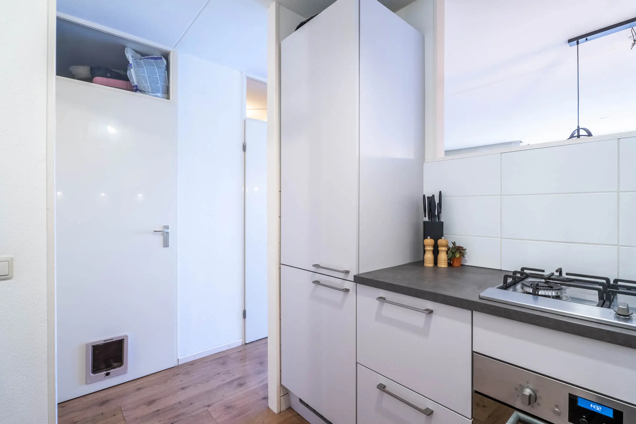 Mooie, lichte woonkamer met tweetal dakramen en een loopdeur naar het balkon. Ruim opgezette woonkamer van ca. 22 m² met semi-open keuken. Prima hoekkeuken met volop onder- en bovenkasten en is voorzien van diverse gemakken, zoals een koel-vriescombinatie, gaskookplaat, combi-oven, RVS-spoelbak en een vaatwasser. Aansluitend aan de keuken is er toegang tot de technische ruimte - berging. Hier bevinden zich de aansluitingen voor de wasapparatuur, de opstelling van de cv-ketel en is er volop bergruimte.