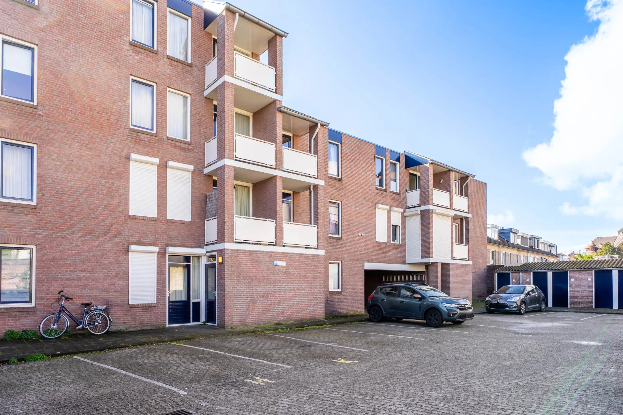 Op het binnenterrein achter het gebouw vind je de eigen berging en het gezamenlijke parkeren. De eigen berging biedt plaats aan bijvoorbeeld de fietsen. De parkeerplaatsen zijn gedeeld met de andere bewoners van het complex. Het binnenterrein is aan de straatzijde afgesloten met een elektrisch hek.