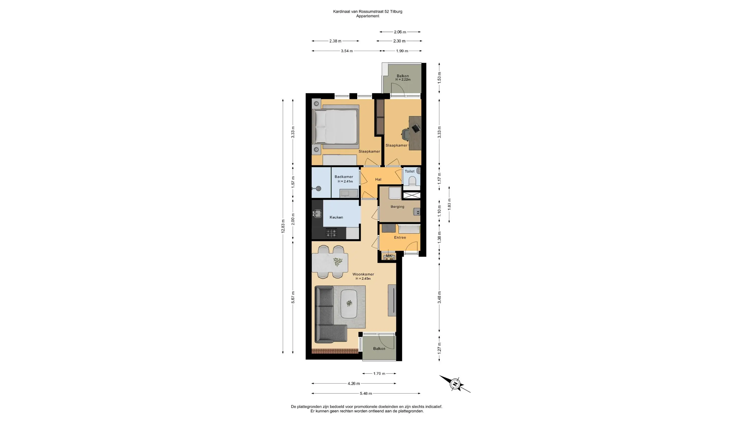 Bij de entree van het appartement kom je in de hal met meterkast en garderobe. De hal geeft toegang geeft tot de woonkamer. De woonkamer beschikt over een eigen balkon, een semi-open keuken en een royale berging. Aansluitend aan de keuken bevindt zich een gang die toegang biedt tot de twee (slaap)kamers, de badkamer, het toilet en een 2e balkon.