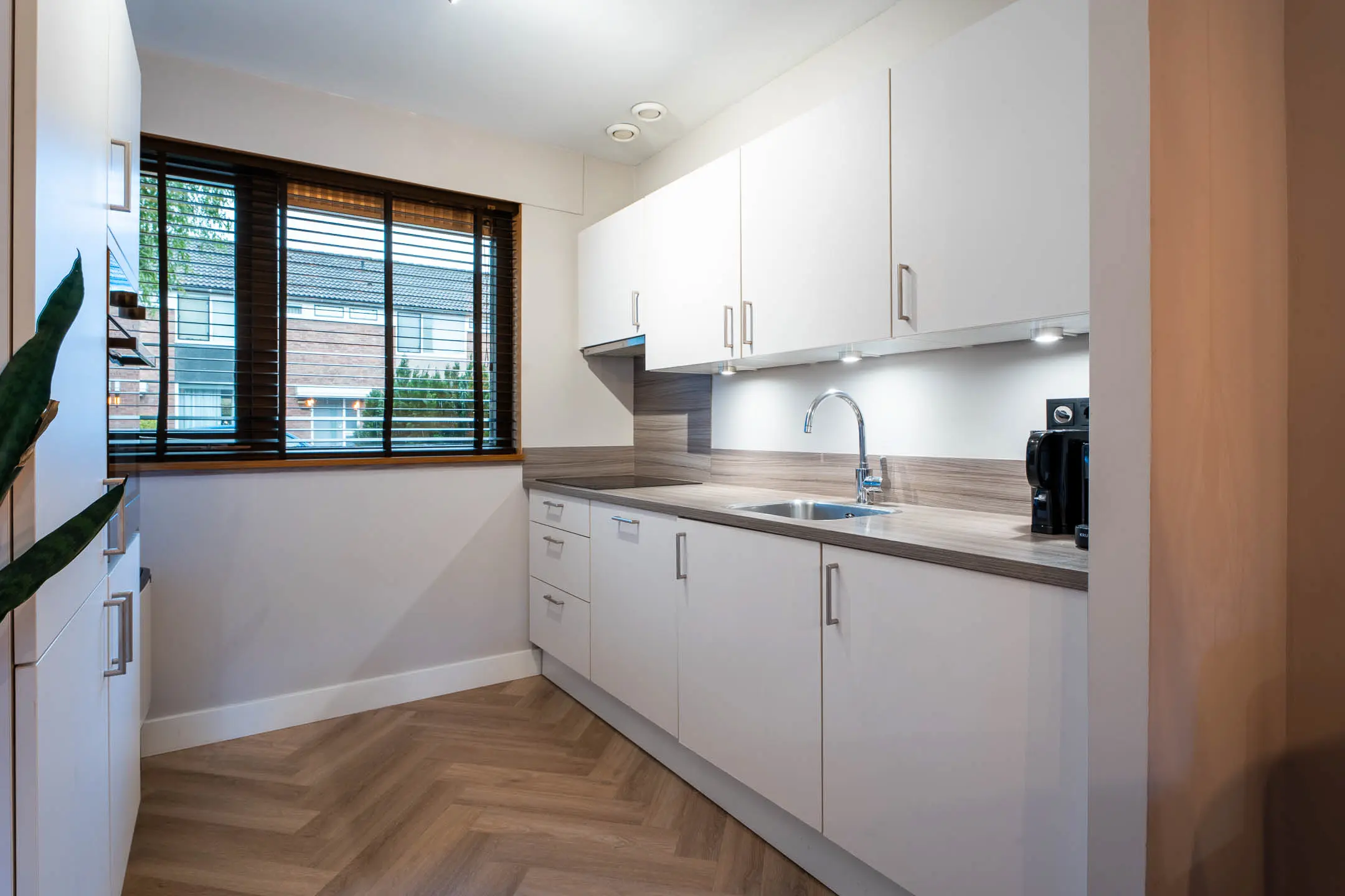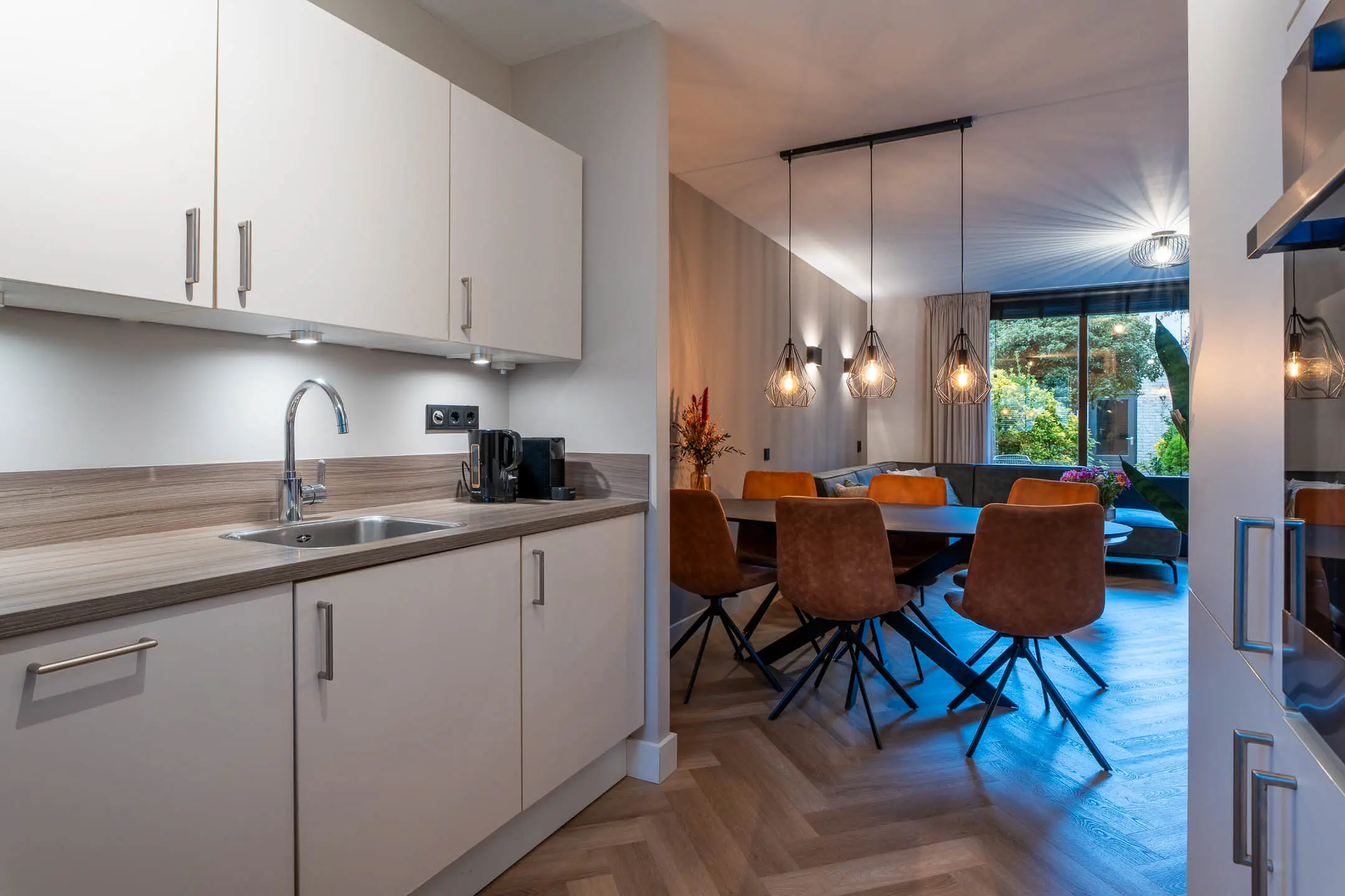 De open keuken heeft een lichte kleurstelling en is voorzien van diverse onder- en bovenkasten. Er zijn diverse inbouwapparatuur waaronder een koelkast, vriezer, oven, vaatwasser en keramische kookplaat met afzuigkap.
