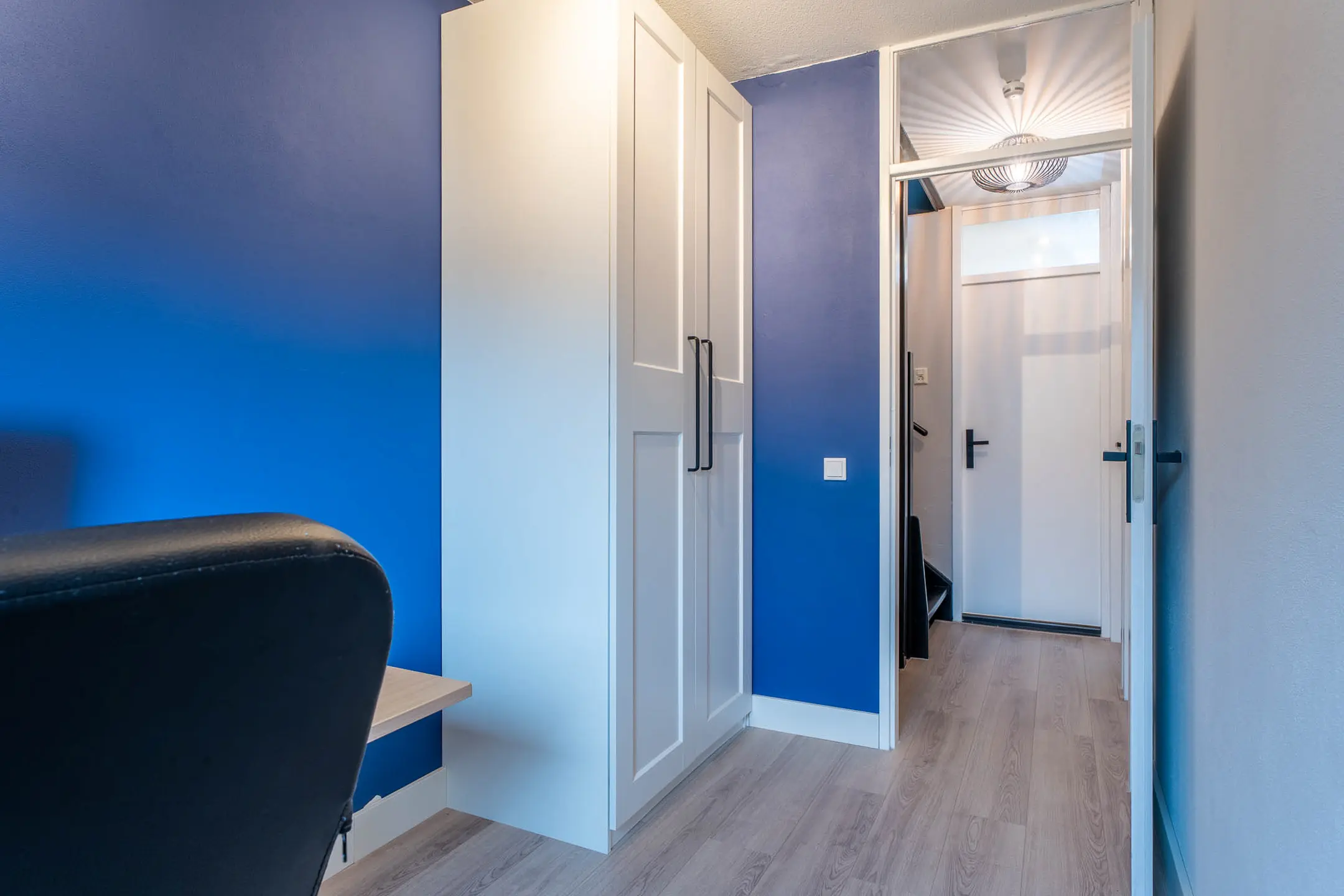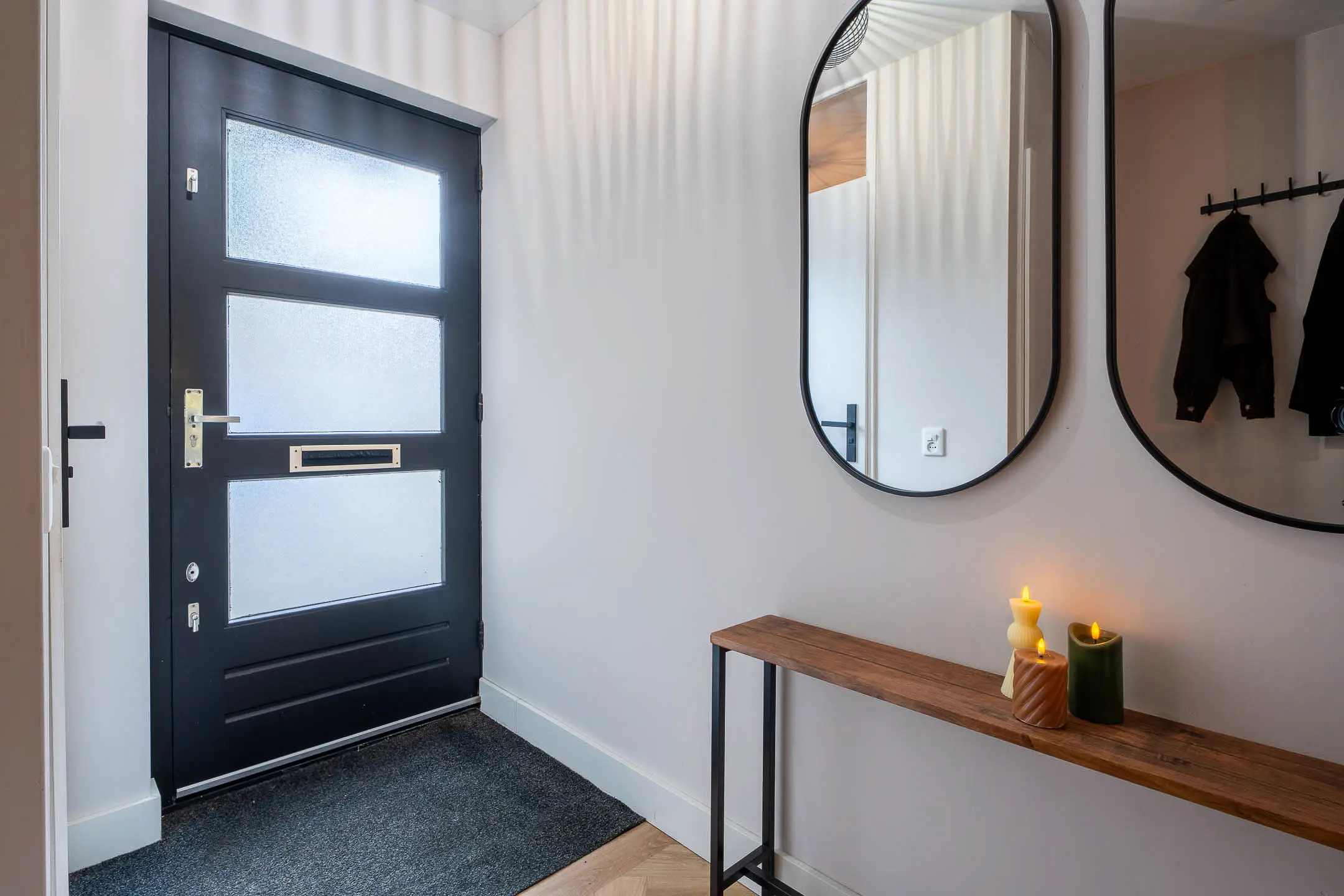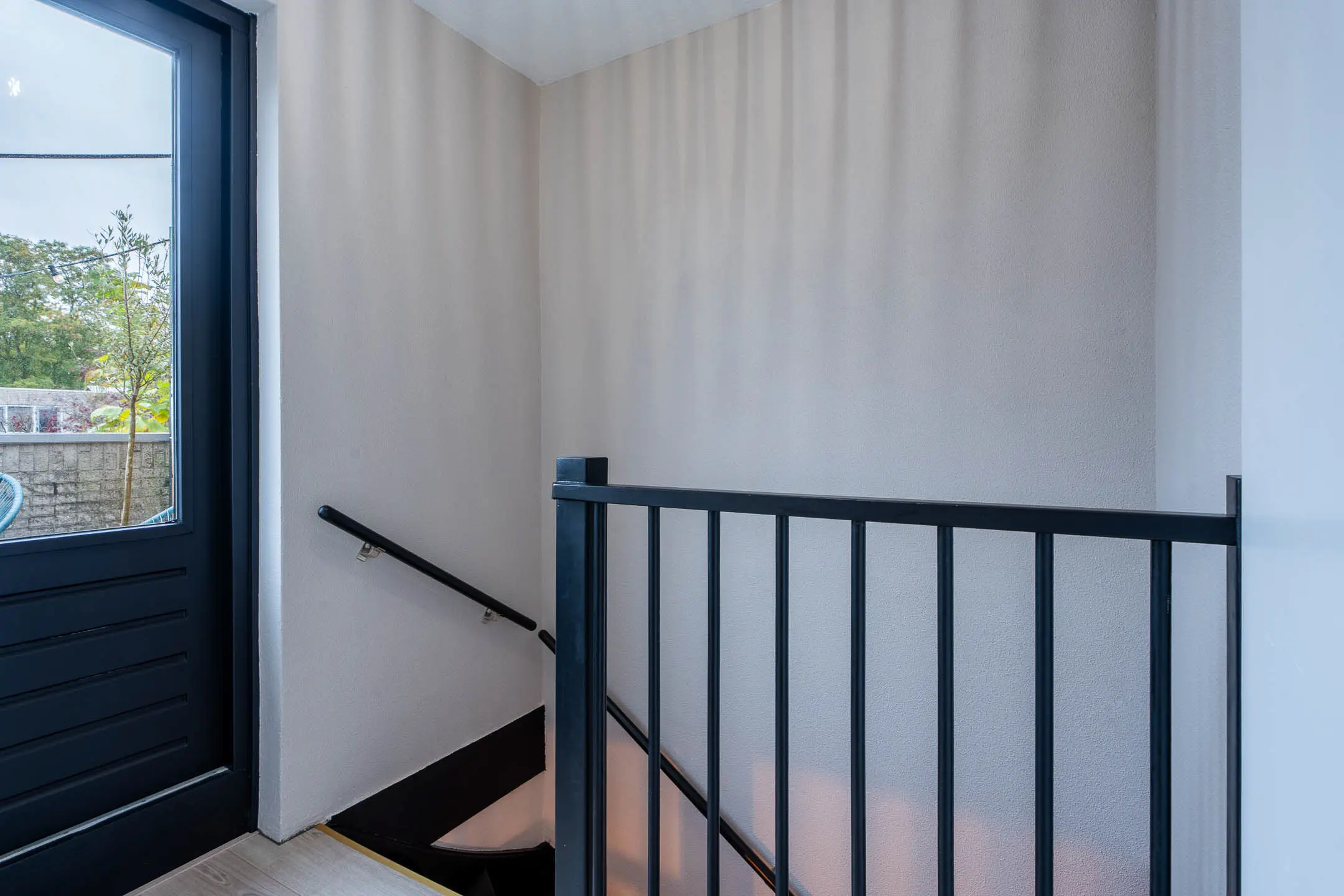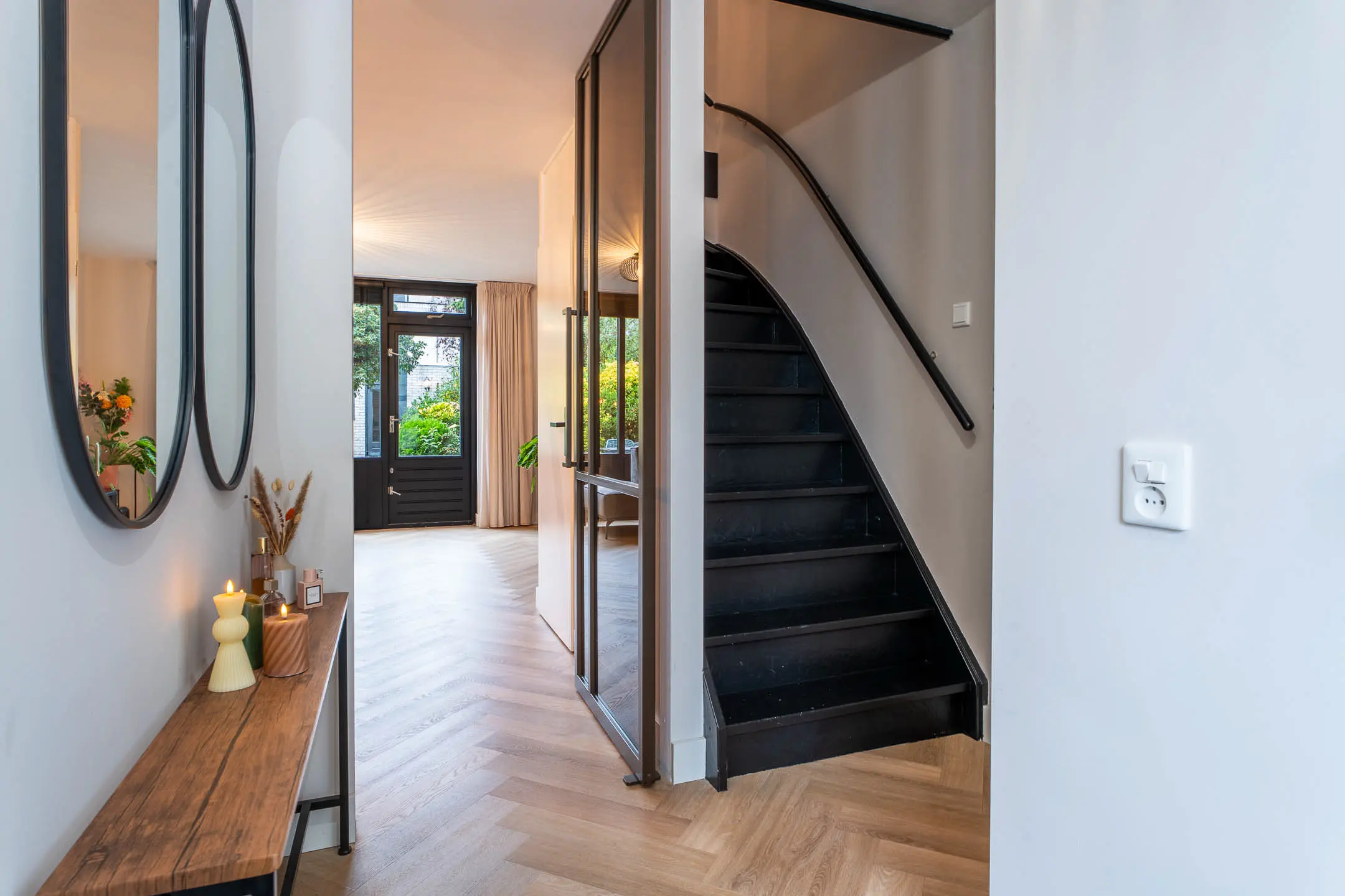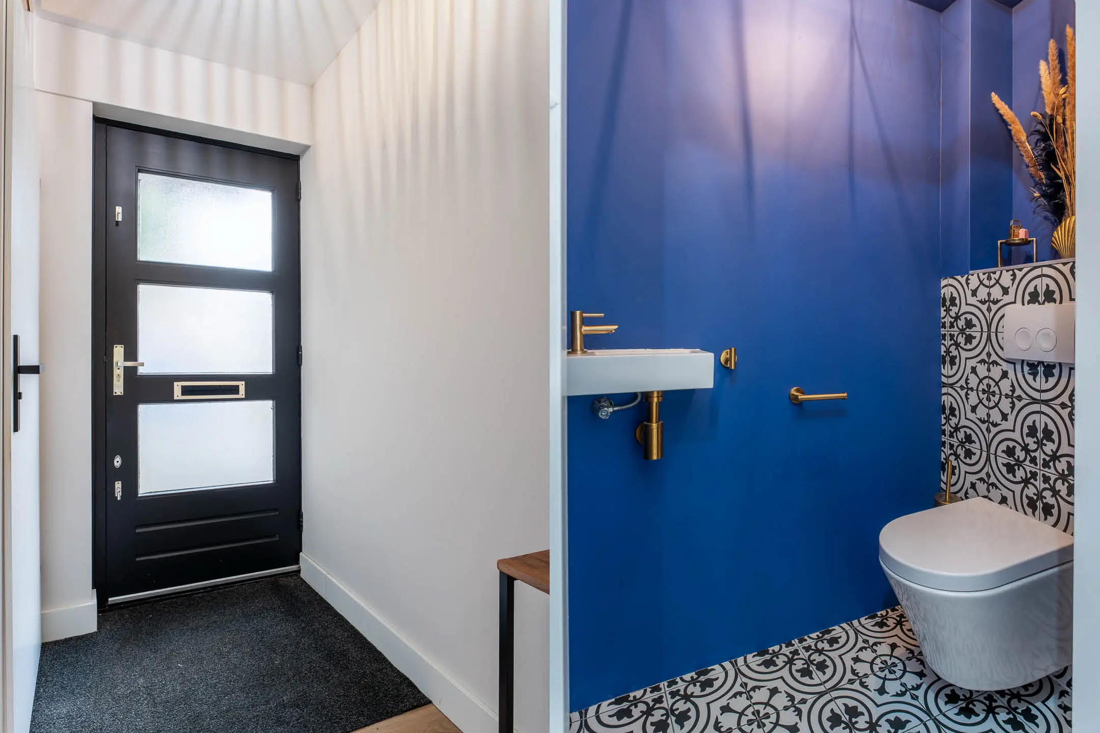 Via de entree kom je in de hal van de woning, de hal is afgewerkt met strak stucwerk en een pvc visgraat vloer. Via de stalen taatsdeur kom je in de woonkamer. De toiletruimte is deels betegeld en voorzien van een zwevend toilet met fonteintje. De meterkast heeft 8 groepen met aardlekschakelaars.