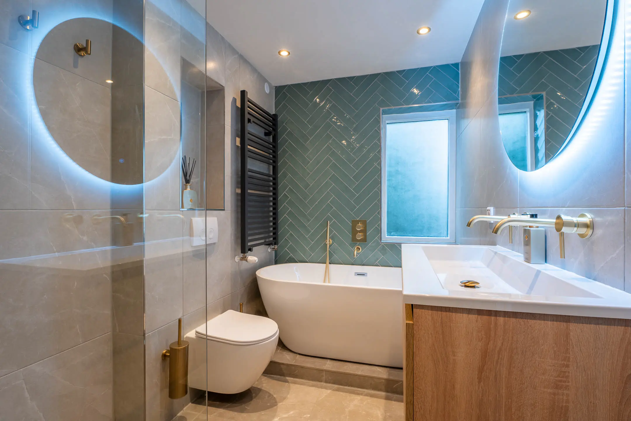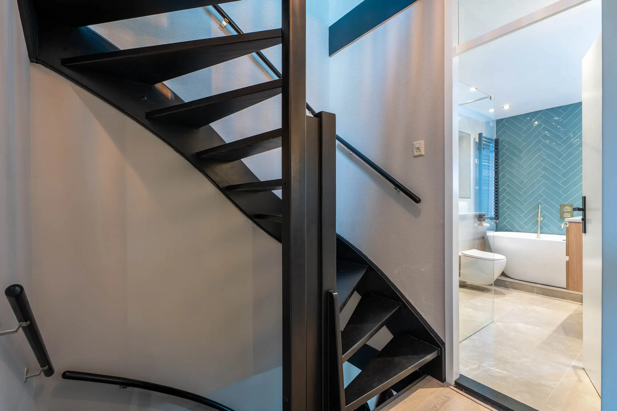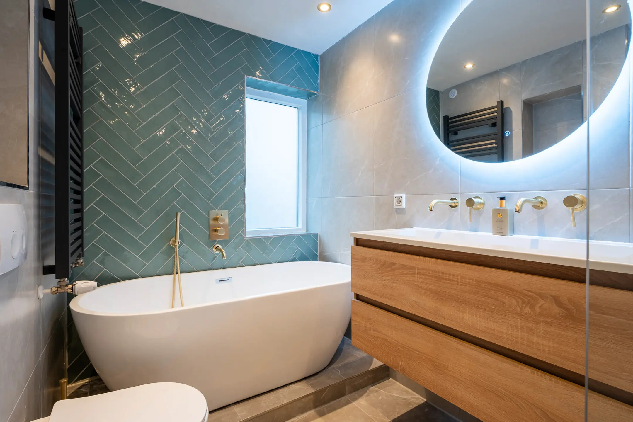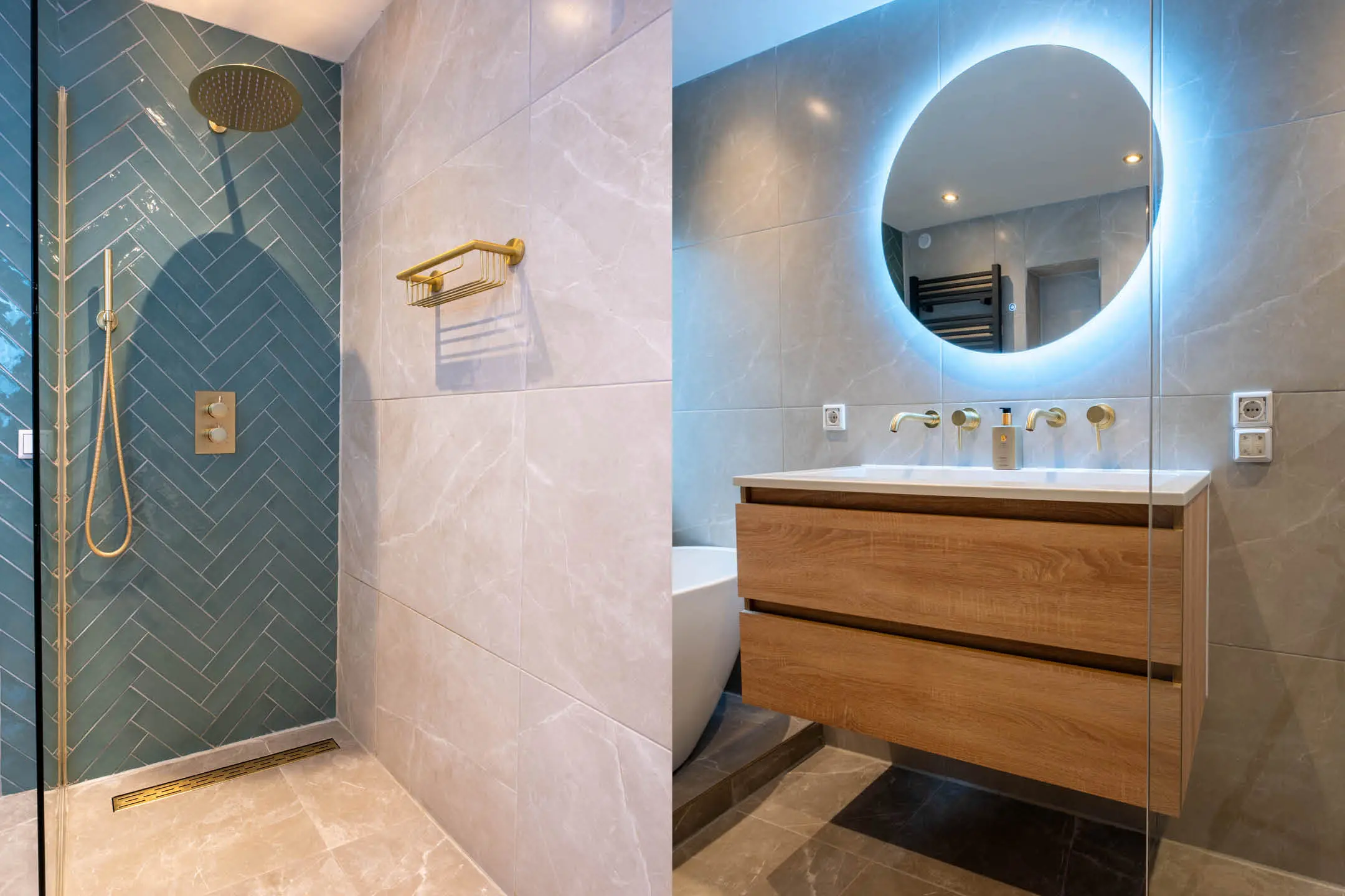 De recent geheel vernieuwde badkamer is geheel betegeld en voorzien van een ruime inloopdouche, zwevend toilet, bad en wastafelmeubel met dubbele kraan. De messing thermostaat kranen geven een extra chique uitstraling aan de badkamer. Verder is er nog een design radiator en zijn er inbouwspots verwerkt in het plafond.