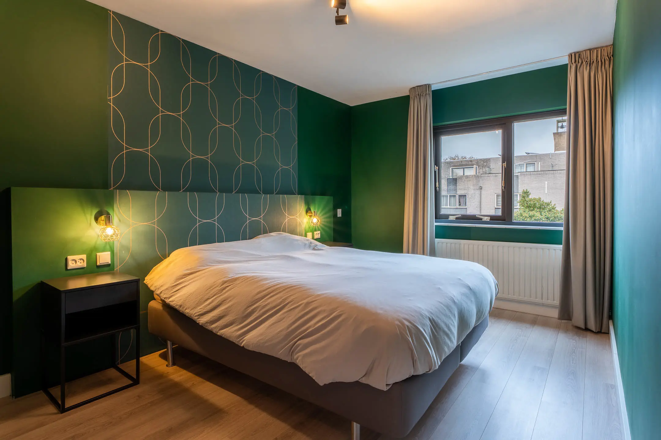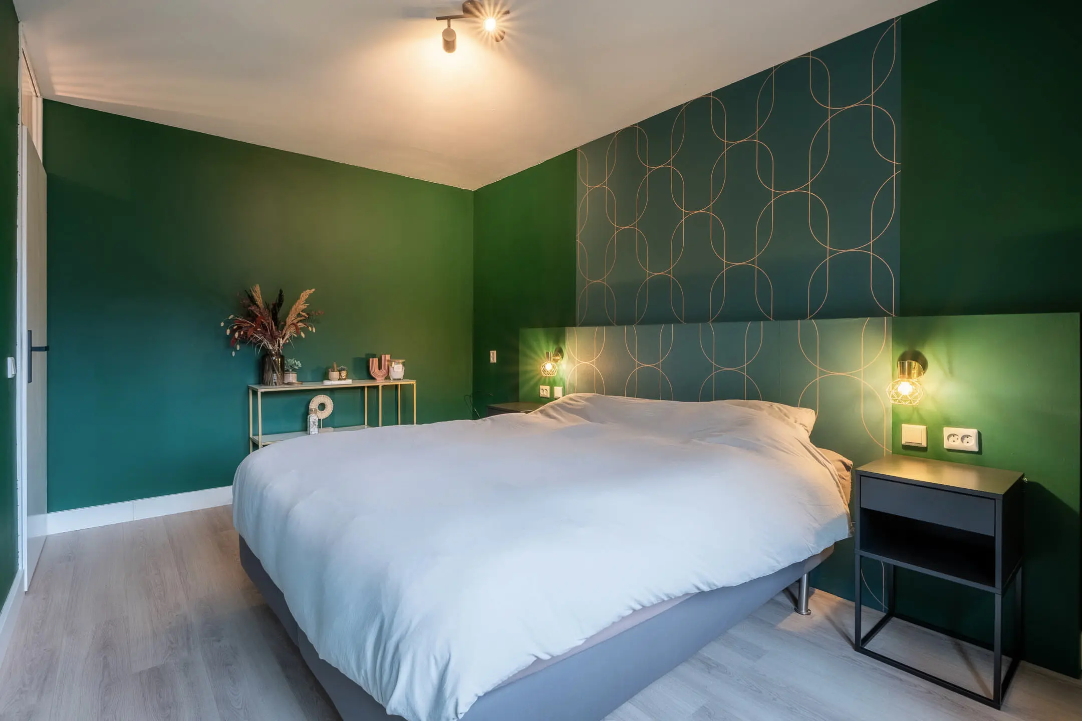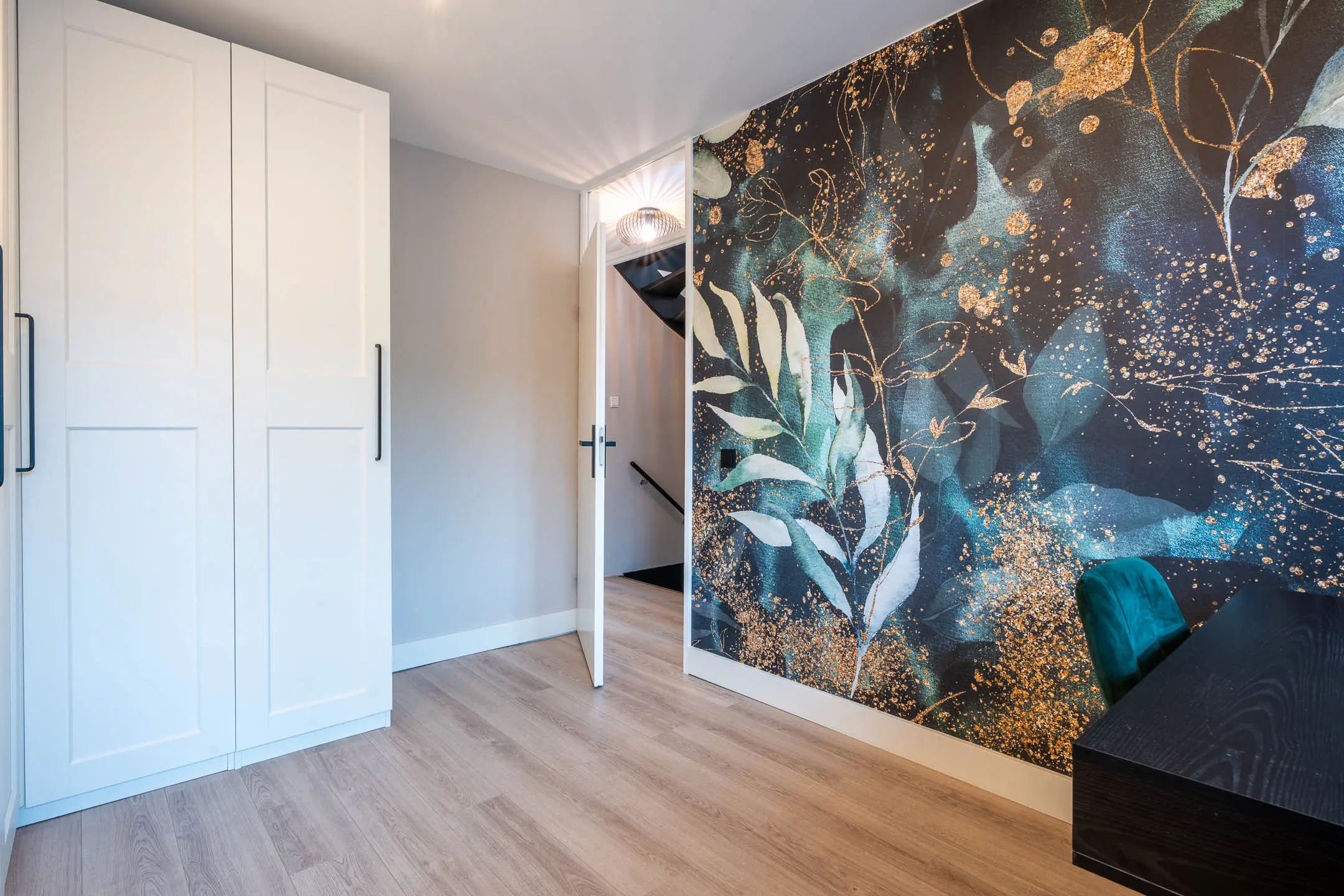 Slaapkamer 1 voorzijde ca. 3,5 x 2,8 m afgewerkt met stucwerk en fotobehang.