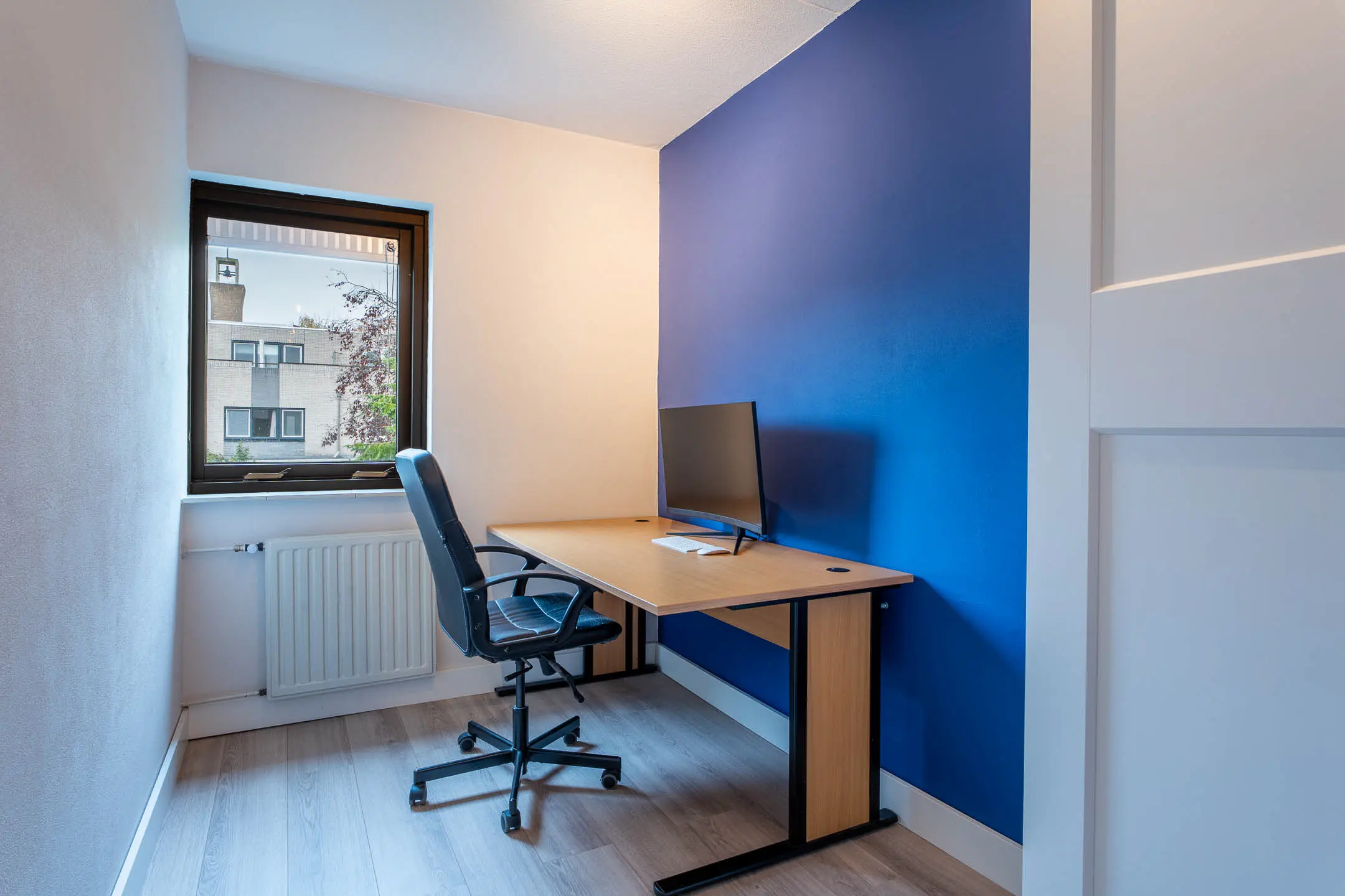 Slaapkamer 2 achterzijde ca. 4,4 x 2,8 m afgewerkt met stucwerk.