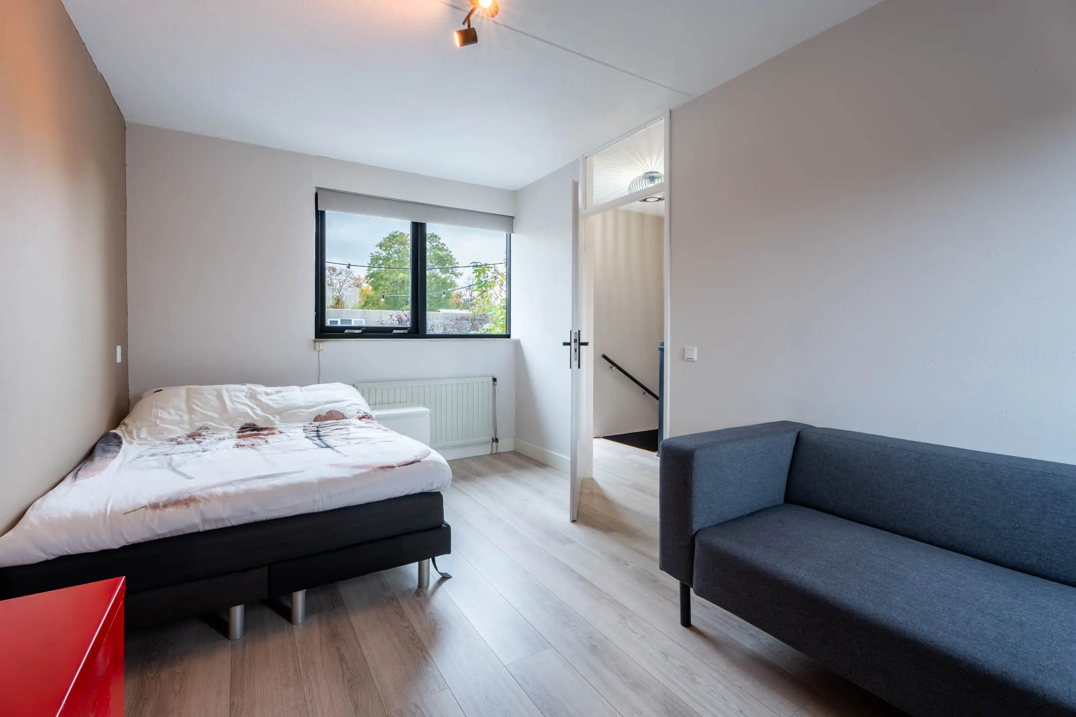 De laminaatvloer is doorgelegd over de hele verdieping wat een rustige uitstraling geeft.