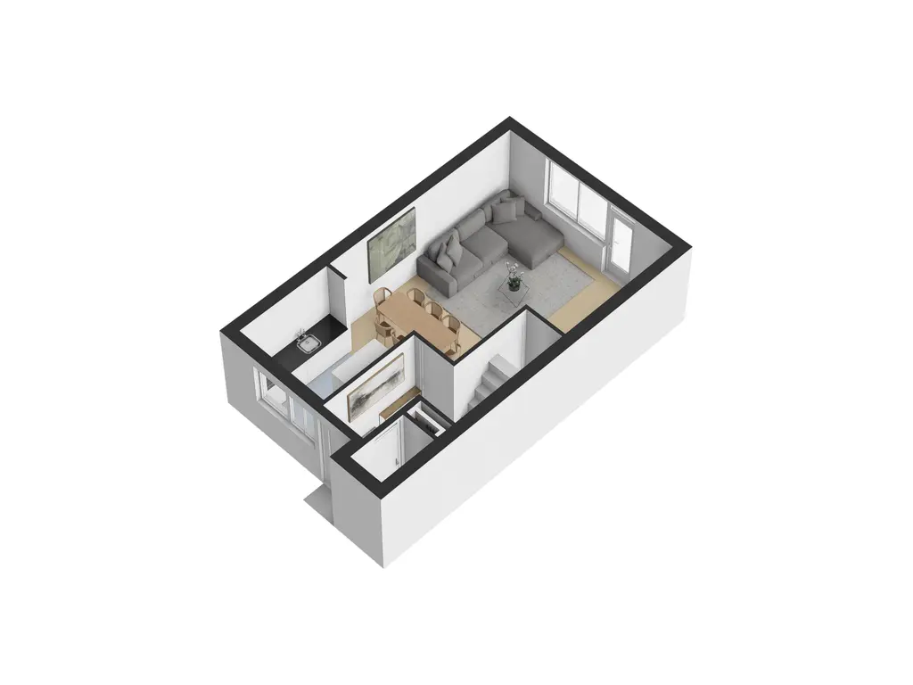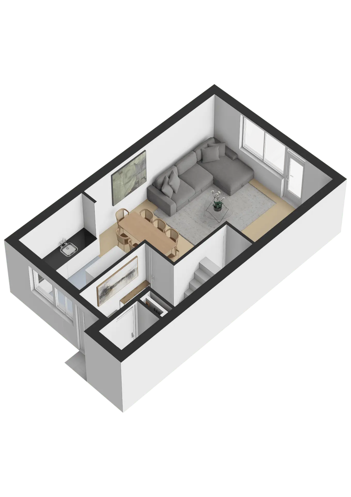 Op de begane grond bevinden zich de hal, toiletruimte en woonkamer met keuken.