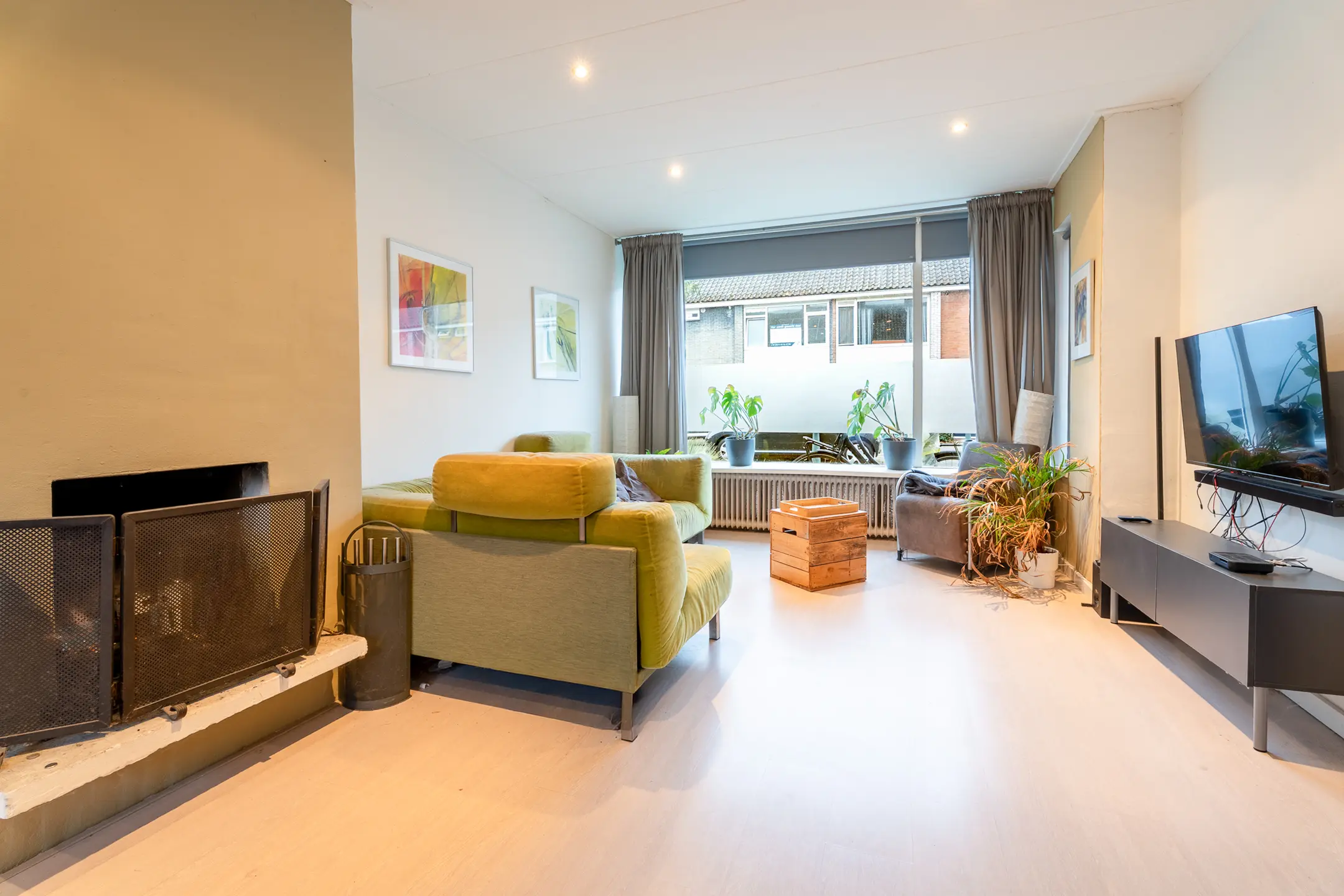 De lichte woonkamer heeft een laminaatvloer en door de erker aan de voorzijde is er extra ruimte in de woonkamer. Een fraaie open haard zorgt voor extra sfeer op koudere dagen.