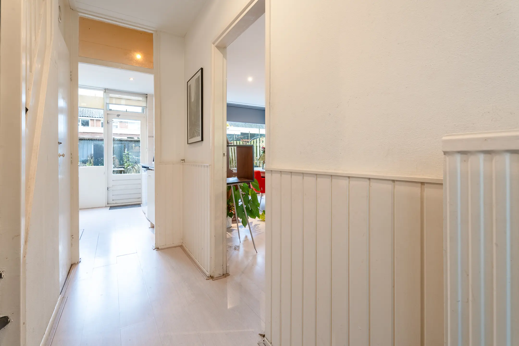 Via de entree kom je in de hal van de woning, welke voorzien is van laminaat. De toiletruimte is geheel betegeld en voorzien van een staand toilet met een fonteintje.