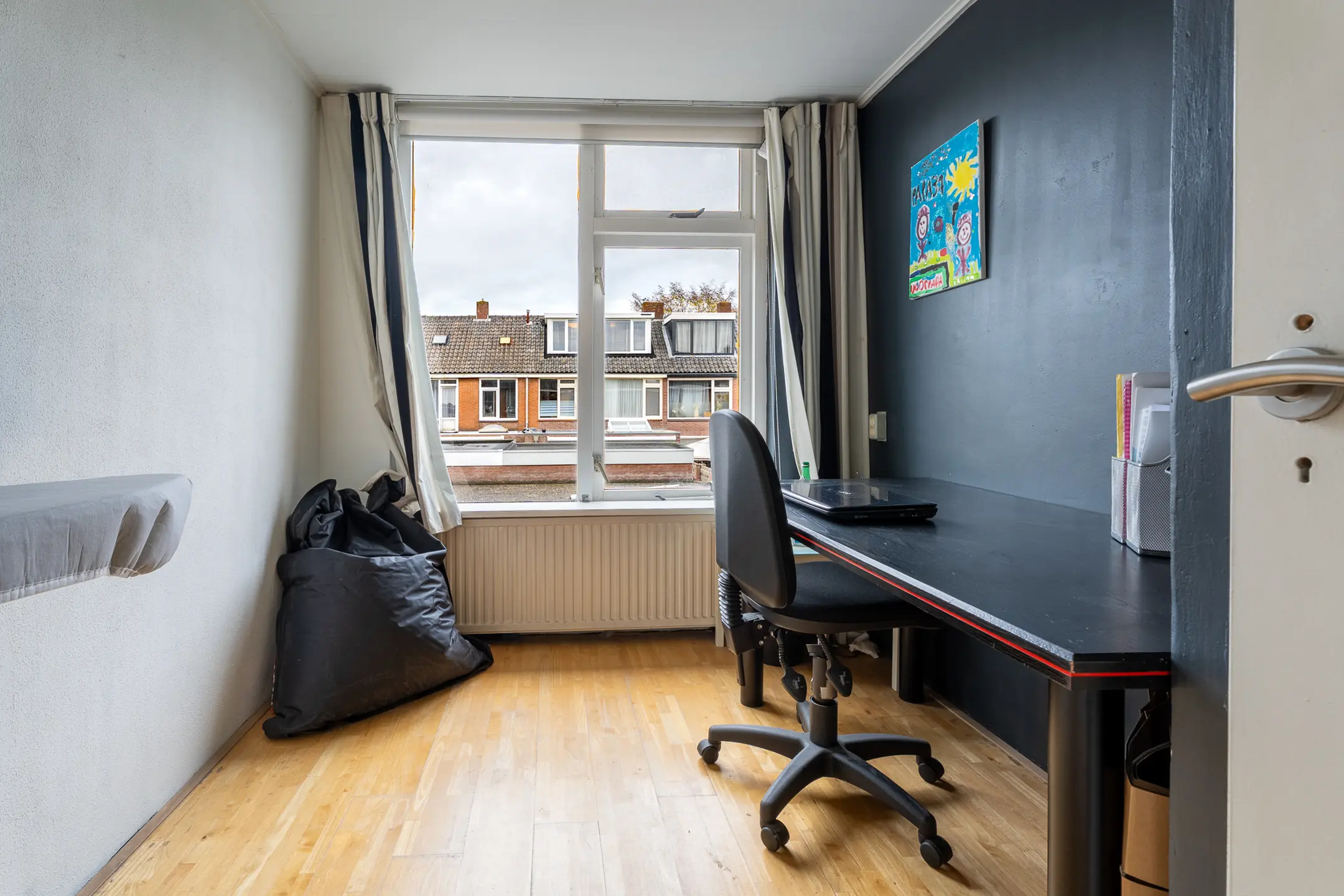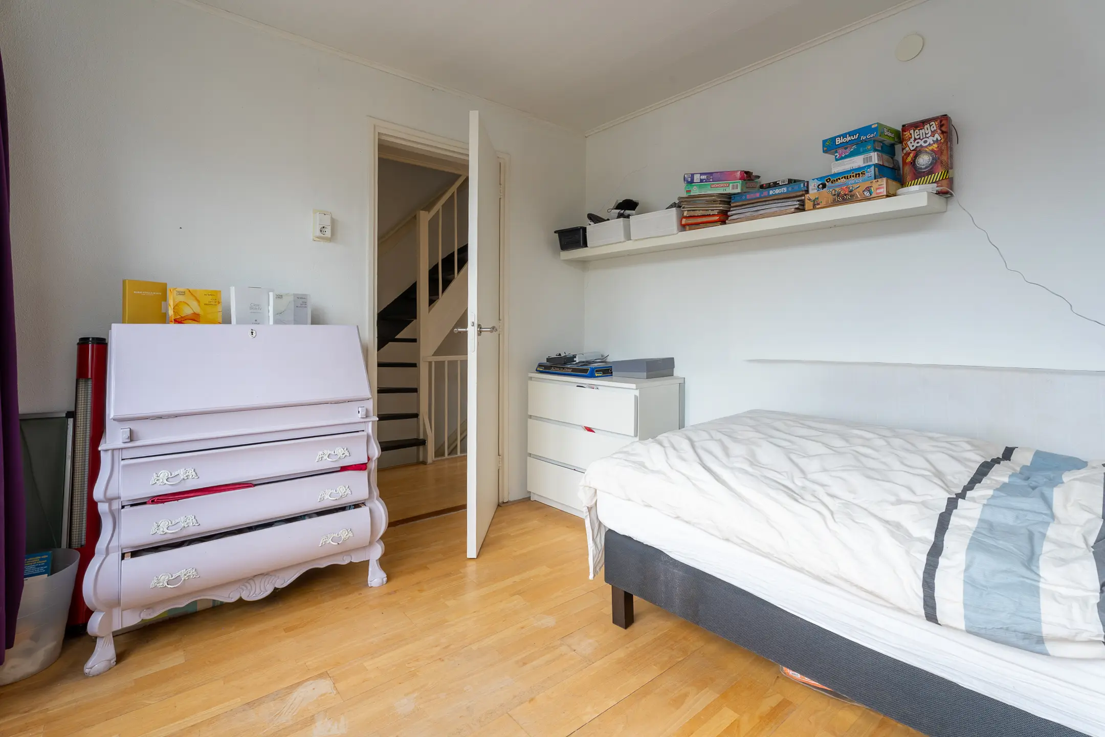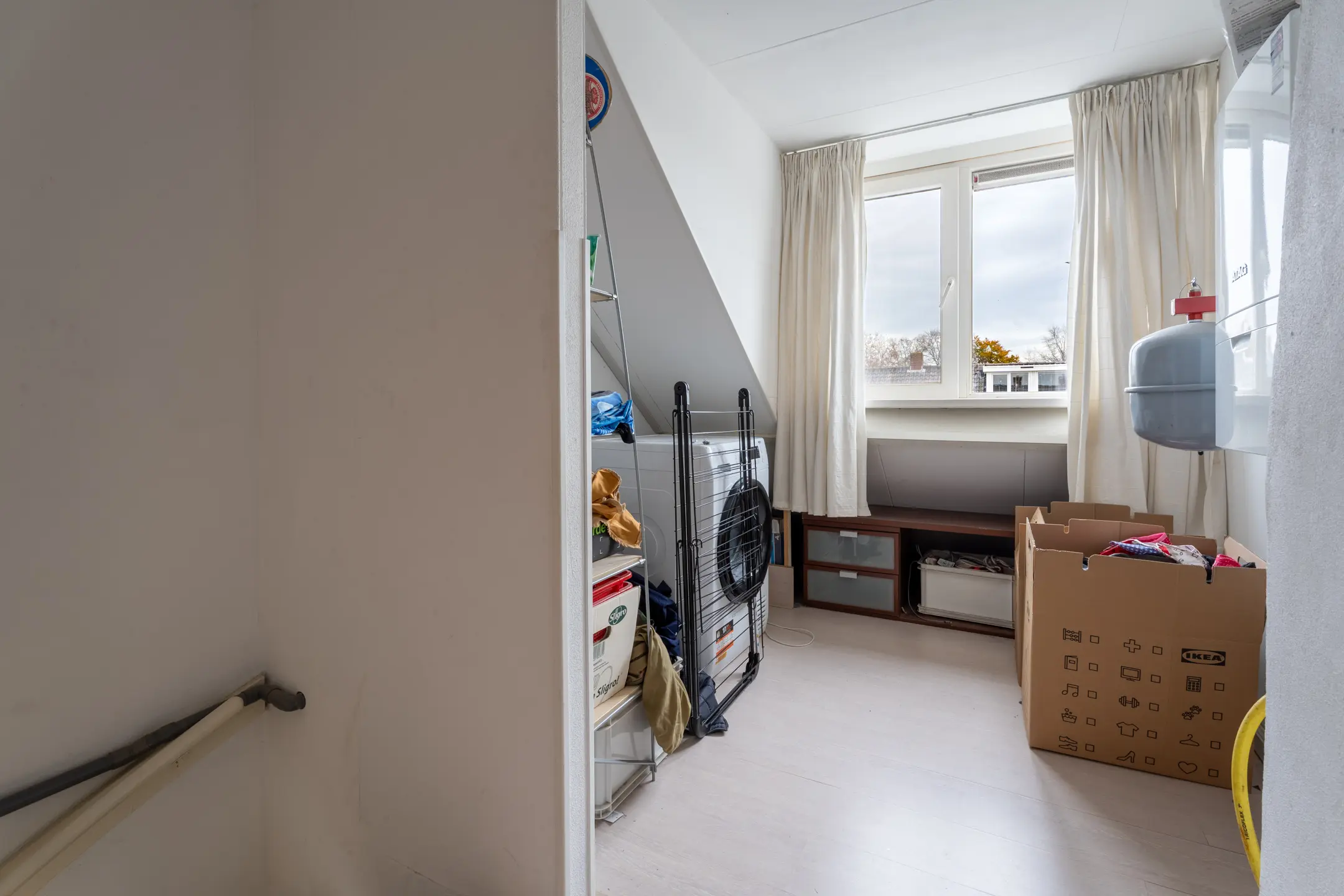 Op de overloop is de aansluiting voor de wasapparatuur en de cv-ketel. De slaapkamer is voorzien van een tapijt en een royale kunststof dakkapel.