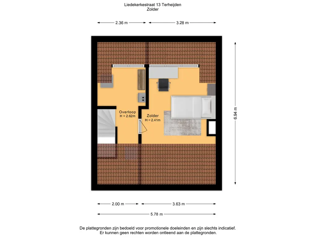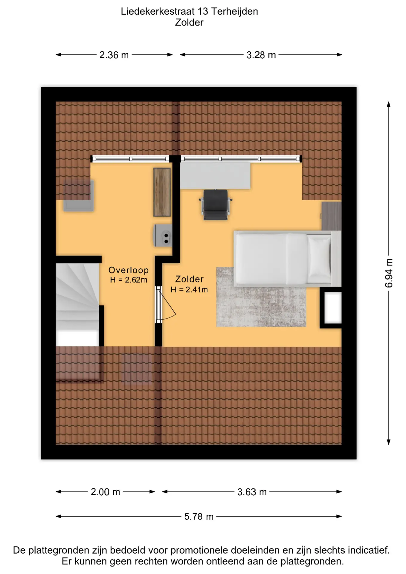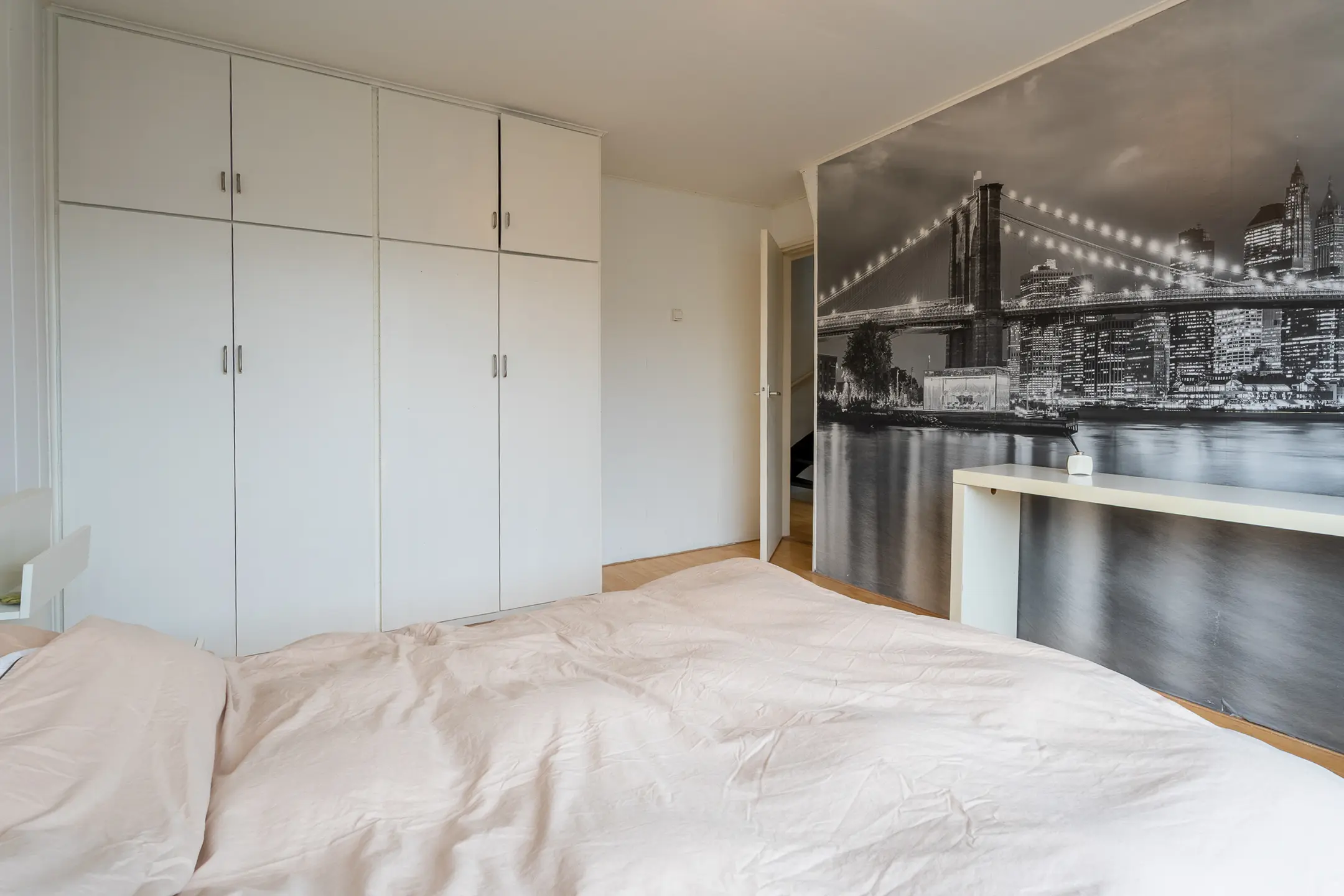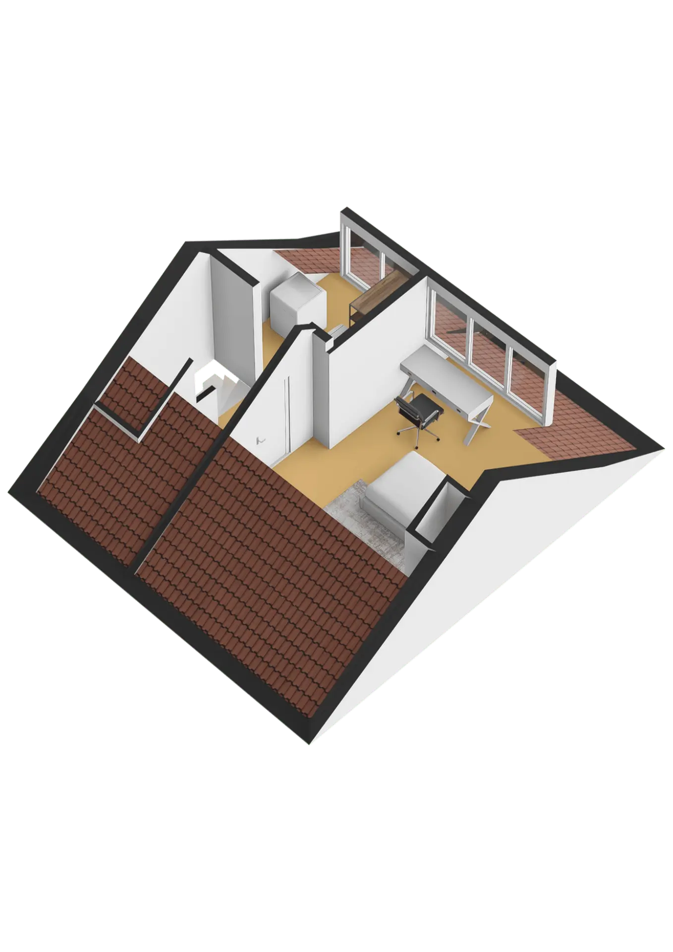 Op de overloop is de aansluiting voor de wasapparatuur en de cv-ketel. De slaapkamer is voorzien van een tapijt en een royale kunststof dakkapel.