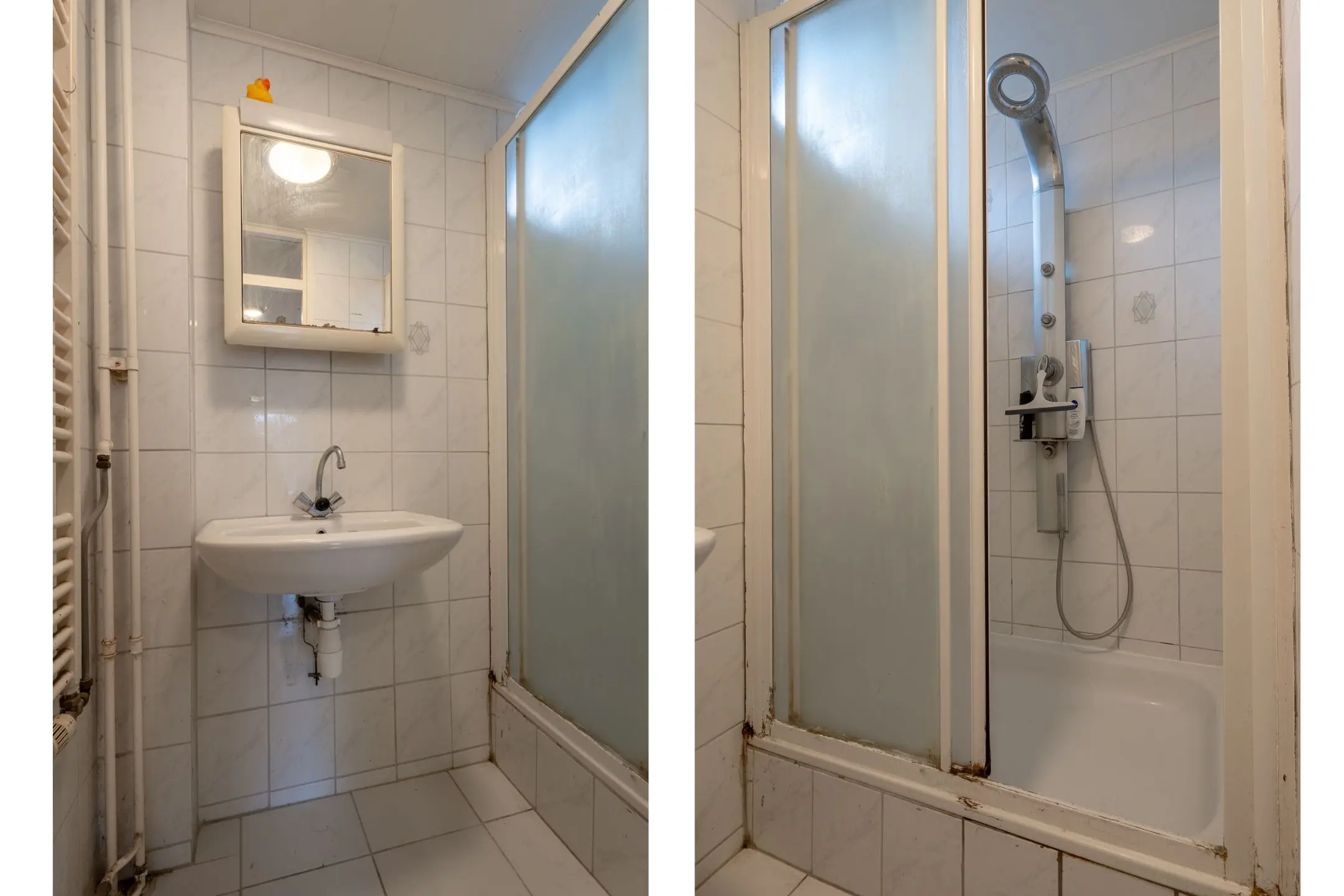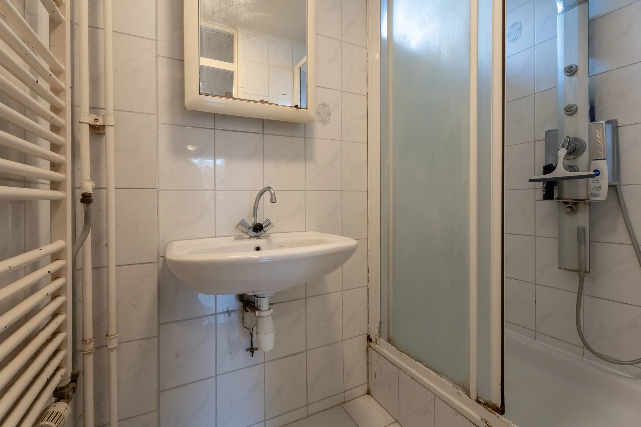 De eenvoudige badkamer is geheel betegeld en voorzien van een douchecabine en wastafel.
