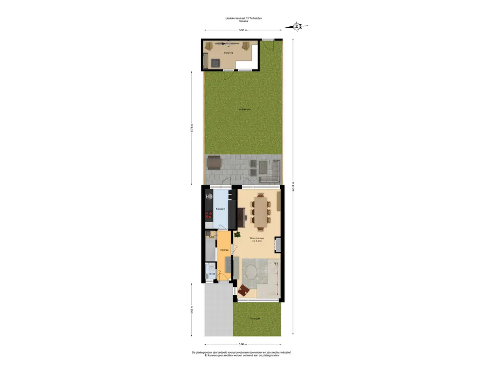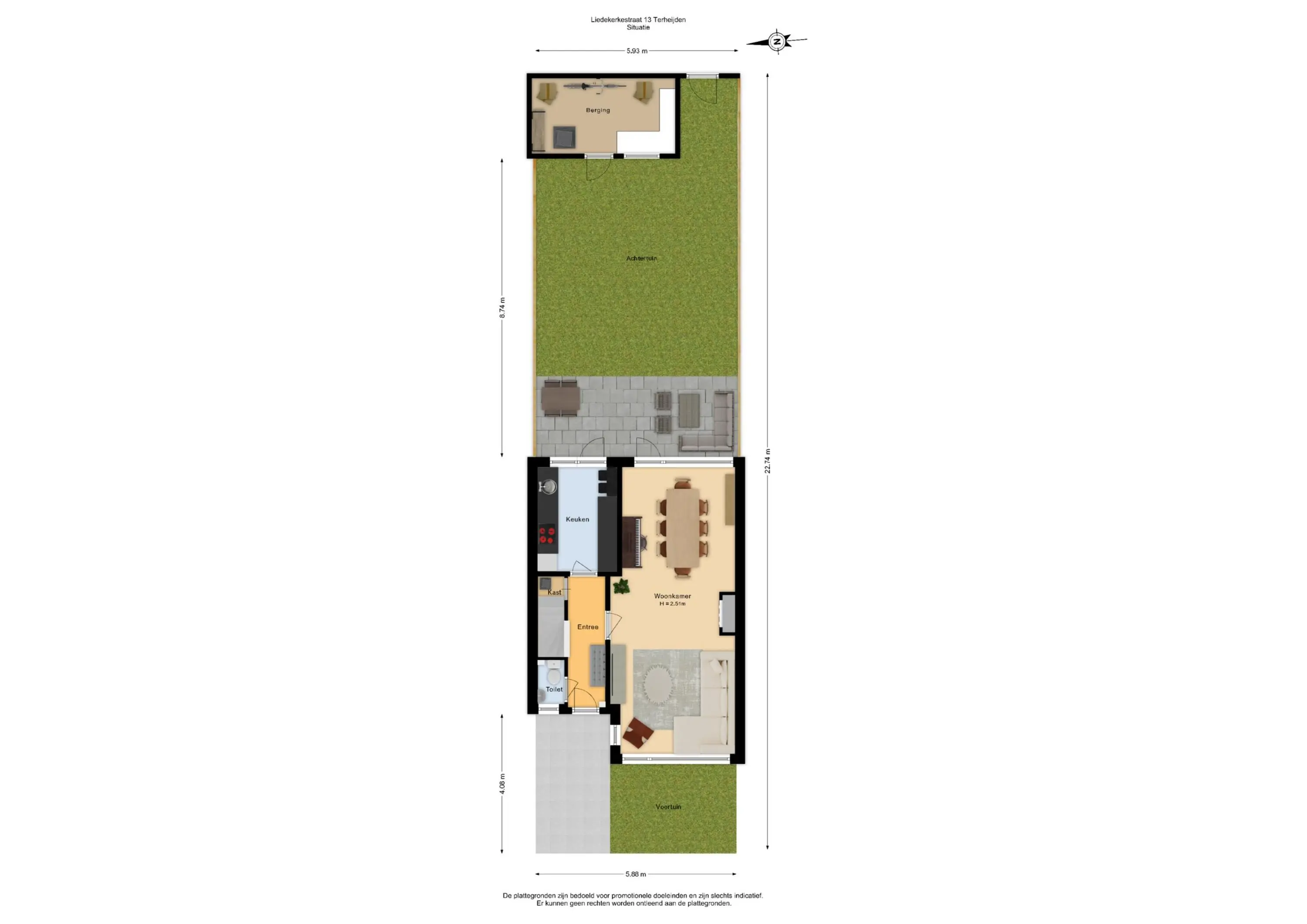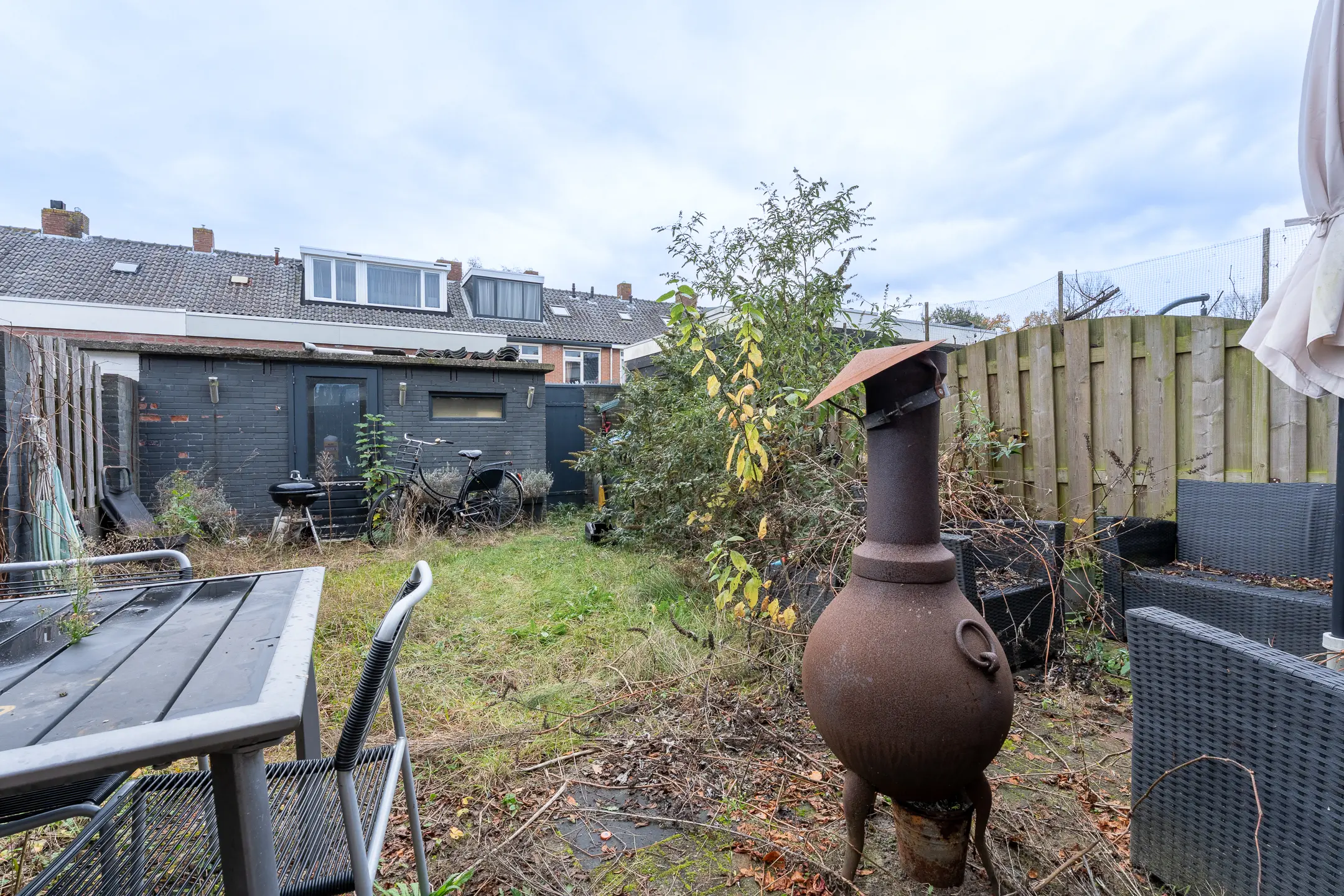 De tuin is gelegen op het oosten en zuiden. De vrijstaande stenen berging is gelegen achterin de tuin. Via een poort is de brandgang bereikbaar.