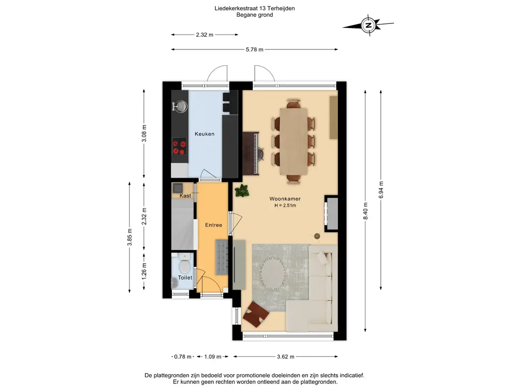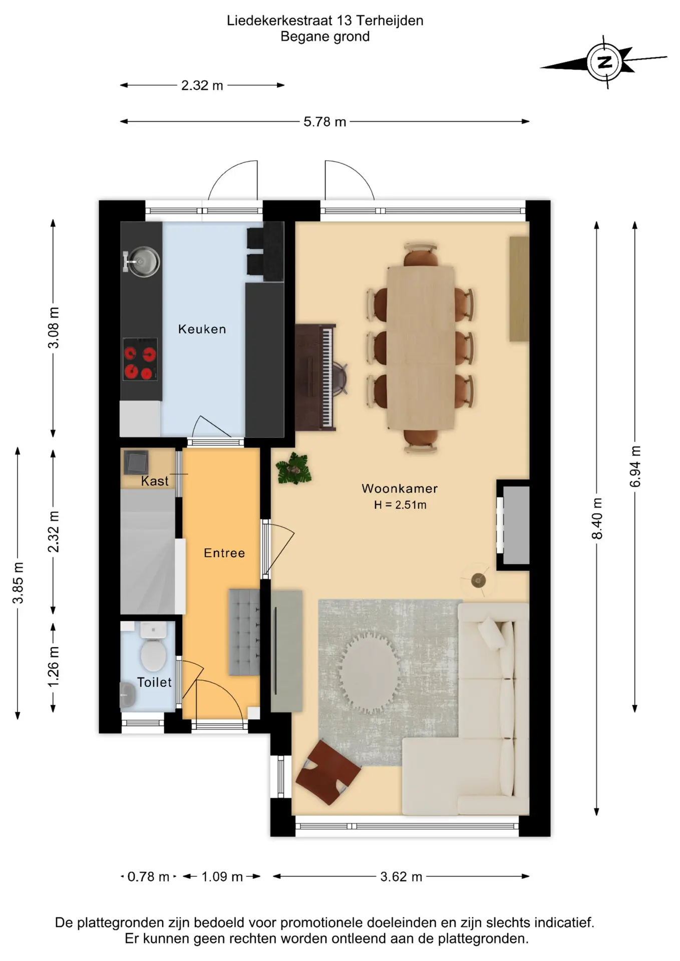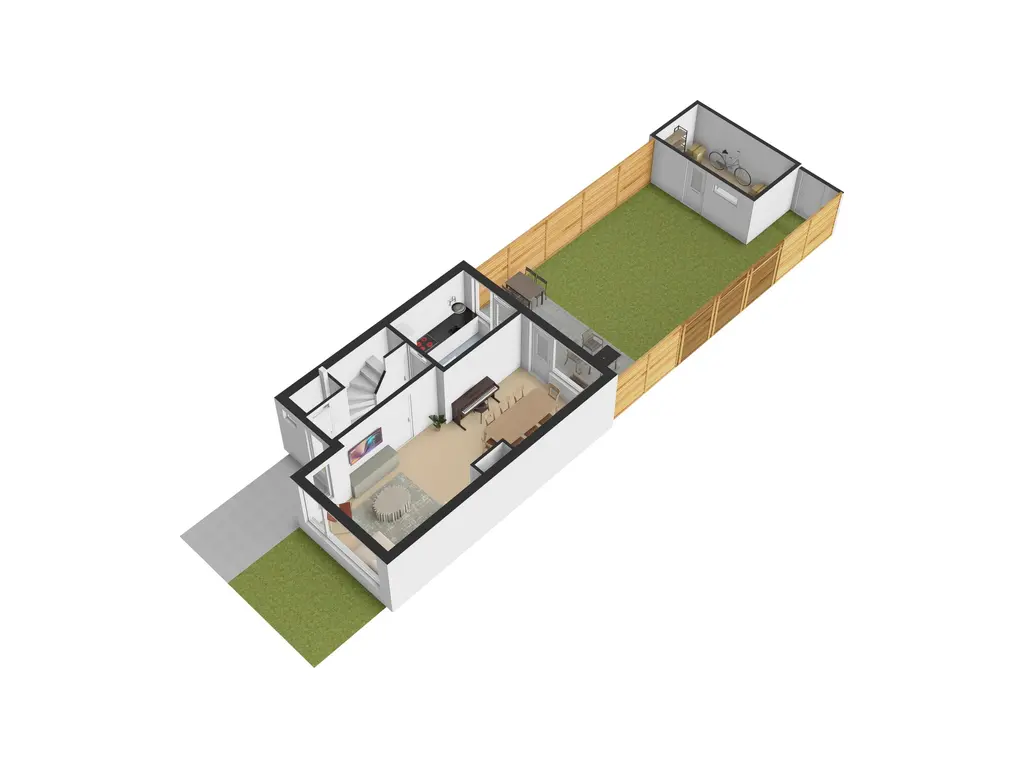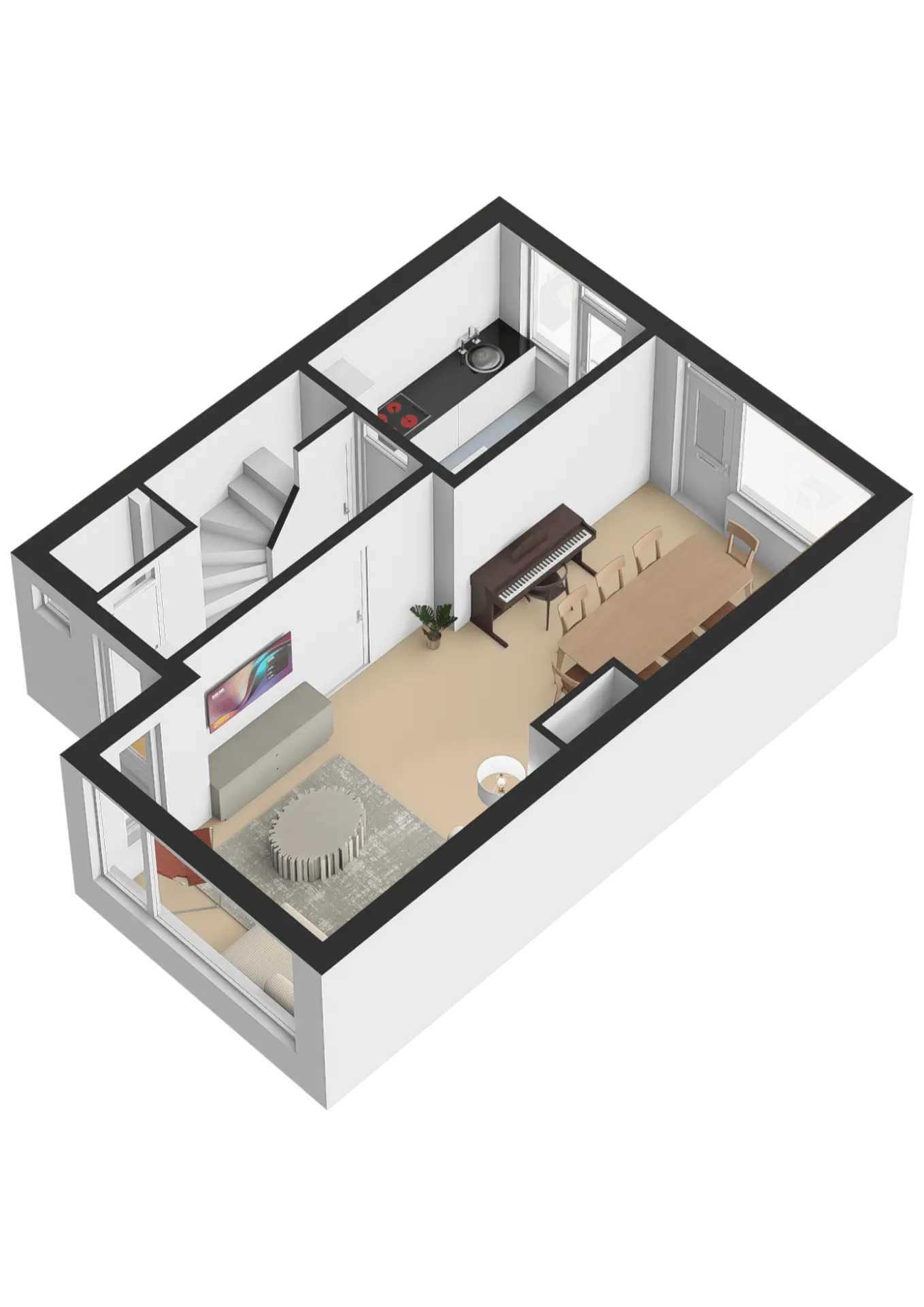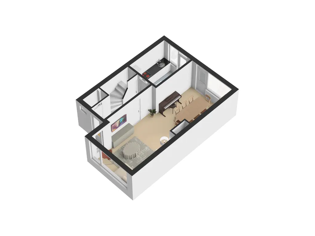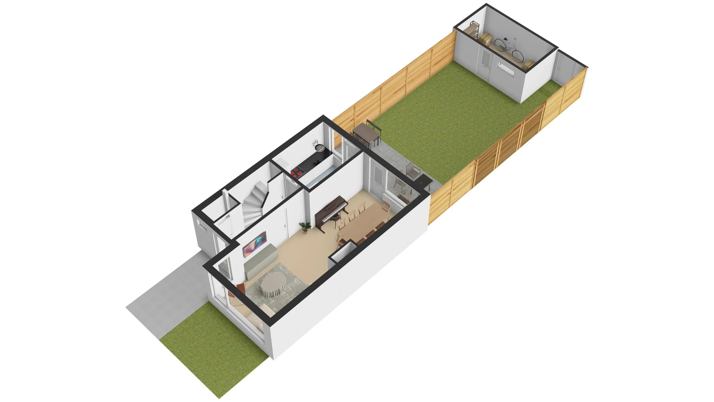 Op de begane grond bevinden zich de hal, de toiletruimte, de woonkamer en de keuken.