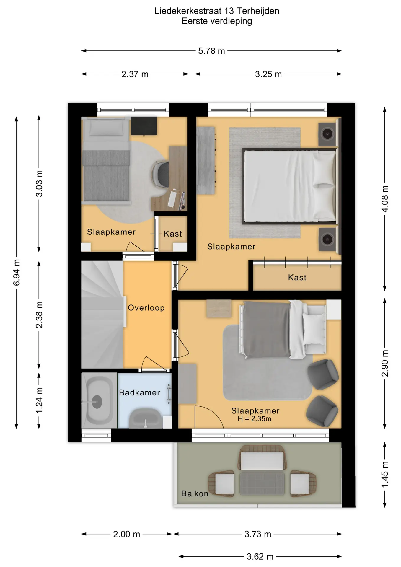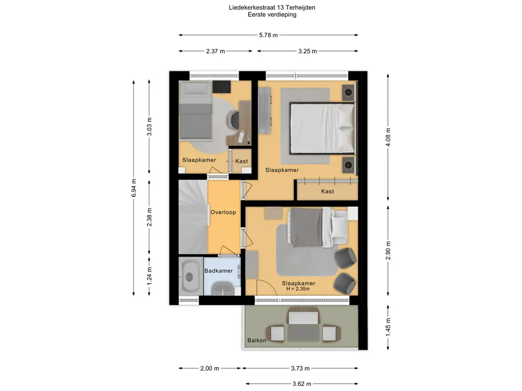 Op de eerste verdieping is de overloop, drie ruime slaapkamers en de badkamer.