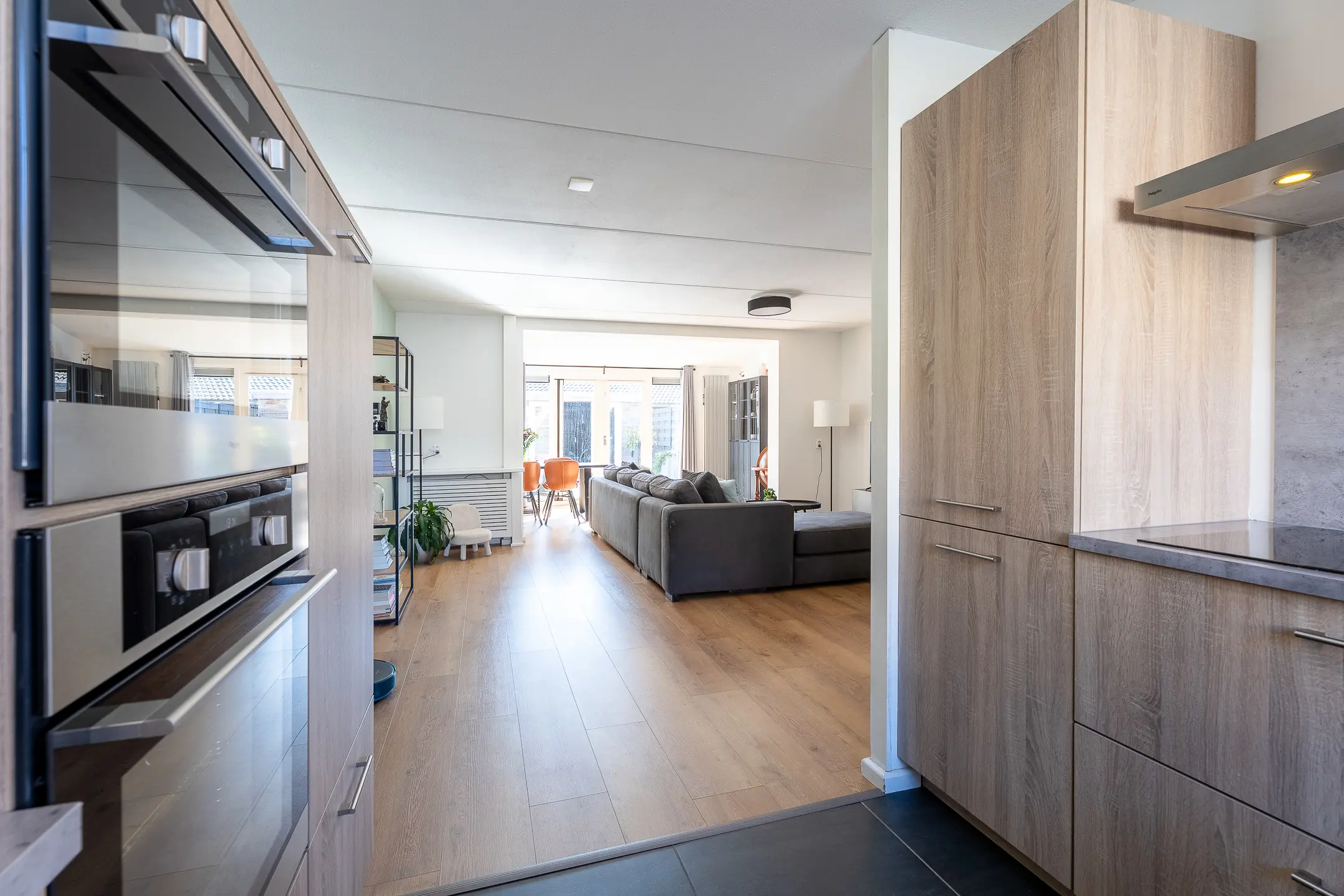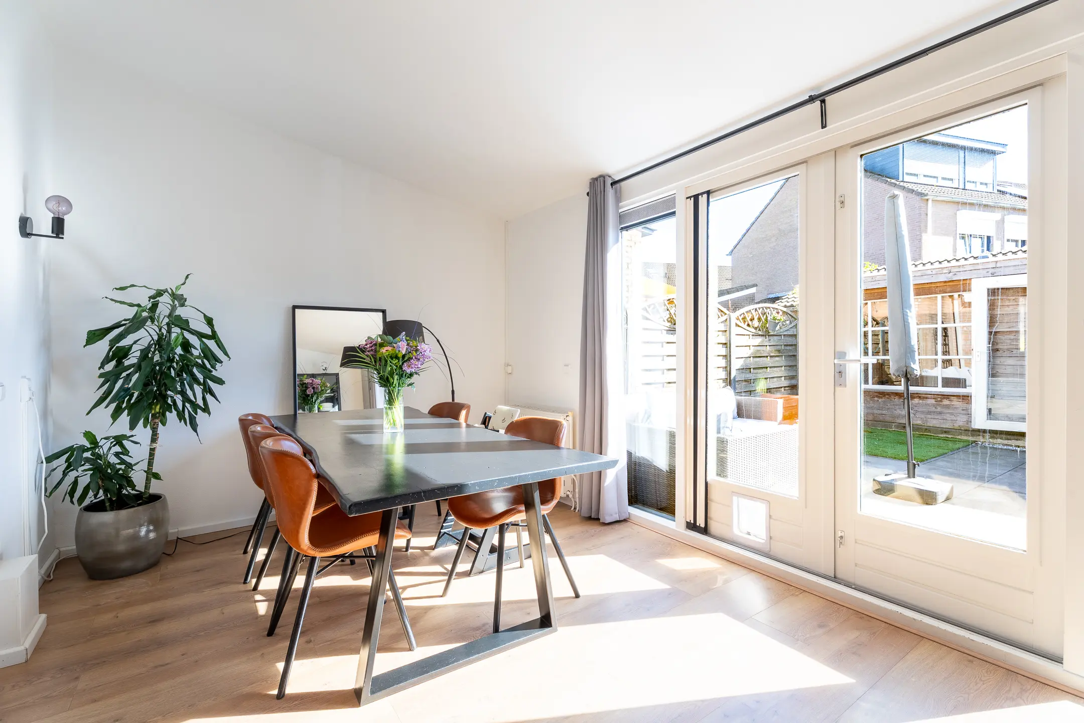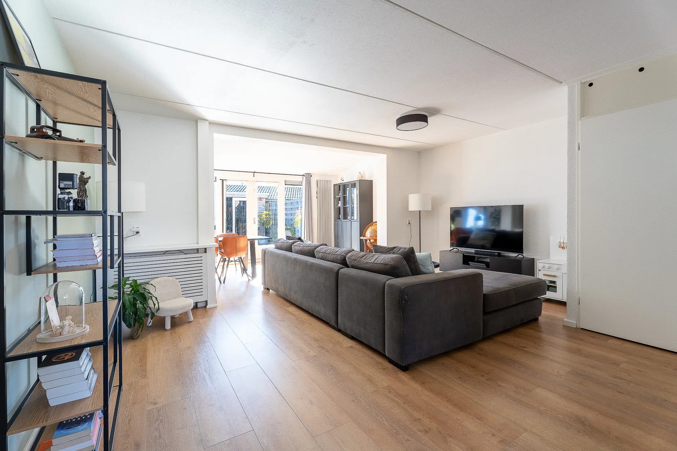 De ruime lichte woonkamer is aan de achterzijde uitgebouwd. Je hebt hierdoor een gezellige centrale zithoek en ruime eetkamer. De woonkamer heeft een lichte laminaatvloer en de wanden zijn afgewerkt met spachtelputz en stucwerk. Via openslaande tuindeuren bereik je de achtertuin.