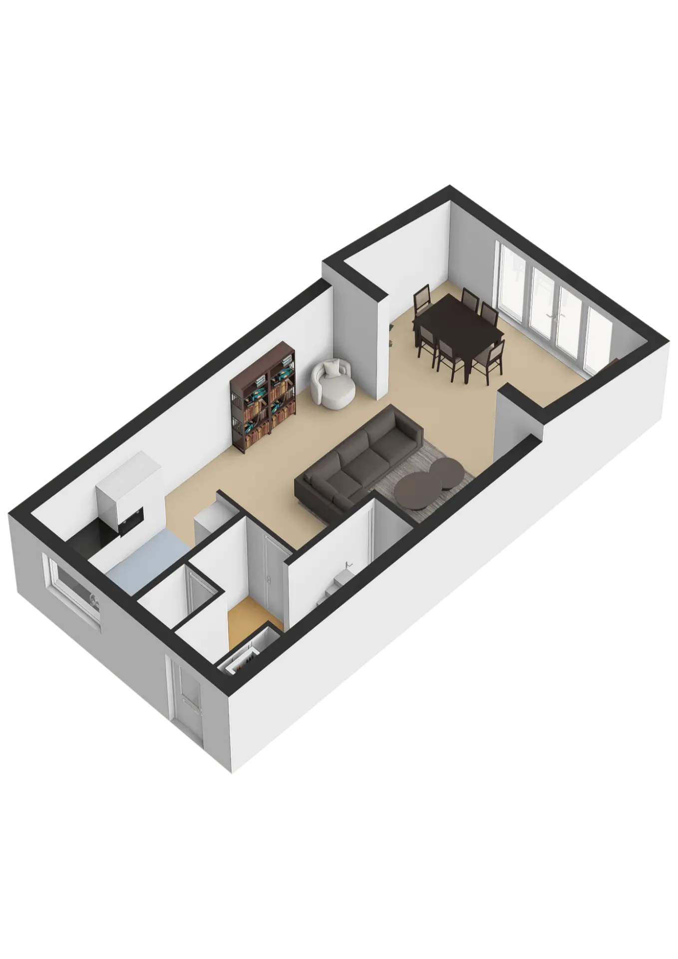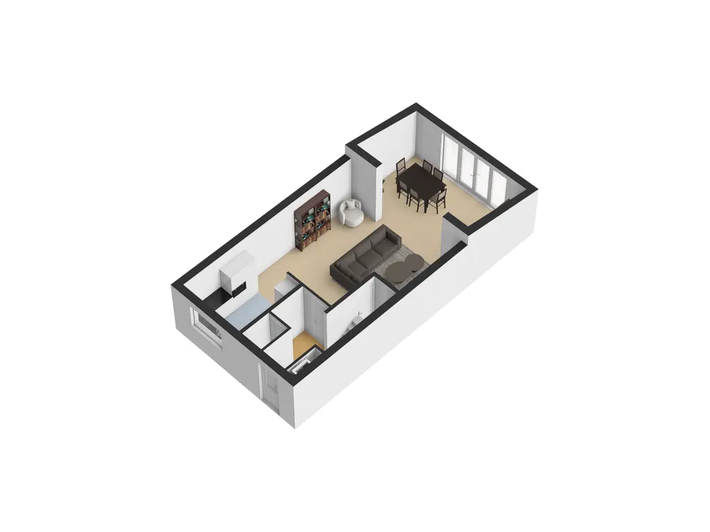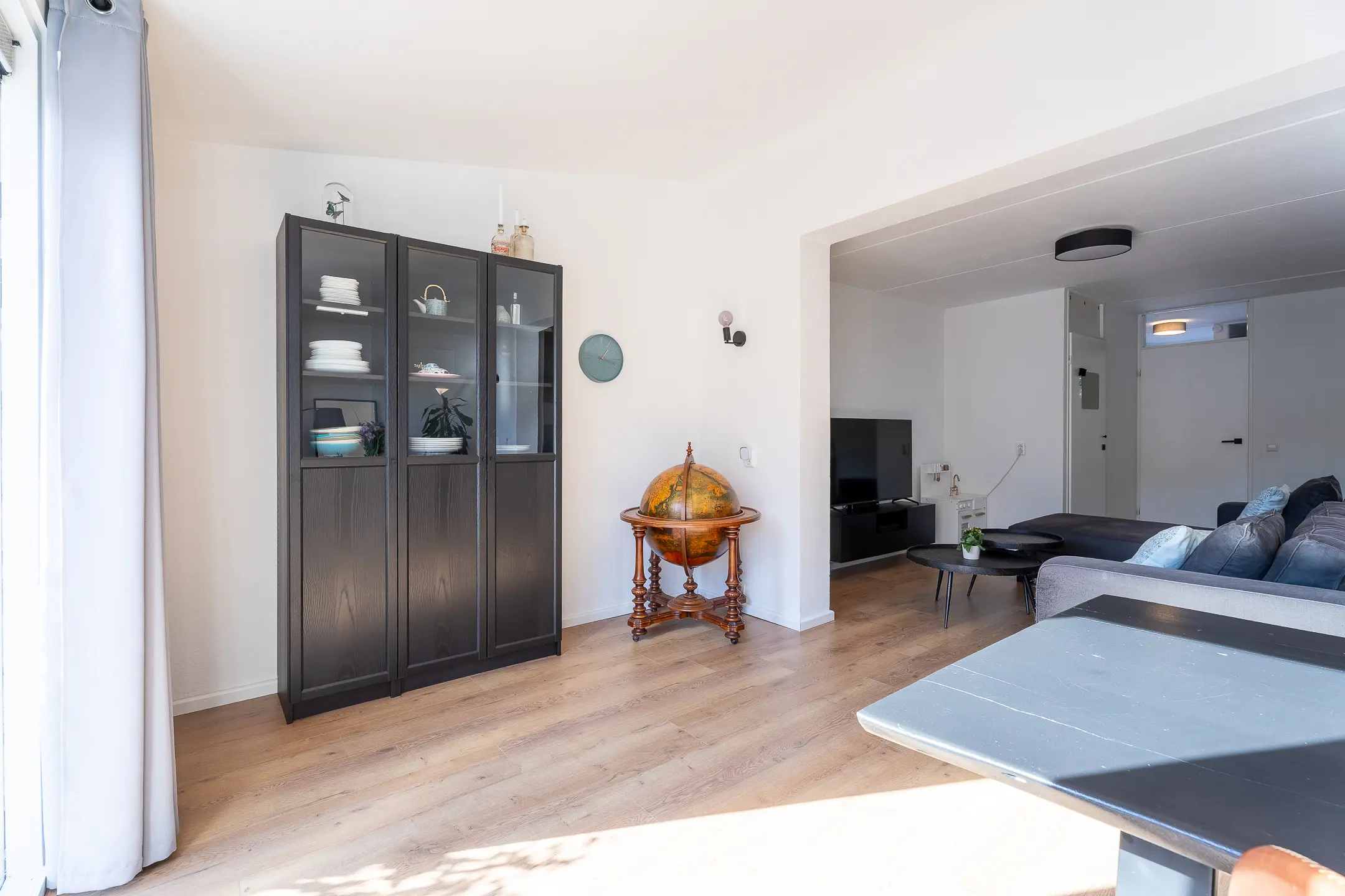 De ruime lichte woonkamer is aan de achterzijde uitgebouwd. Je hebt hierdoor een gezellige centrale zithoek en ruime eetkamer. De woonkamer heeft een lichte laminaatvloer en de wanden zijn afgewerkt met spachtelputz en stucwerk. Via openslaande tuindeuren bereik je de achtertuin.