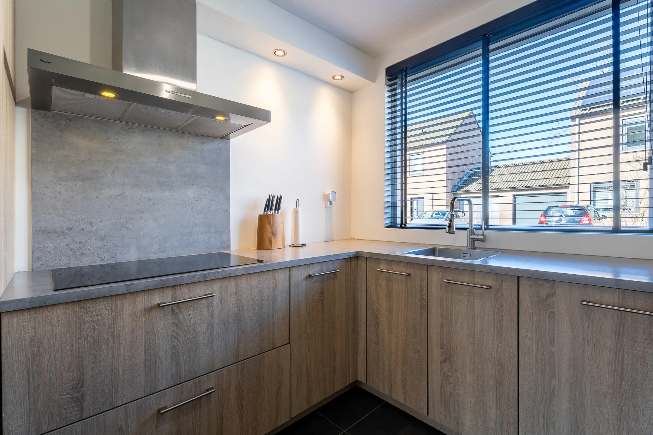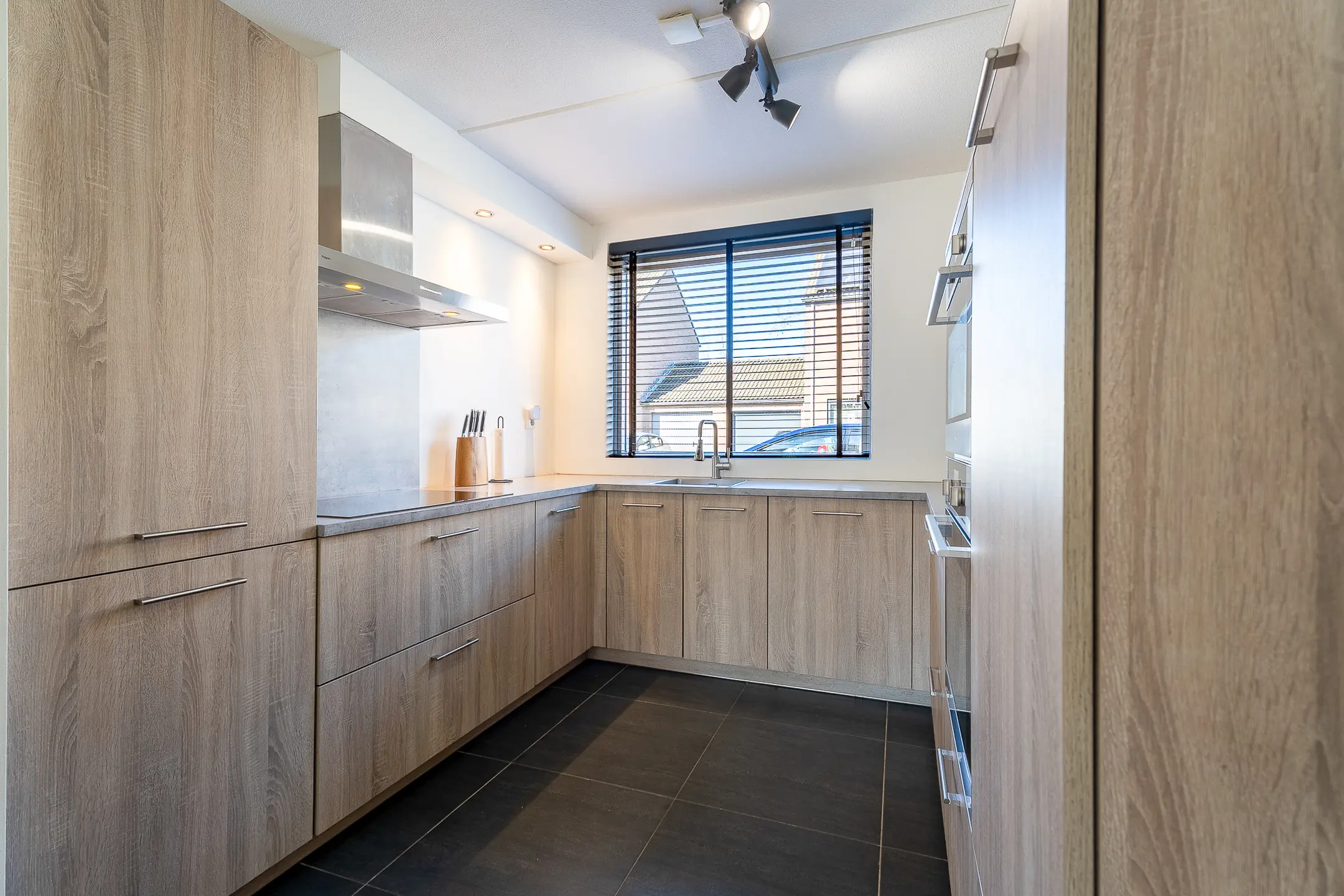 De moderne keuken is gelegen aan de voorzijde van de woning. De keuken is in een complete U-inrichting voorzien van kunststof werkblad met RVS spoelbak met ééngreepsmengkraan, een inductie kookplaat, afzuigkap, koel-/vriescombinatie, rvs oven, rvs combi oven met magnetronfunctie en vaatwasmachine en veel kastruimte en lades.