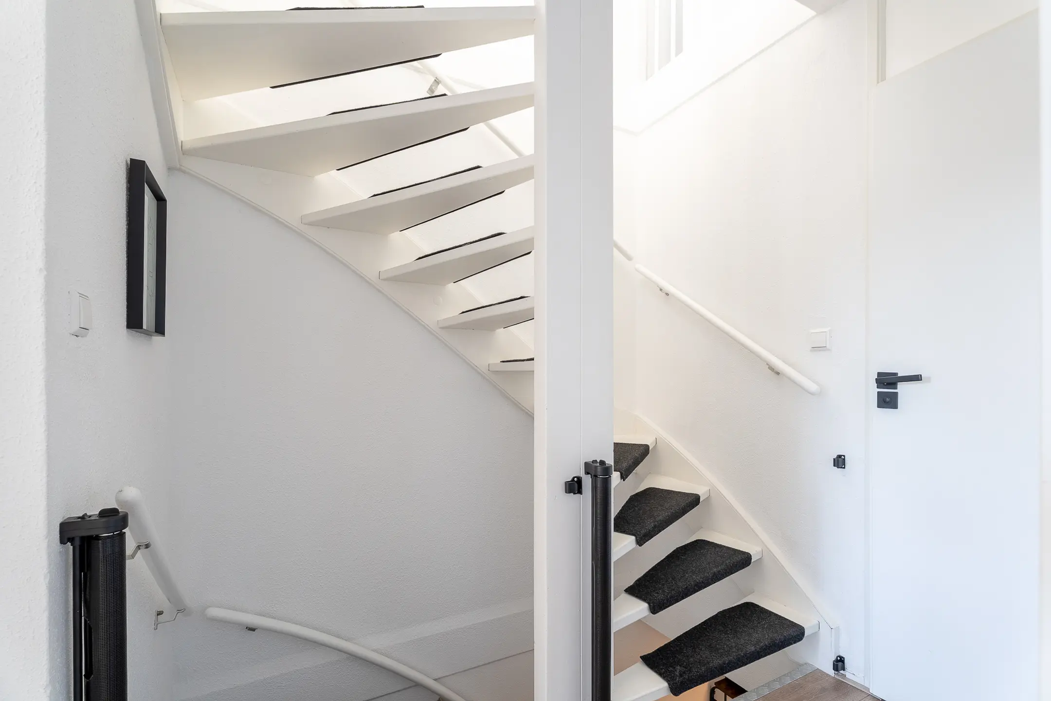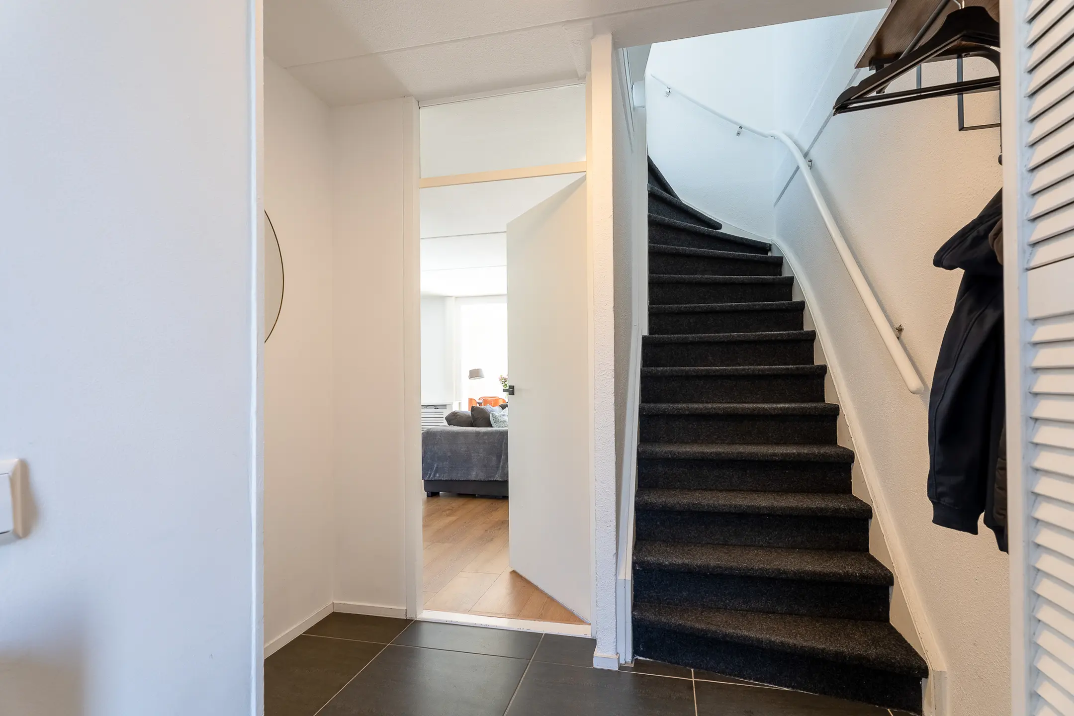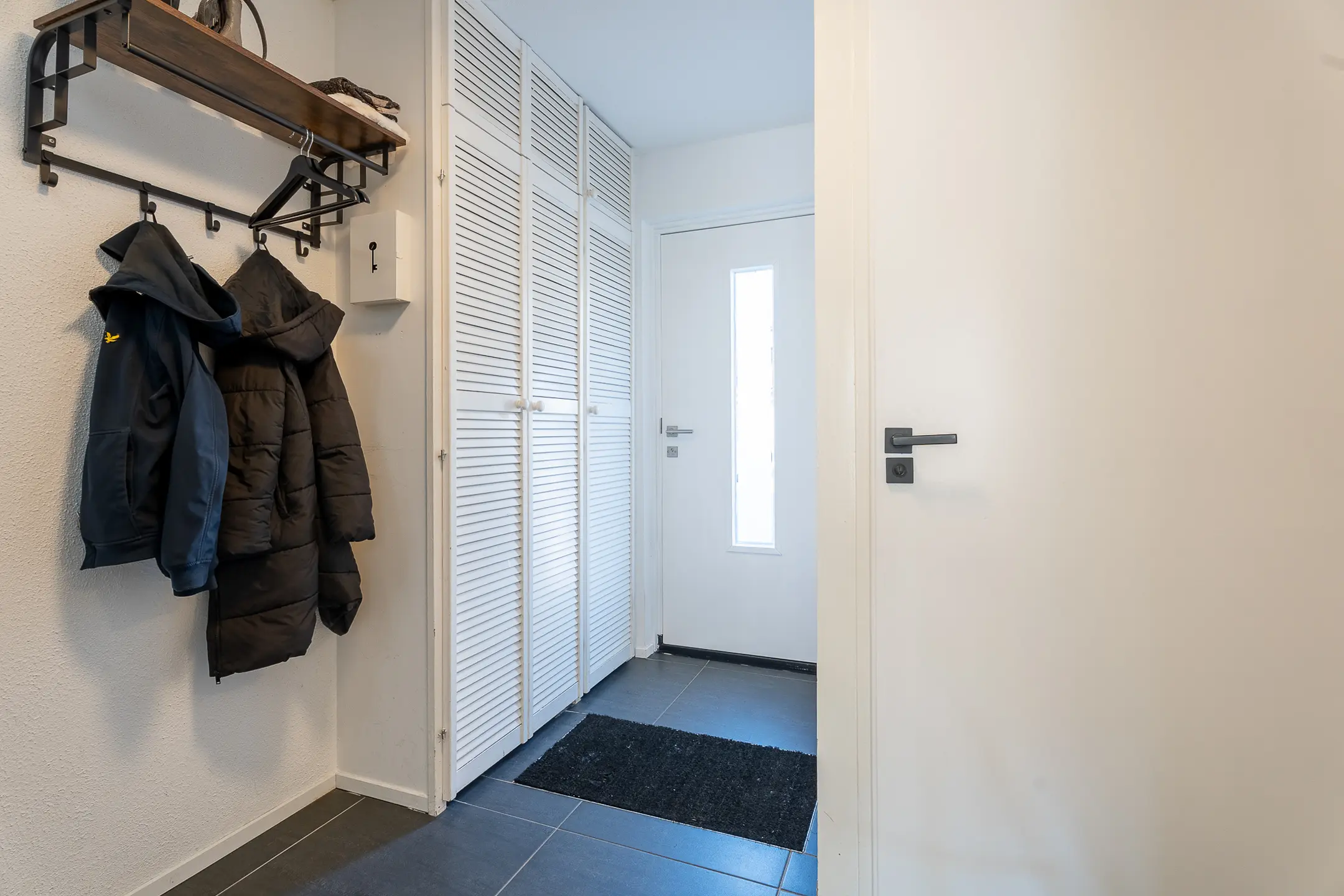 Via de entree kom je in de hal van de woning. De hal is afgewerkt met een tegelvloer en stucwerk. De meterkast is voorzien van 9 groepen met 3 aardlekschakelaars. De moderne toiletruimte is deels betegeld en voorzien van een zwevend toilet met fonteintje.