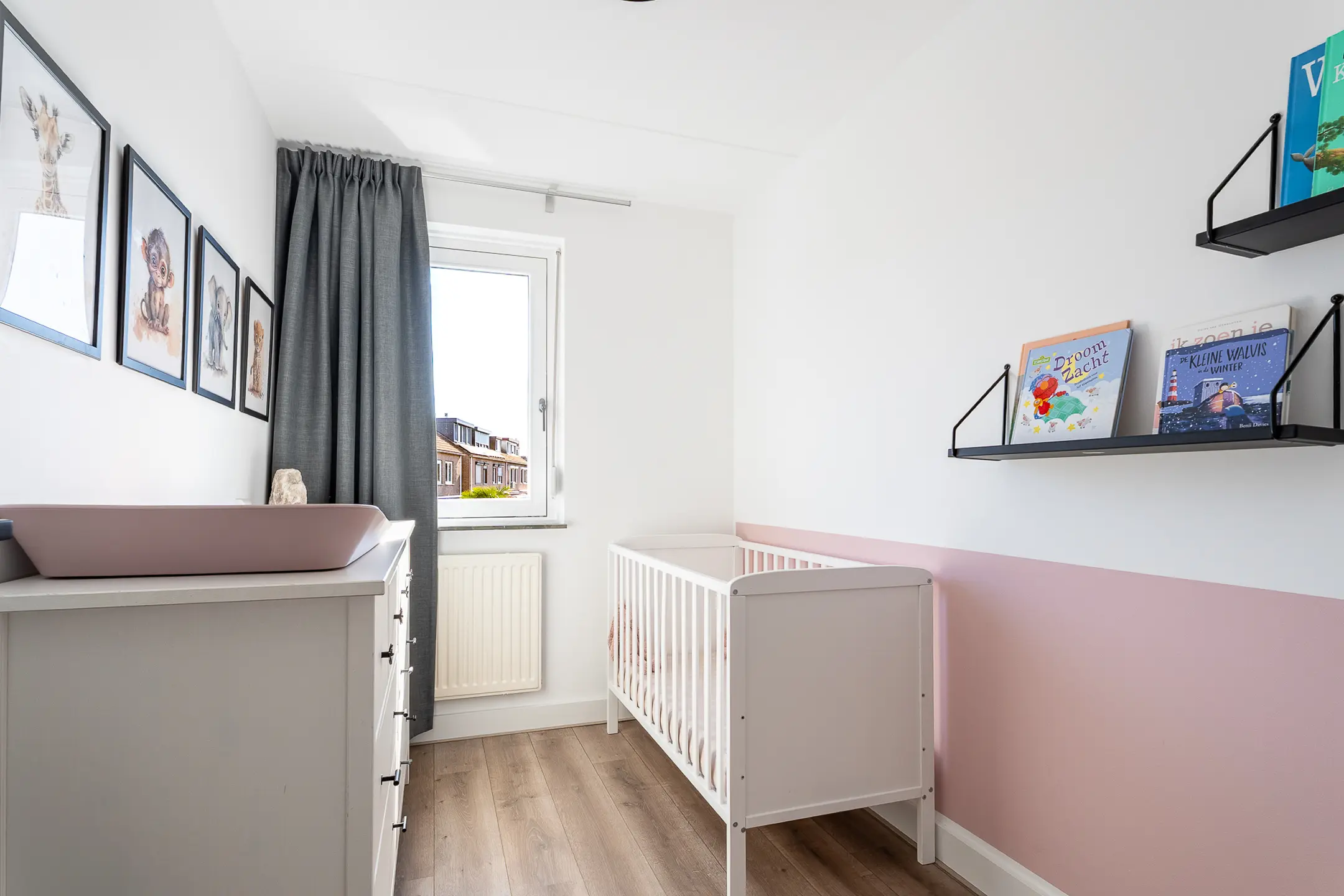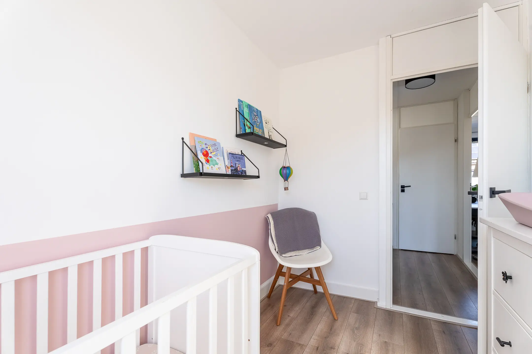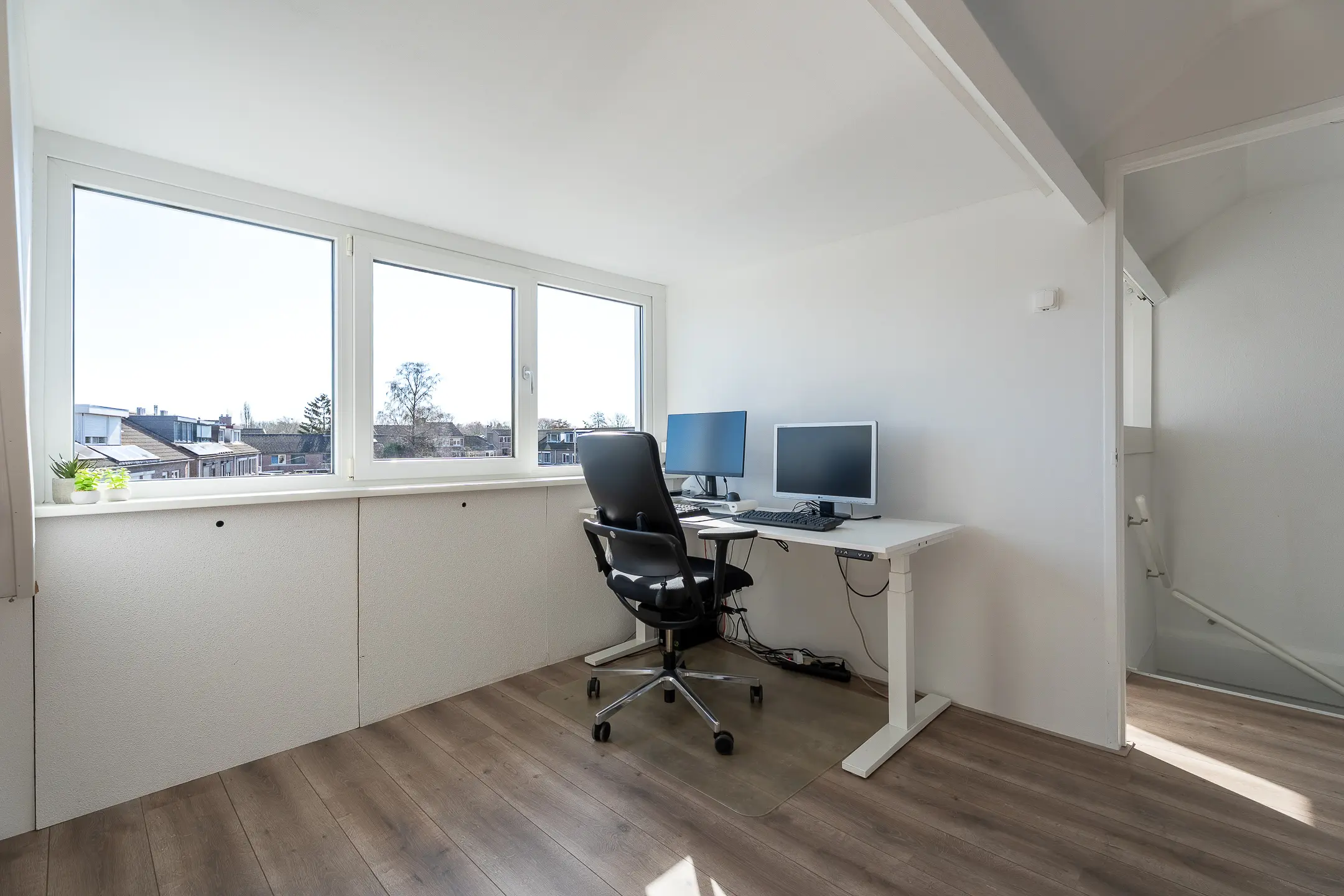 De royale tweede verdieping heeft aan de achterzijde een dakkapel over de hele breedte van de woning, veel licht en ruimte dus! Op de overloop is de aansluiting voor de wasapparatuur en is er extra bergruimte achter de knieschotten. Verder is hier de ruime vierde slaapkamer, afgewerkt met een laminaatvloer, inbouwspots en stucwerk.