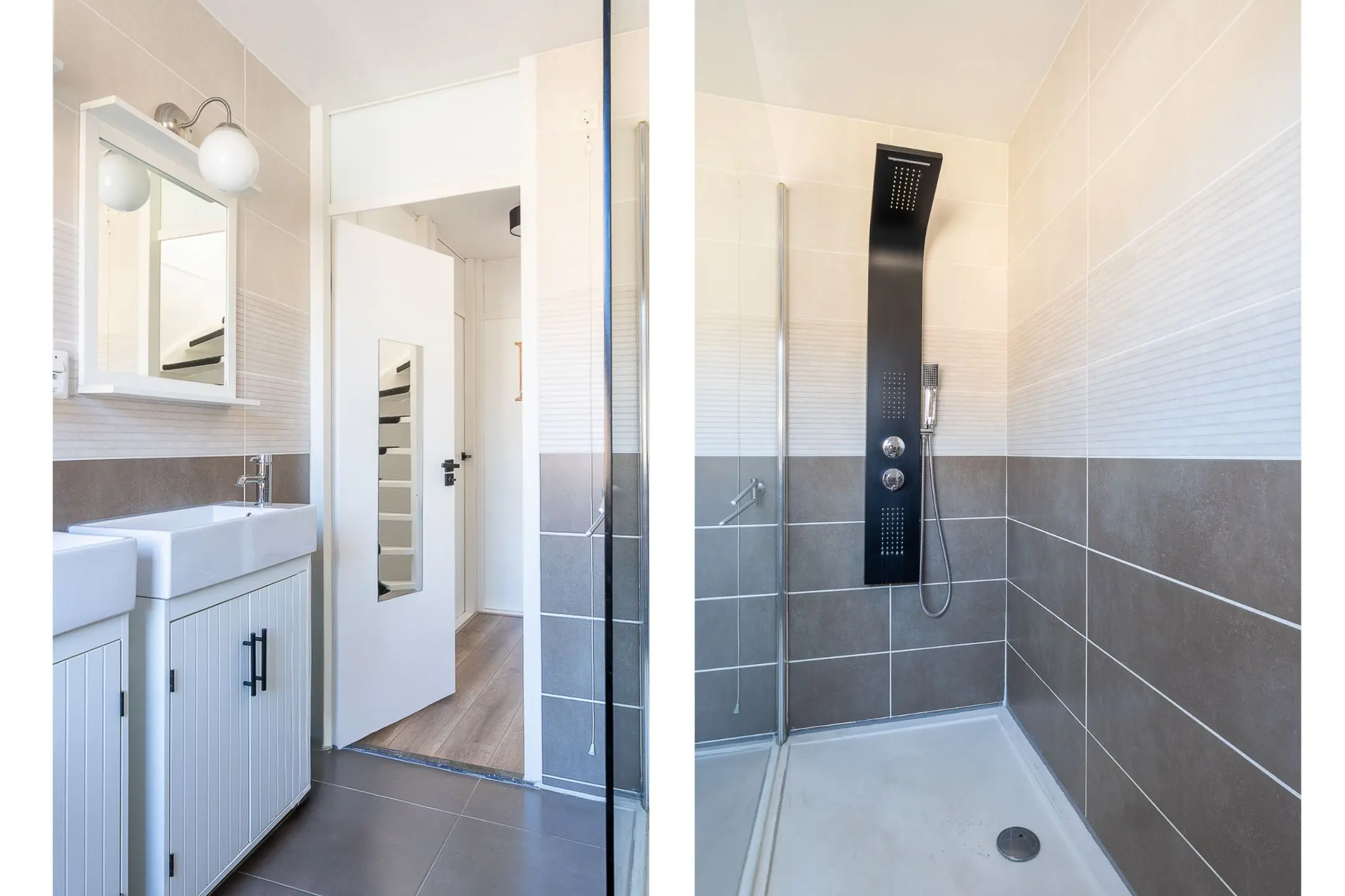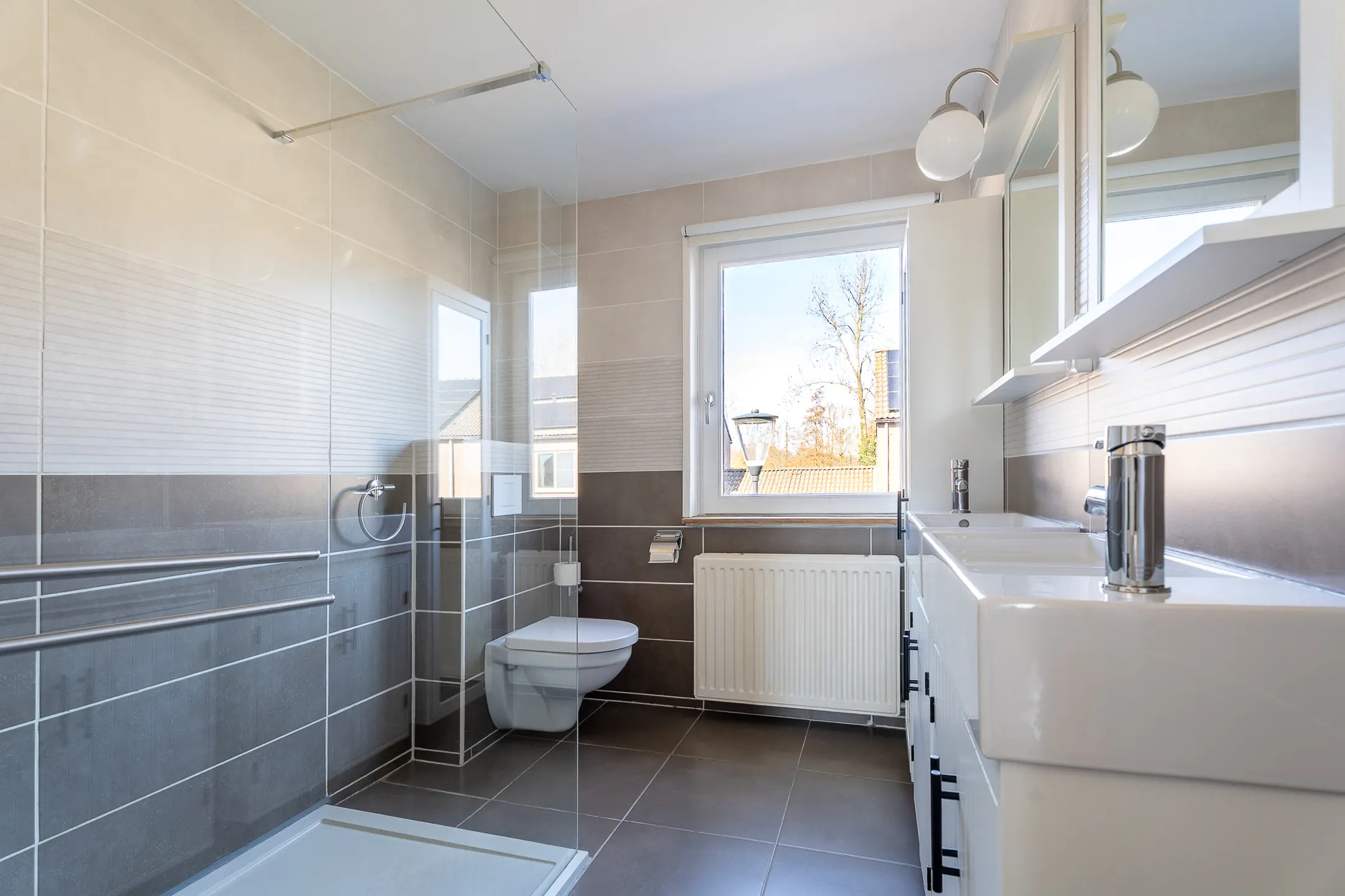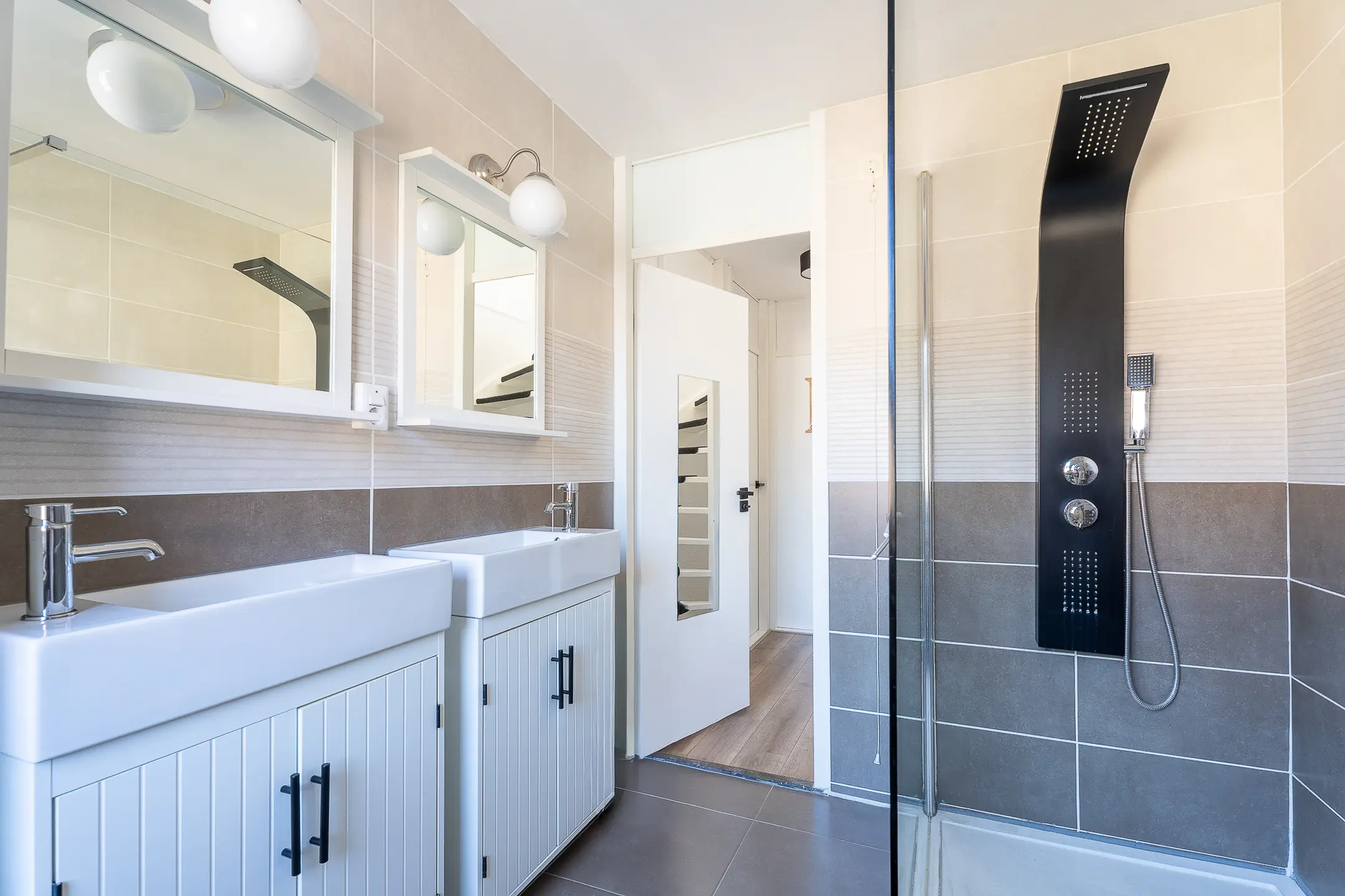 De luxe badkamer is geheel betegeld en ingericht met moderne vloer- en wandtegels, een inloopdouche met regendouche, een zwevend toilet en twee wastafelmeubels met spiegels.