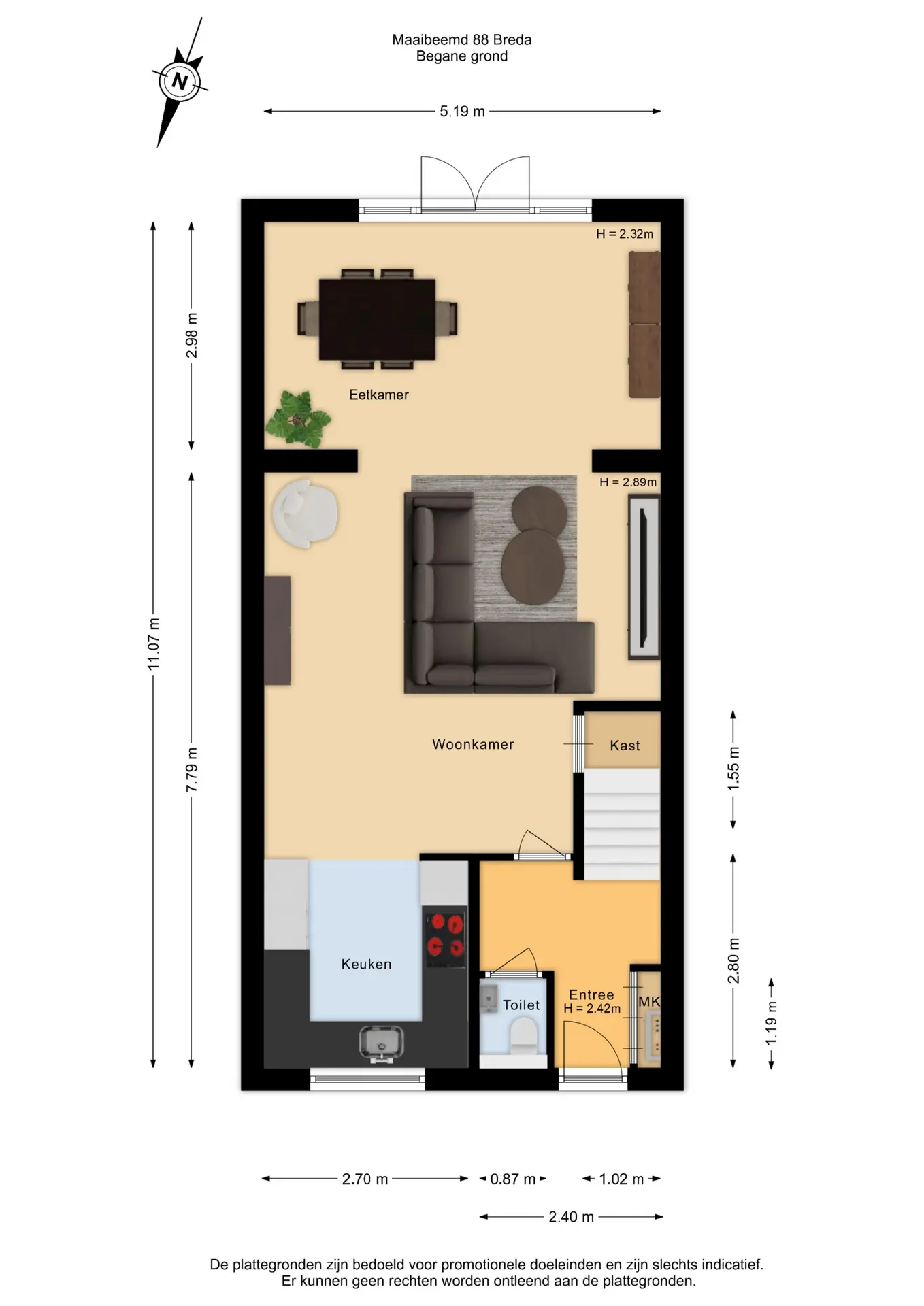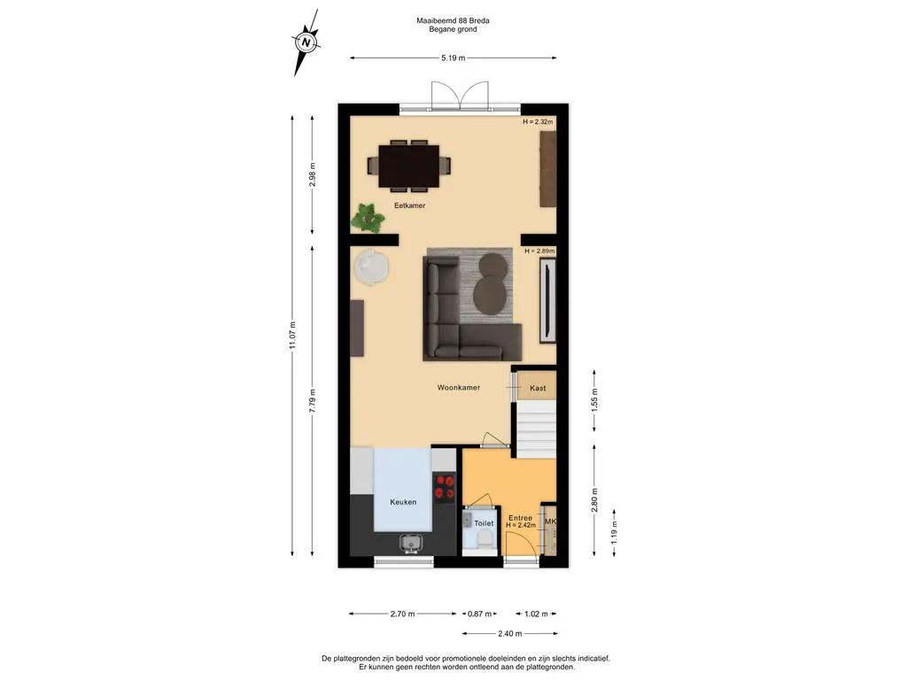 Op de begane grond bevinden zich de hal, toiletruimte, woonkamer en keuken.