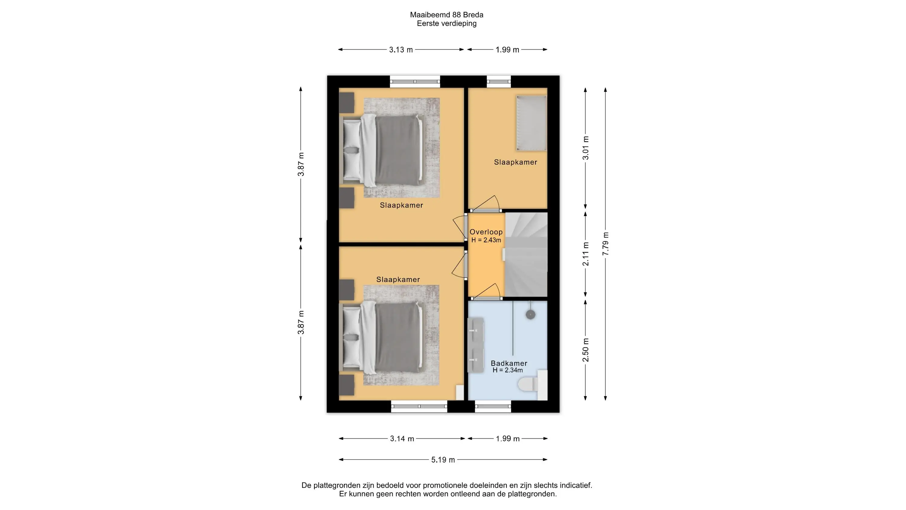 Op de eerste verdieping is de overloop, de badkamer en 3 slaapkamers.