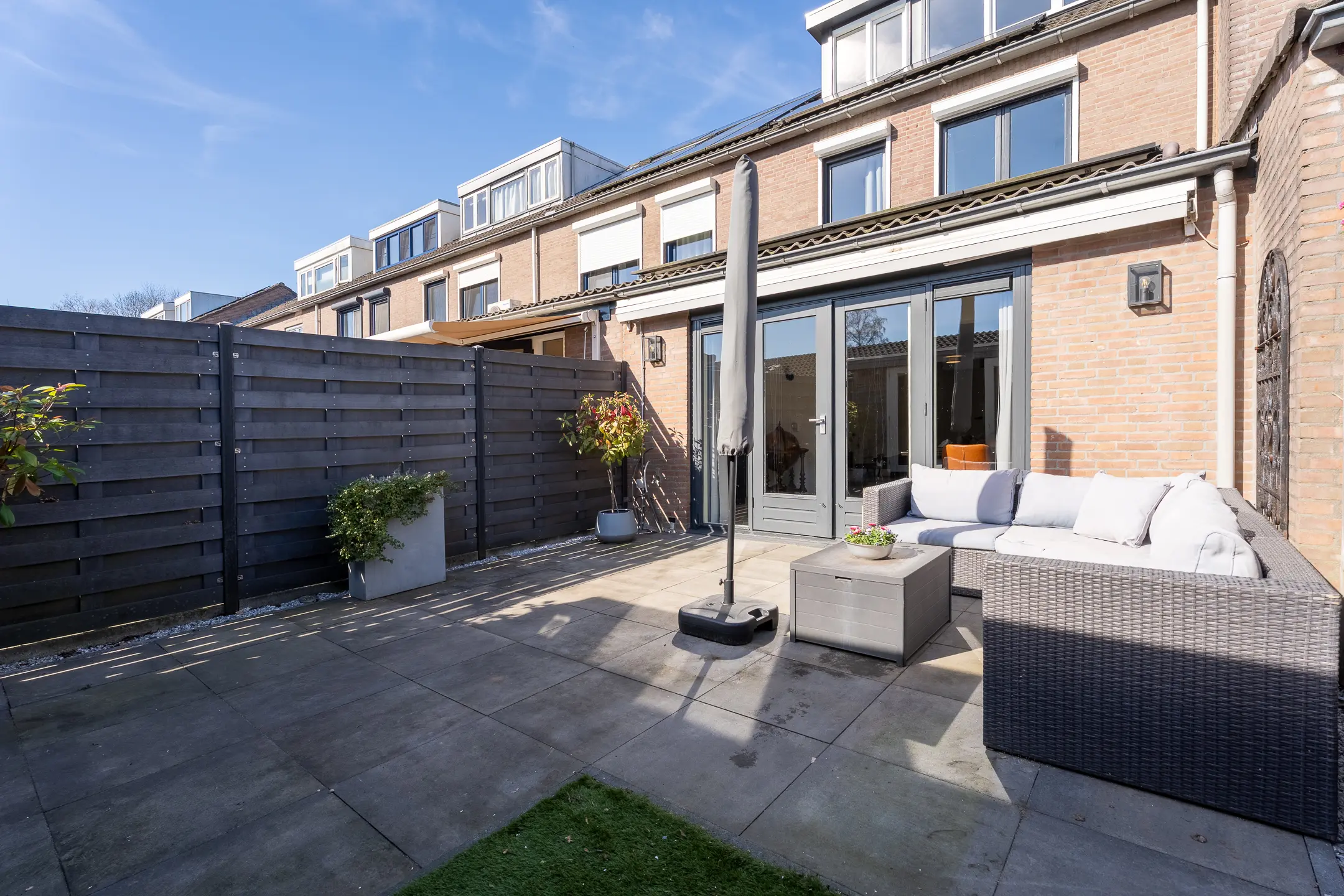 De achtertuin is ca. 6 meter diep tot aan de uitgebouwde tuinkamer en is gunstig gelegen op het zuiden. Indien de tuinkamer wordt weggehaald, wordt de tuin vergroot tot ca. 9 meter, tot aan de stenen berging met overkapping. De tuin is ingericht met een terras en kunstgras, er is een buitenkraan en een achterom.