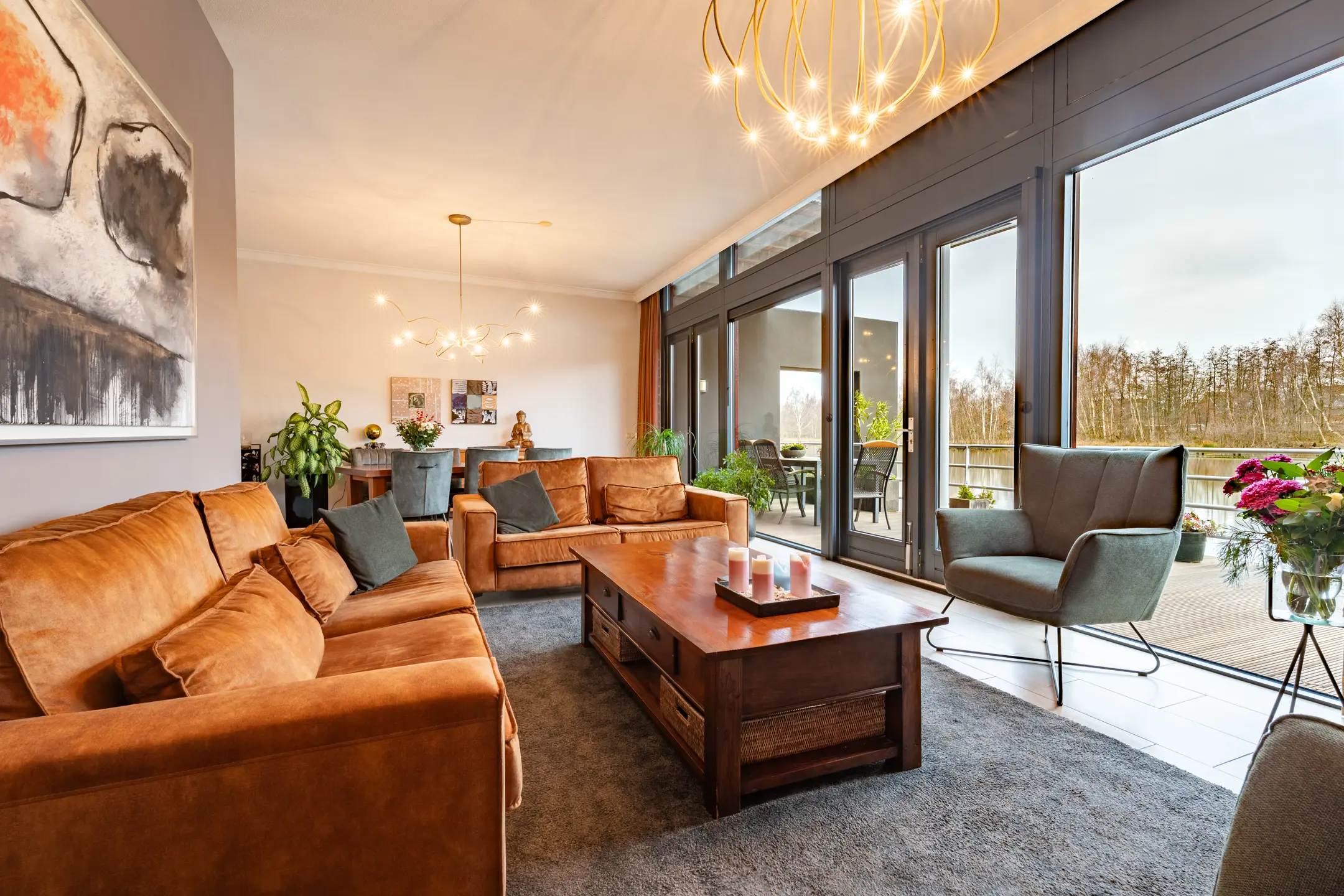 De riante living bevindt zich aan de achterzijde van de woning en is voorzien van grote raampartijen, die voor veel lichtinval zorgen, en dubbele openslaande deuren naar het zonnige terras. Het terras ligt op het zuidwesten en geeft, zoals al eerder vermeld, een vrij uitzicht over water en natuur.