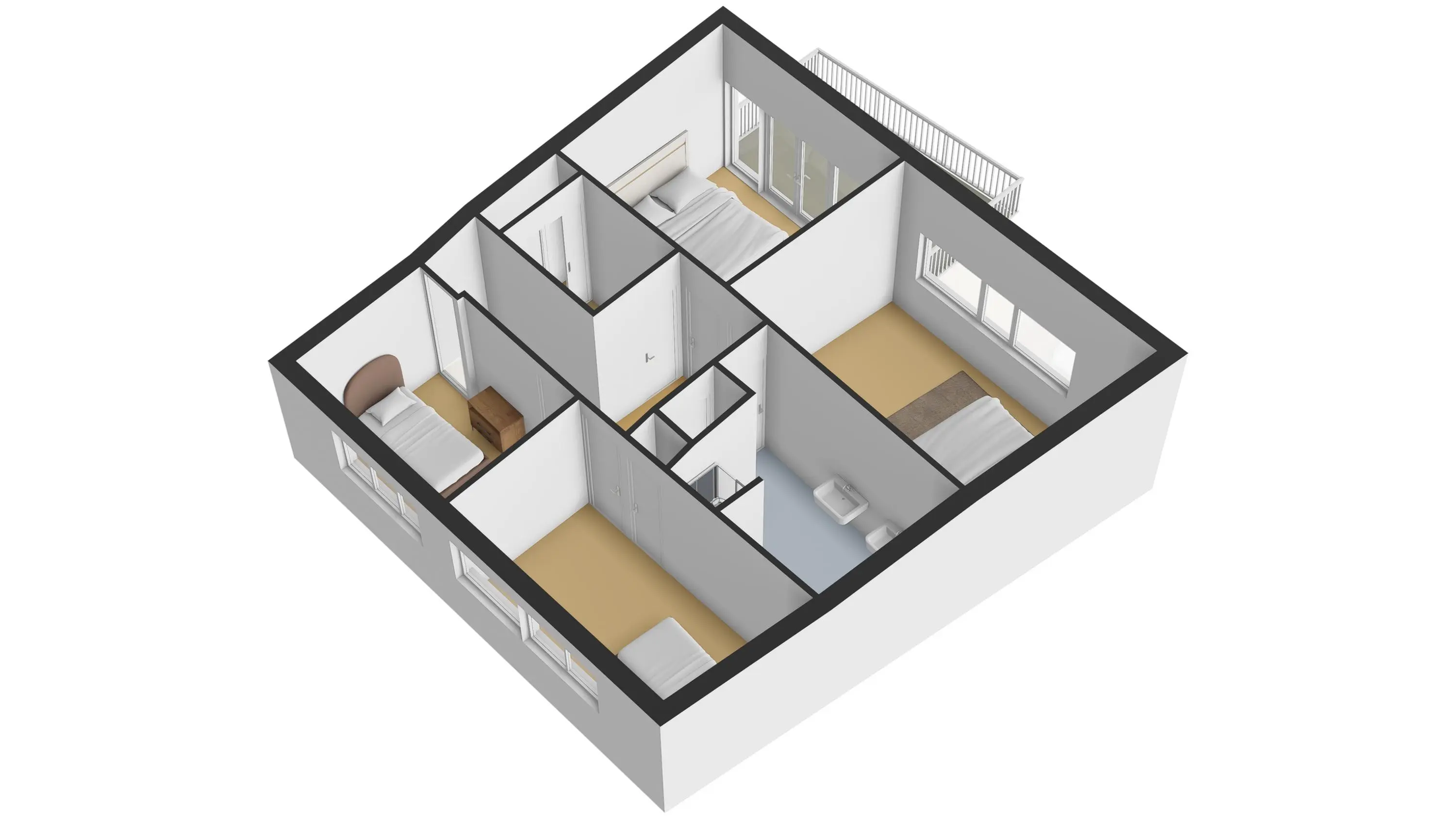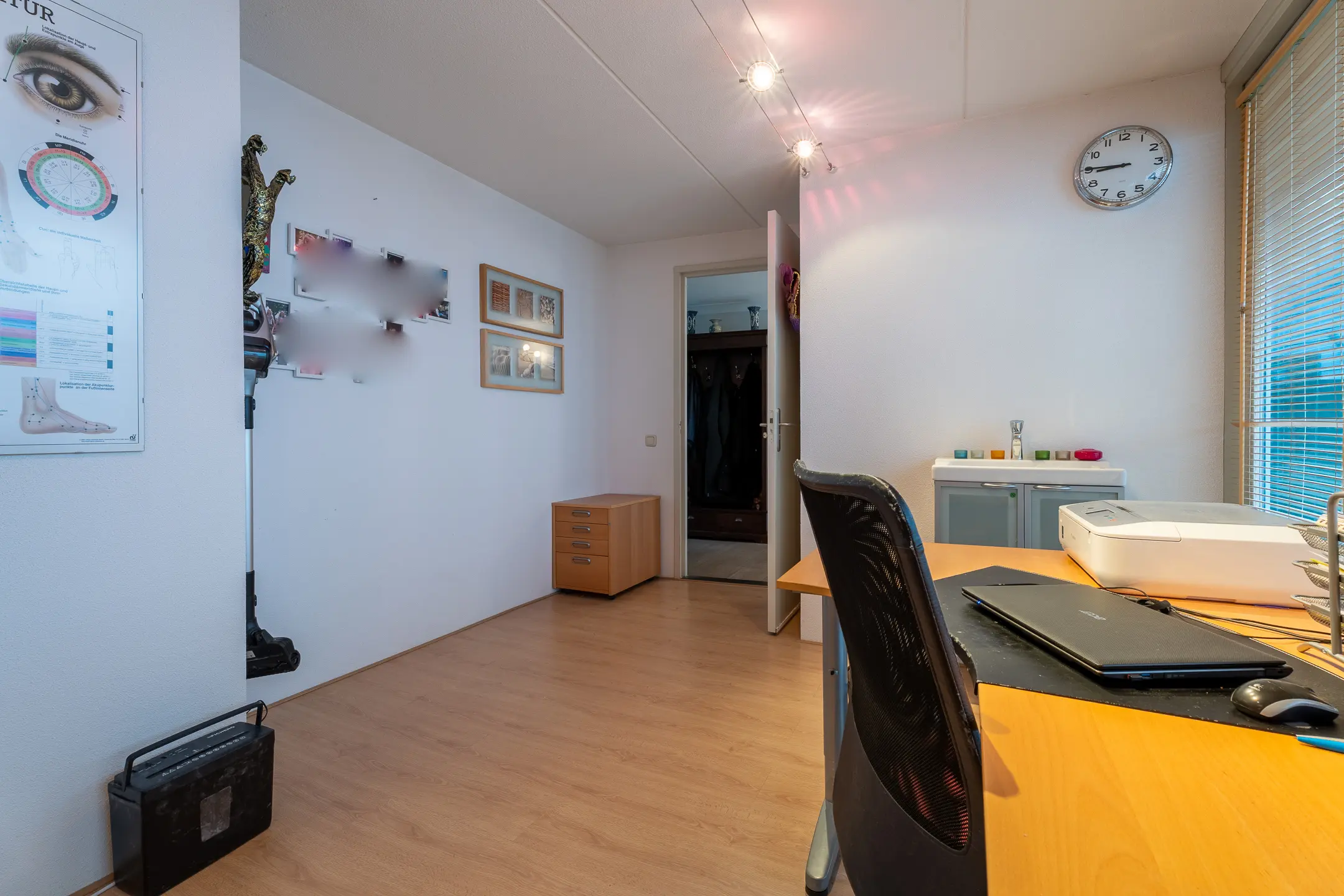 Aan de voorzijde van de woning bevindt zich de eerste slaap-/werkkamer, voorzien van een badmeubel met wastafel. Vanuit deze kamer is de patiotuin bereikbaar.