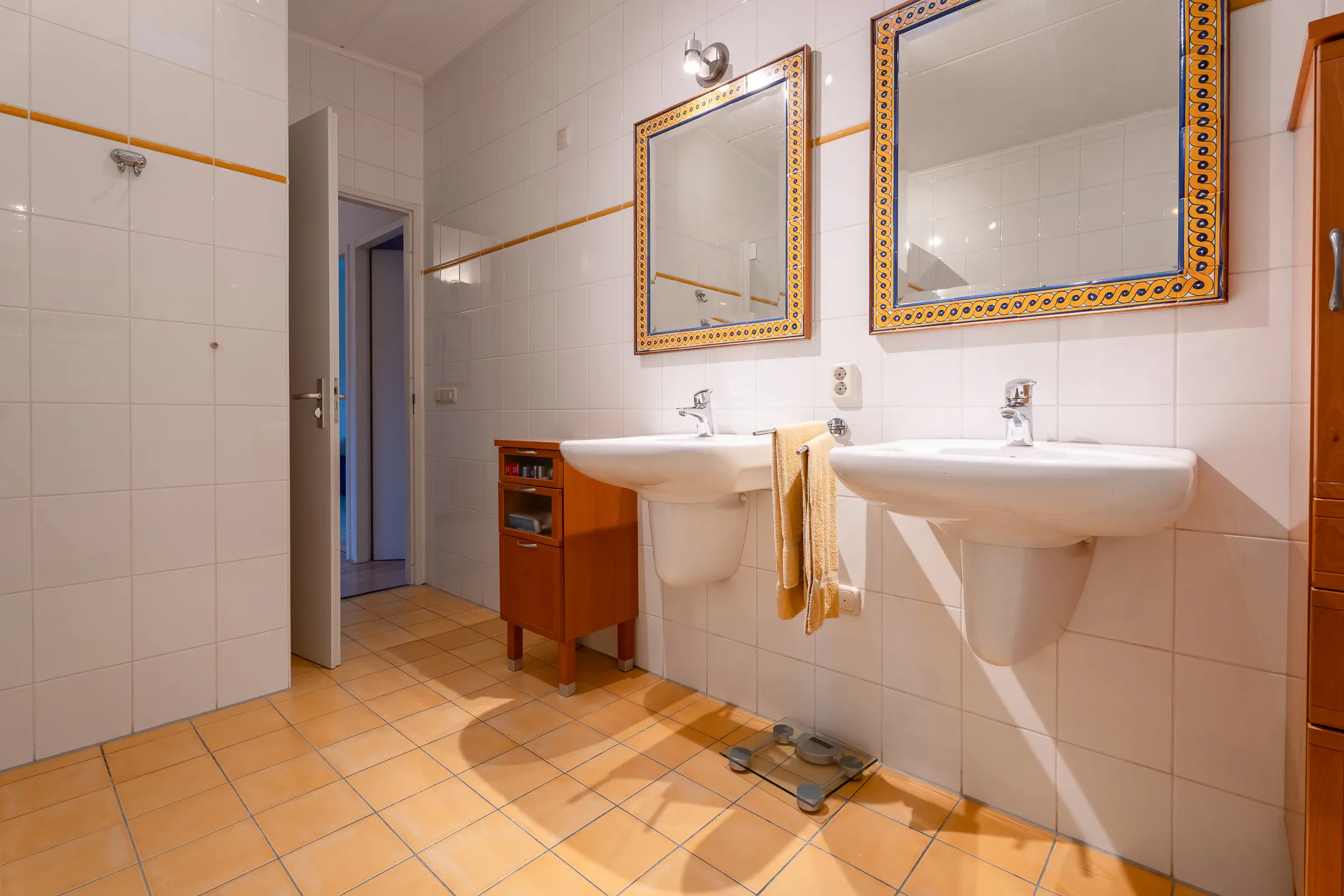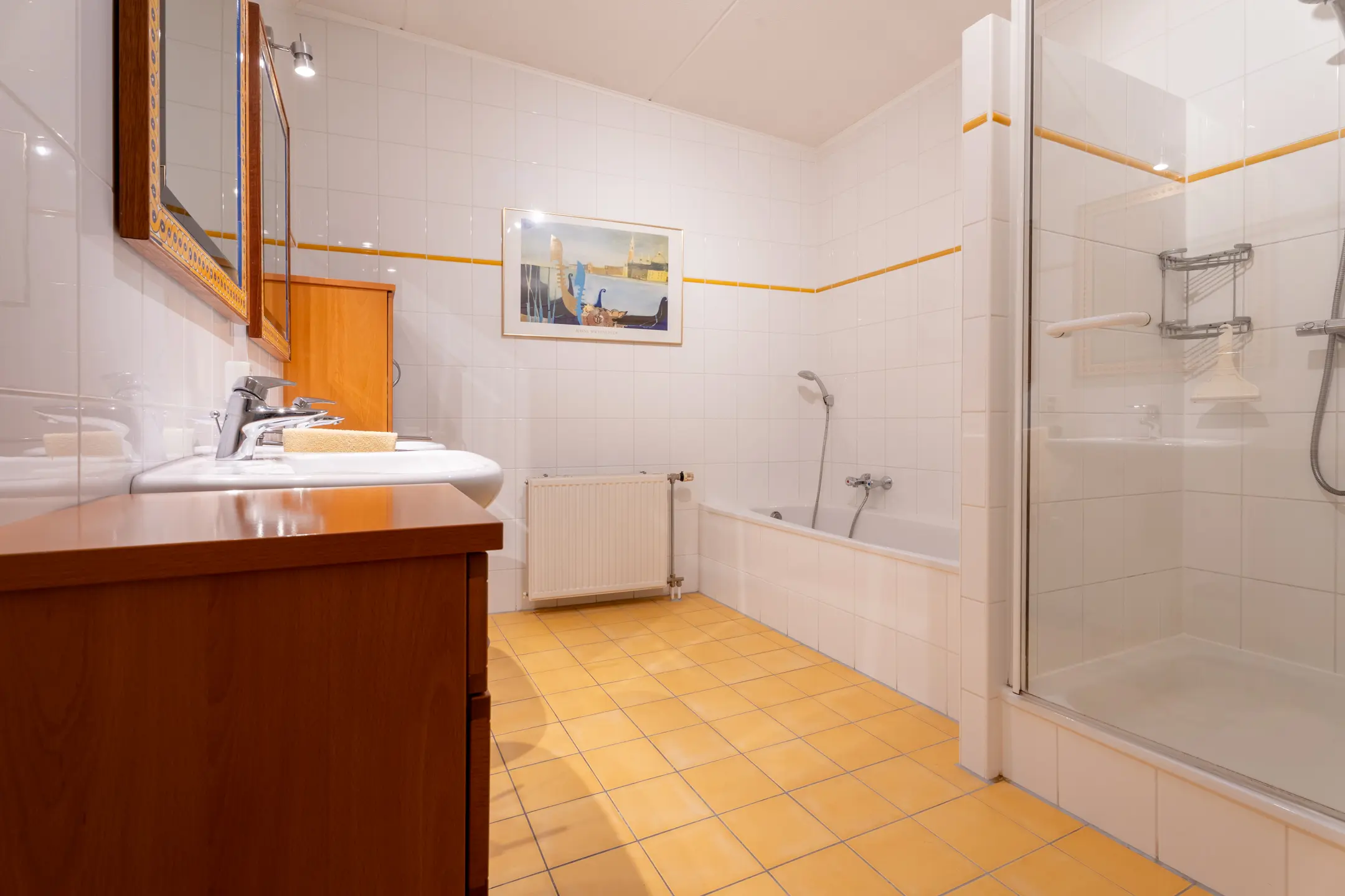 Ruime, volledig betegelde badkamer, ingericht met een ligbad, douche en twee wastafels. De badkamer is voorzien van vloerverwarming.