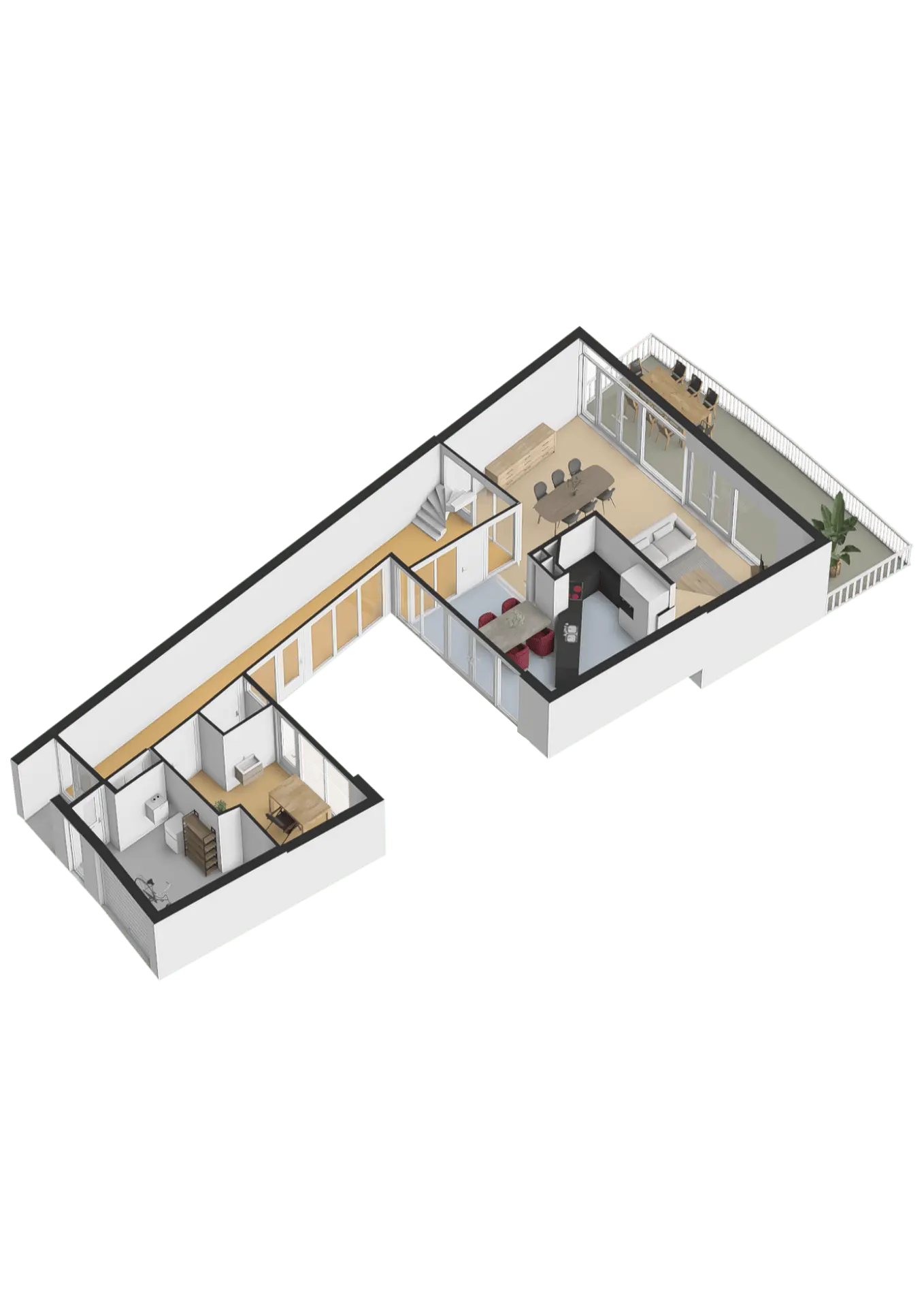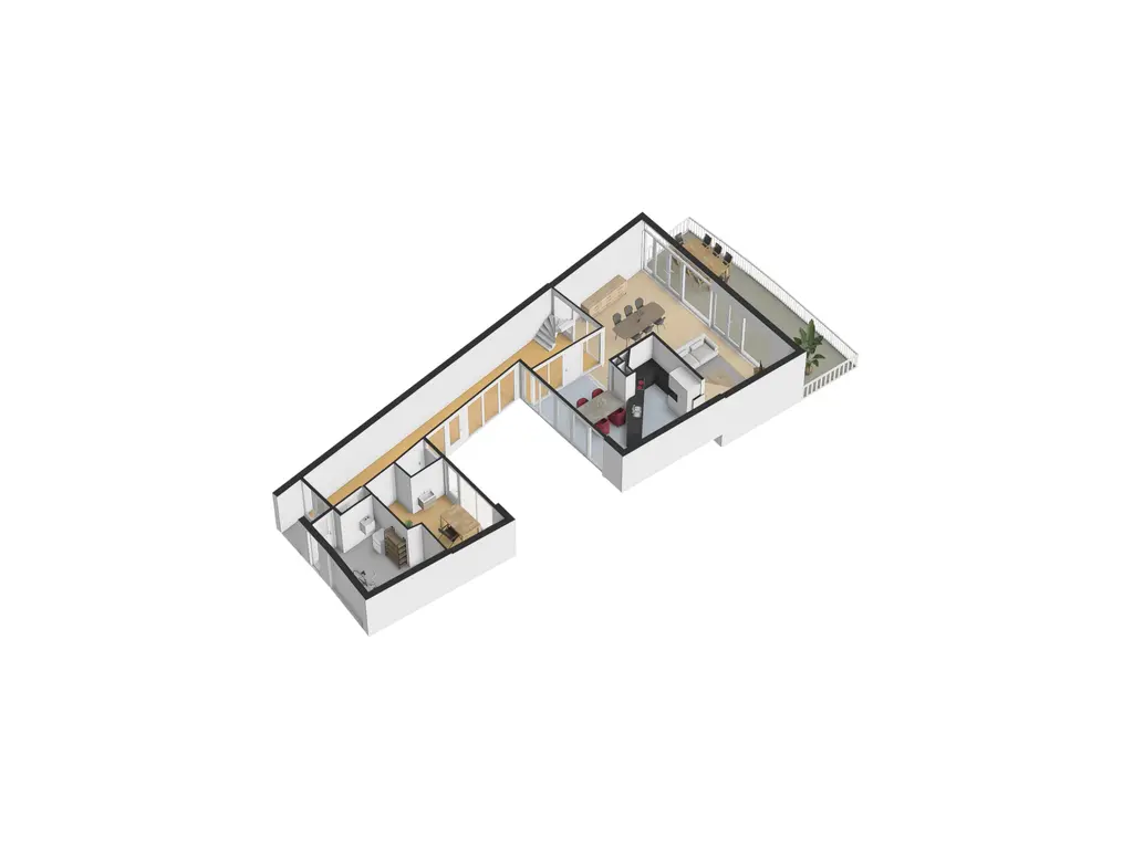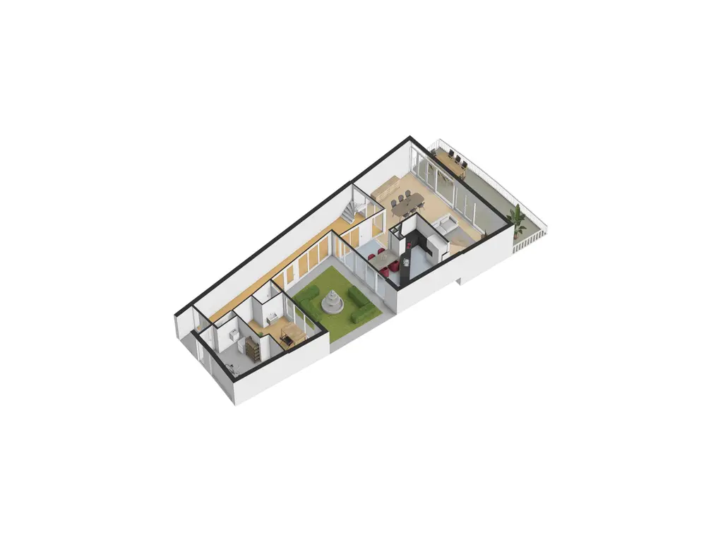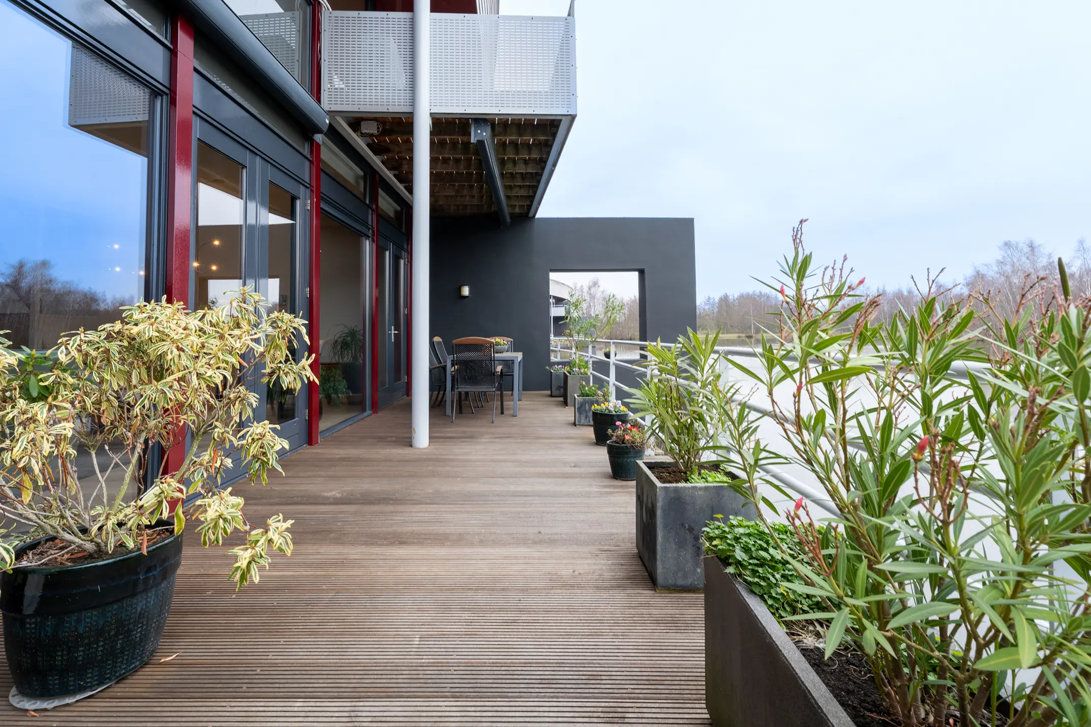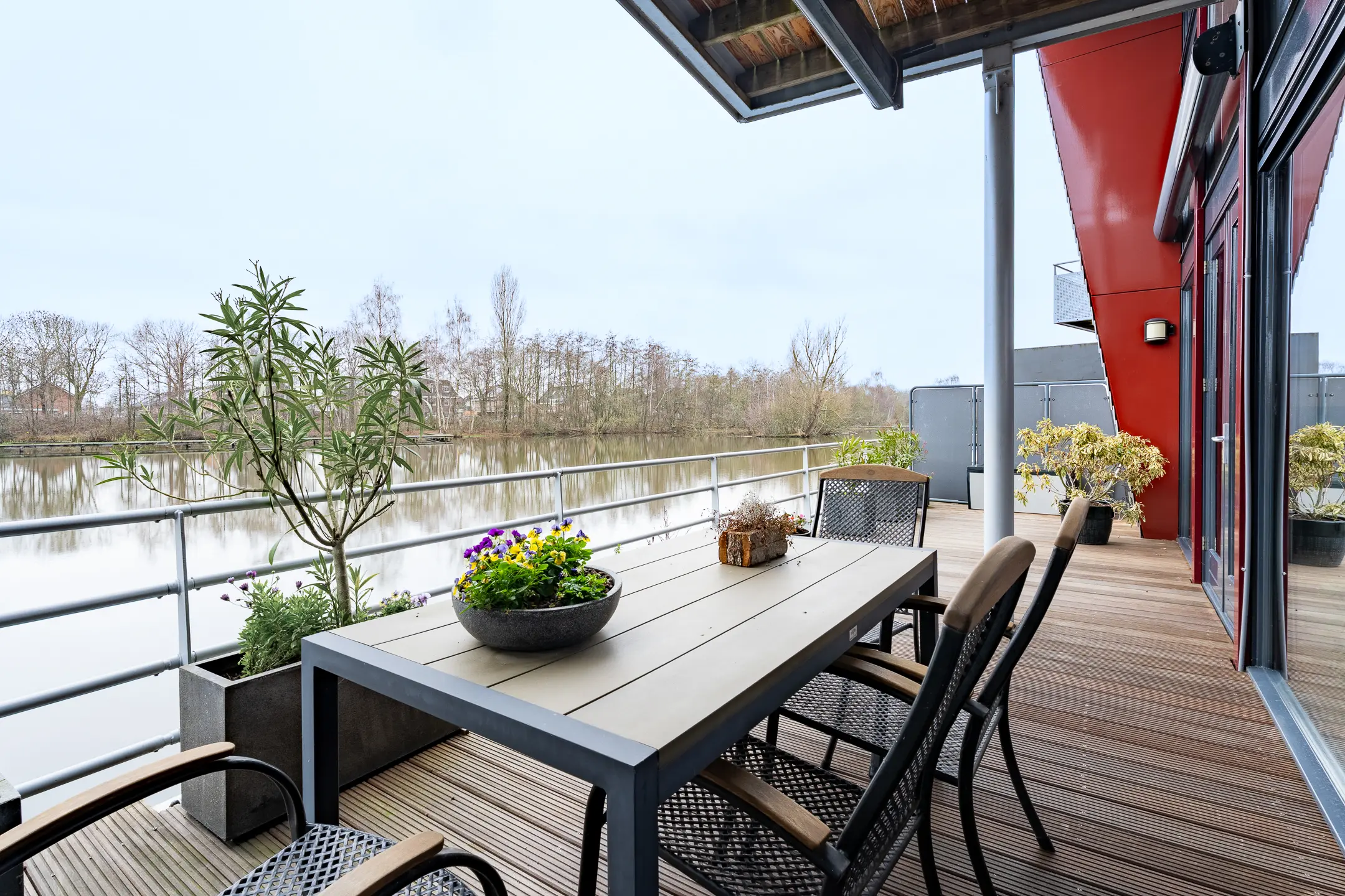 Bij deze woning heb je drie mogelijkheden om buiten te verblijven: het riante terras grenzend aan de woonkamer, de patiotuin die via de werkkamer, gang en woonkeuken bereikbaar is, en een ruim balkon op de eerste verdieping aan de waterkant.