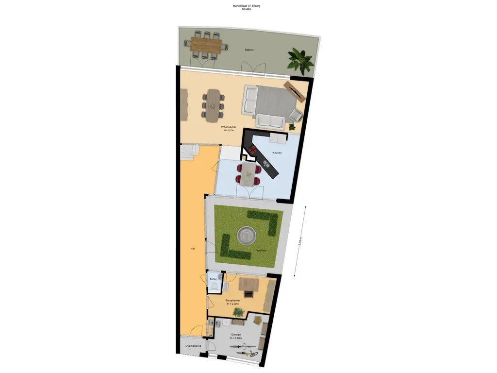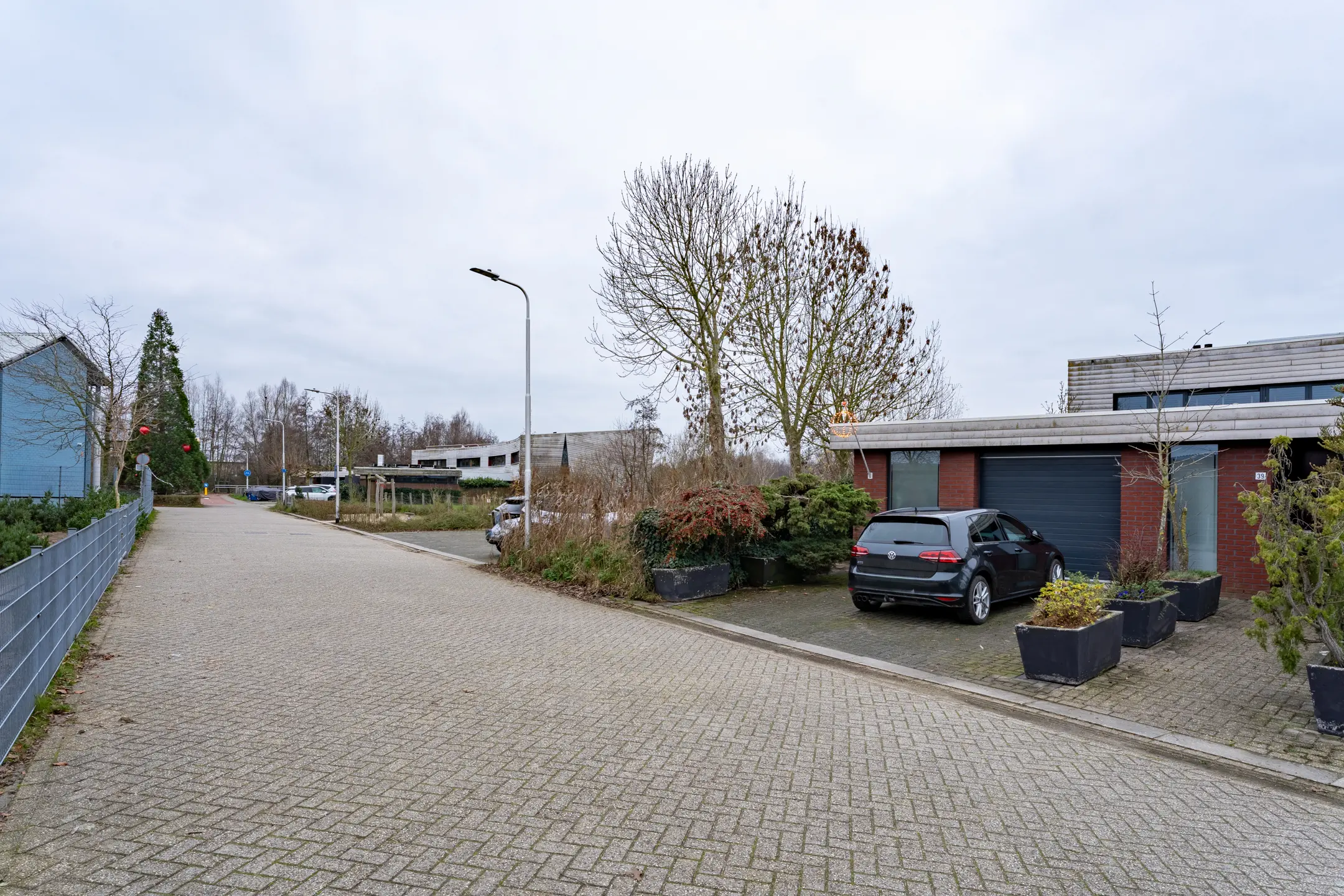 Aan de voorzijde, via de oprit, heb je toegang tot de berging. De voormalige garage is verbouwd tot deze berging en de werk-/slaapkamer op de begane grond. In de berging vind je de opstelling van de warmtepomp en de unit van de stadsverwarming. Vanuit de lange gang heb je toegang tot de patiotuin.
