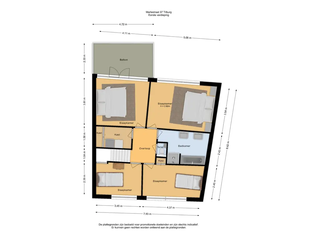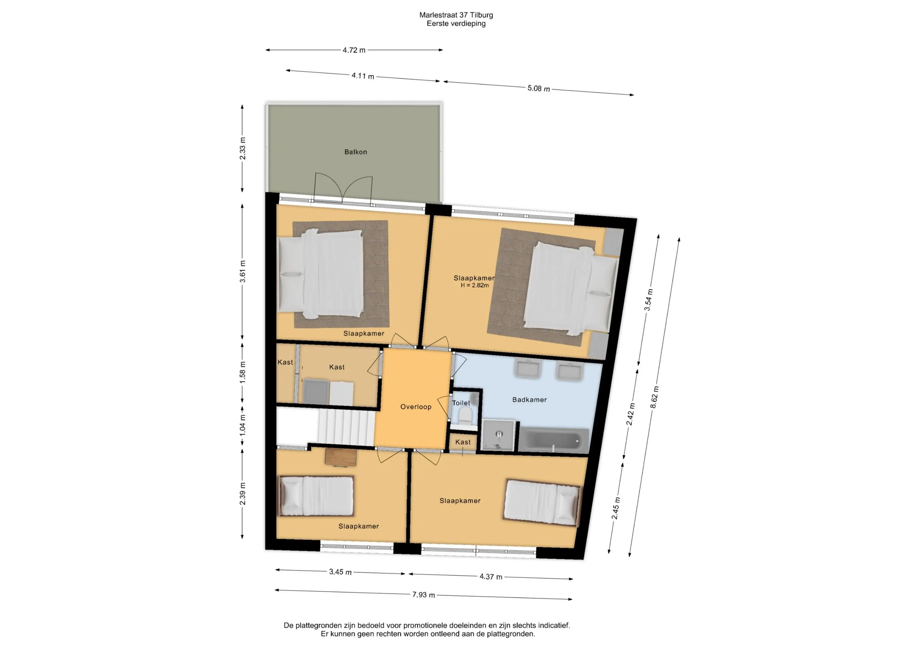 Op de eerste verdieping bevinden zich de overloop, 4 slaapkamers, de badkamer, toiletruimte en een bergruimte. De bergruimte is voorzien van de aansluiting ten behoeve van wasapparatuur, opstelling boiler (via stadsverwarming) en een kastenwand. De toiletruimte is deels betegeld en voorzien van een zwevend toilet en een fonteintje.